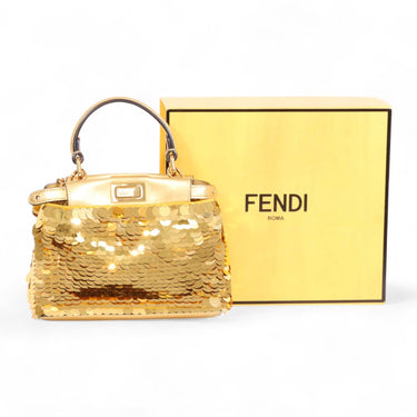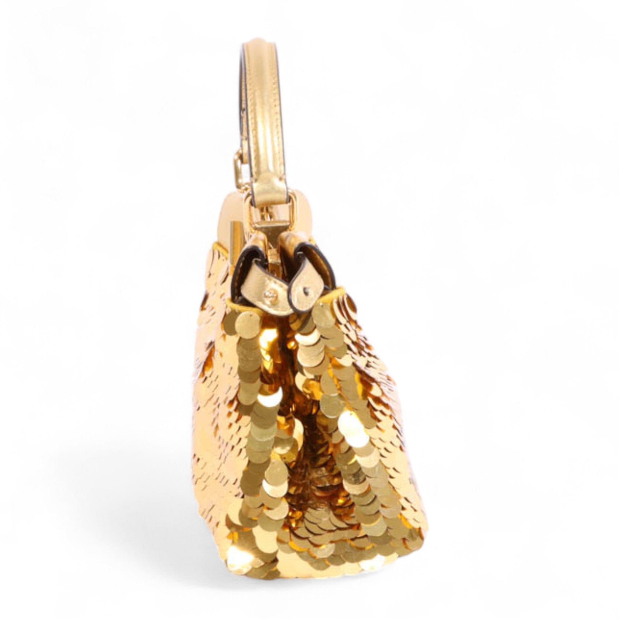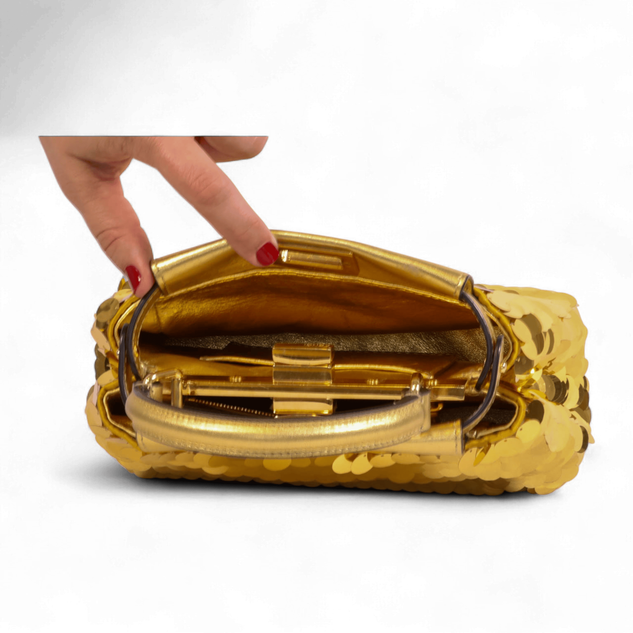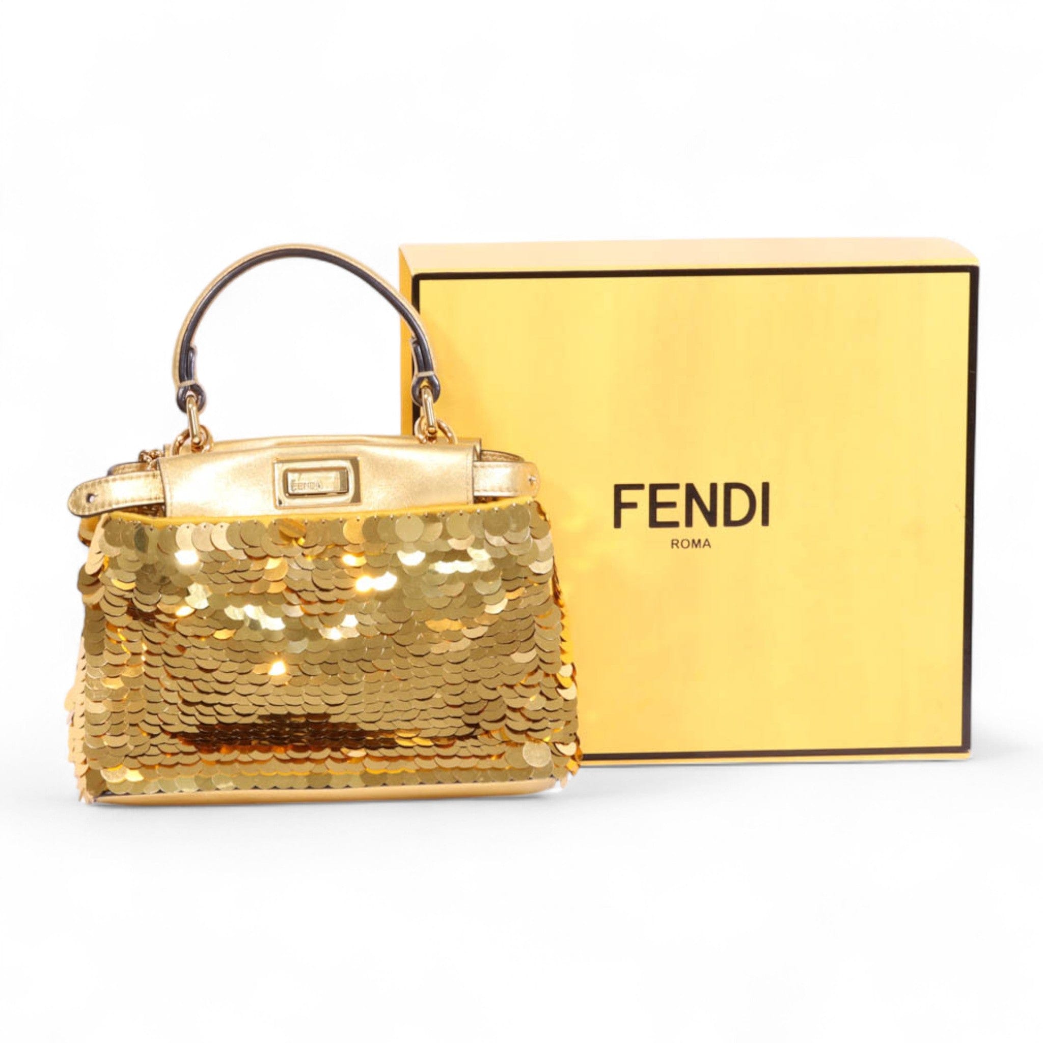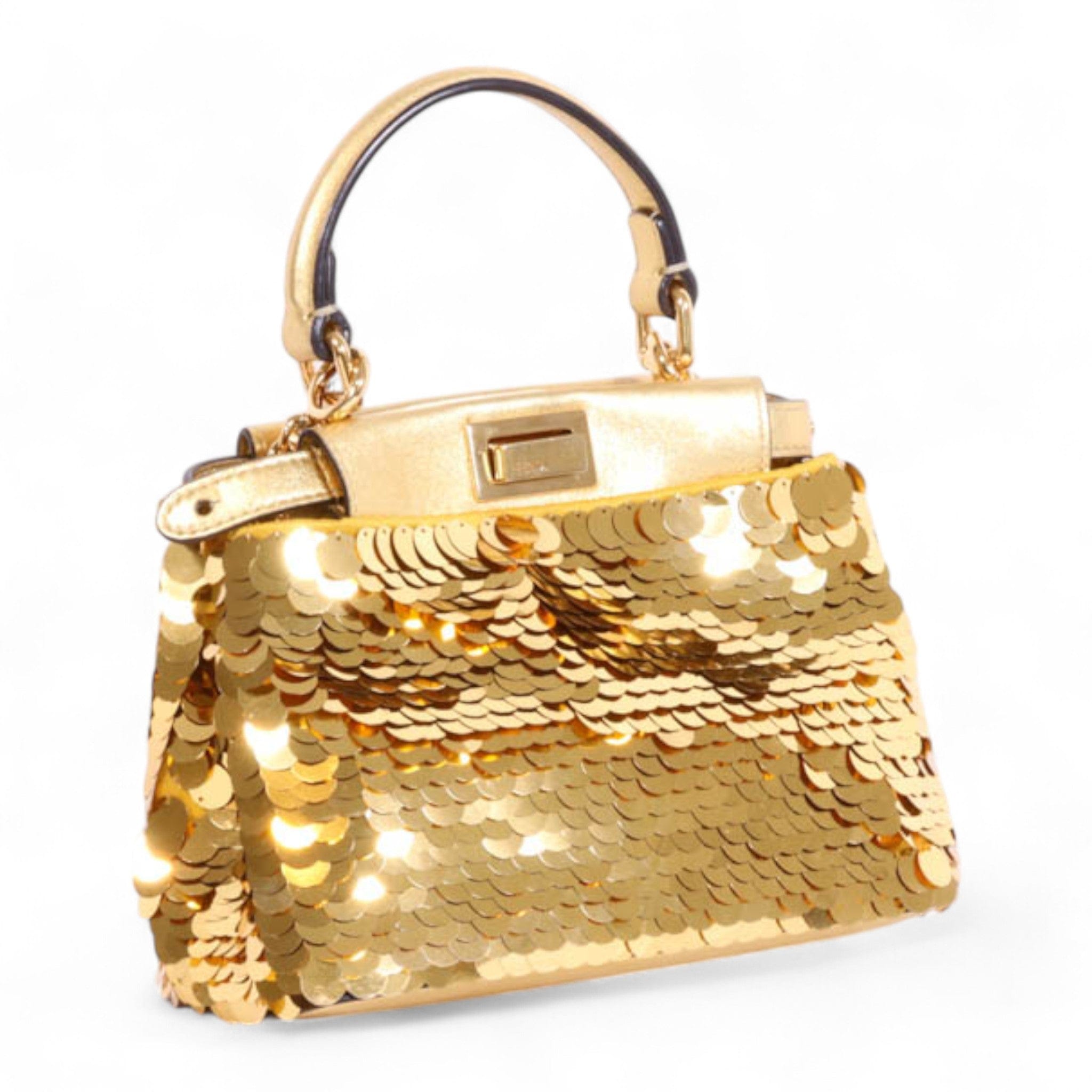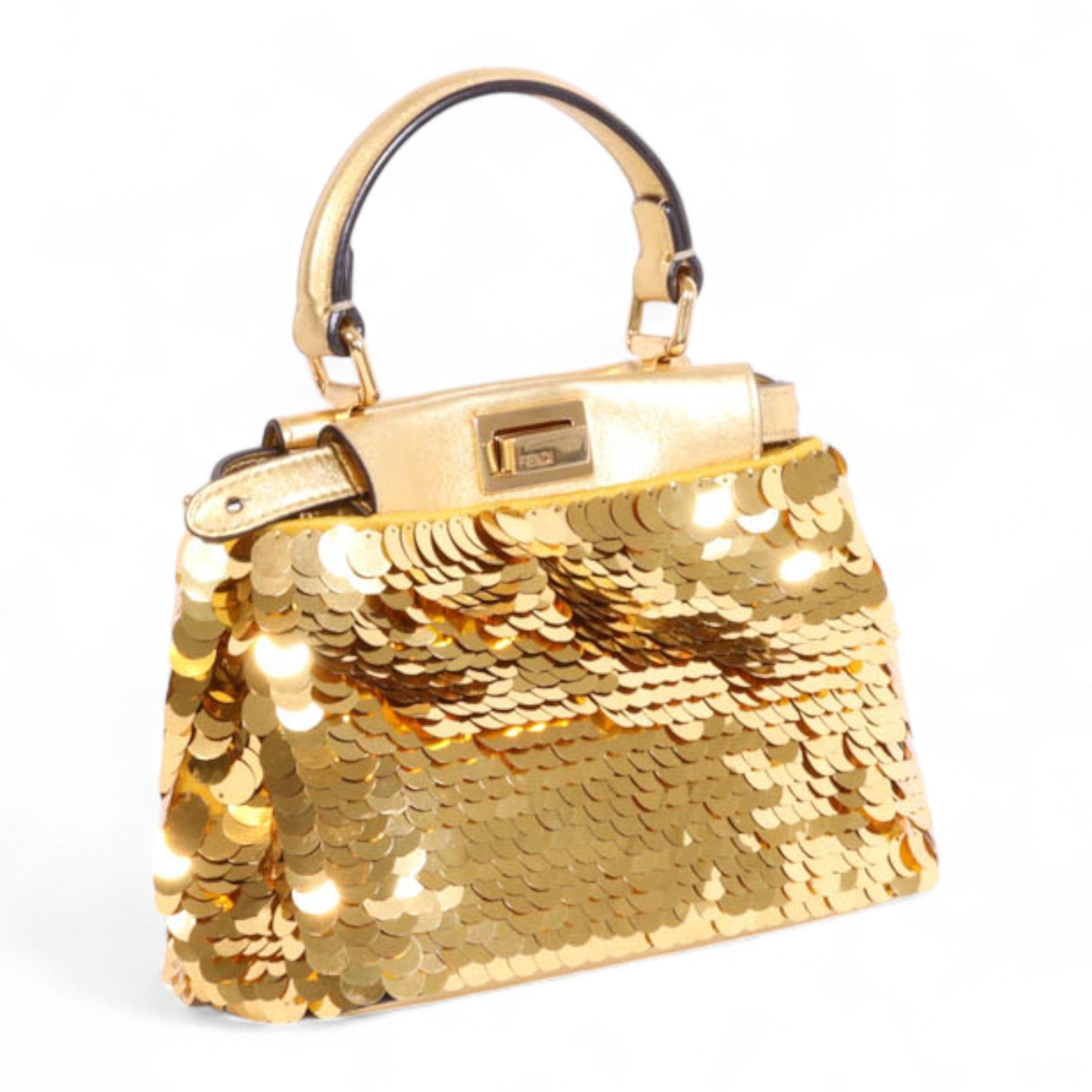 Discover luxury with the Fendi Paillette Peekaboo Mini in stunning gold. This exquisite handbag combines Fendi's classic Peekaboo silhouette with a mesmerizing sequin finish that captures the light perfectly. Crafted with precision, it features a structured top handle and a detachable shoulder strap for versatile styling. Inside, you'll find a well-organized interior, ideal for securing your essentials with elegance. The gold-tone hardware adds a touch of glamour, making it the perfect accessory for special occasions or to elevate your everyday look. Shine with sophistication with this standout piece from Fendi.