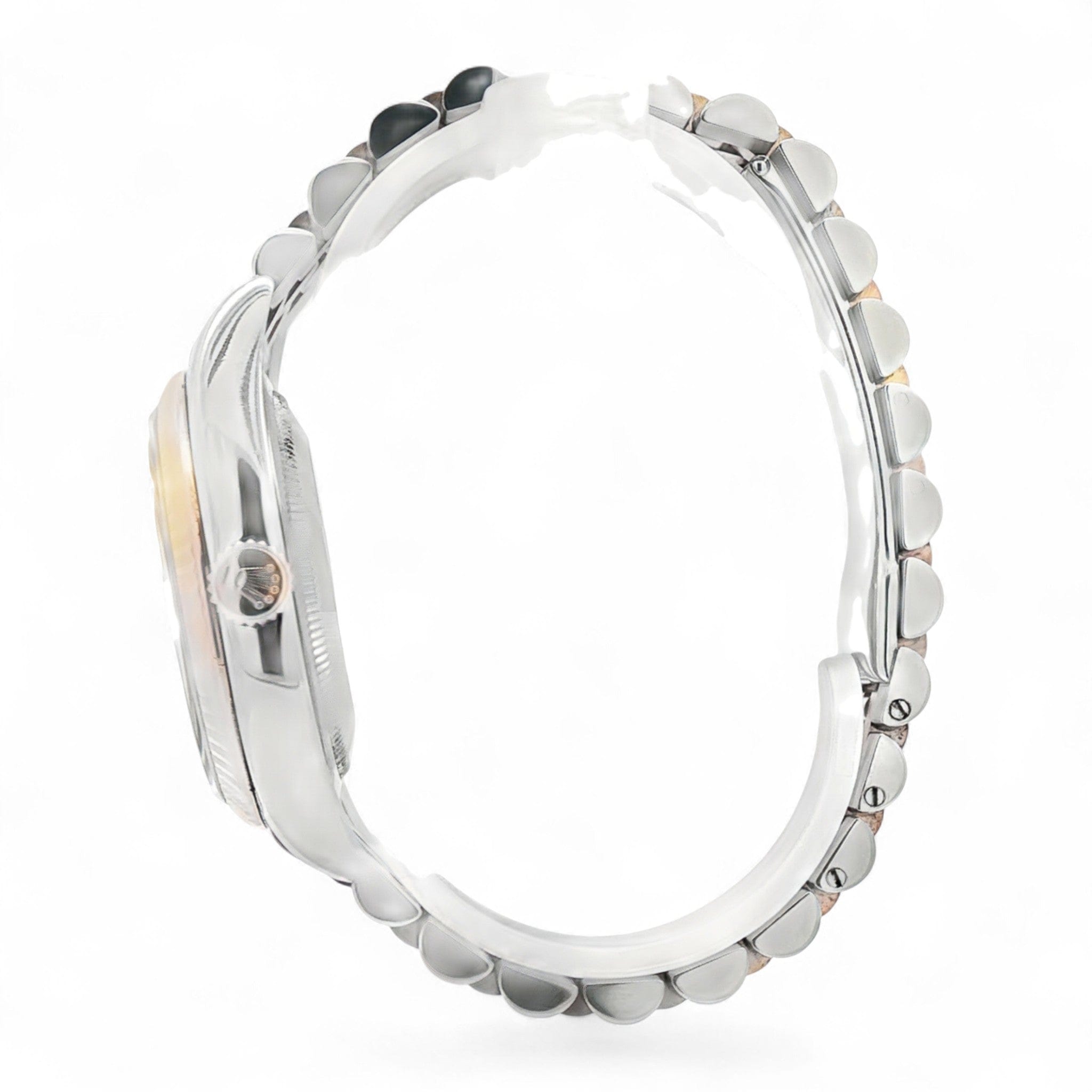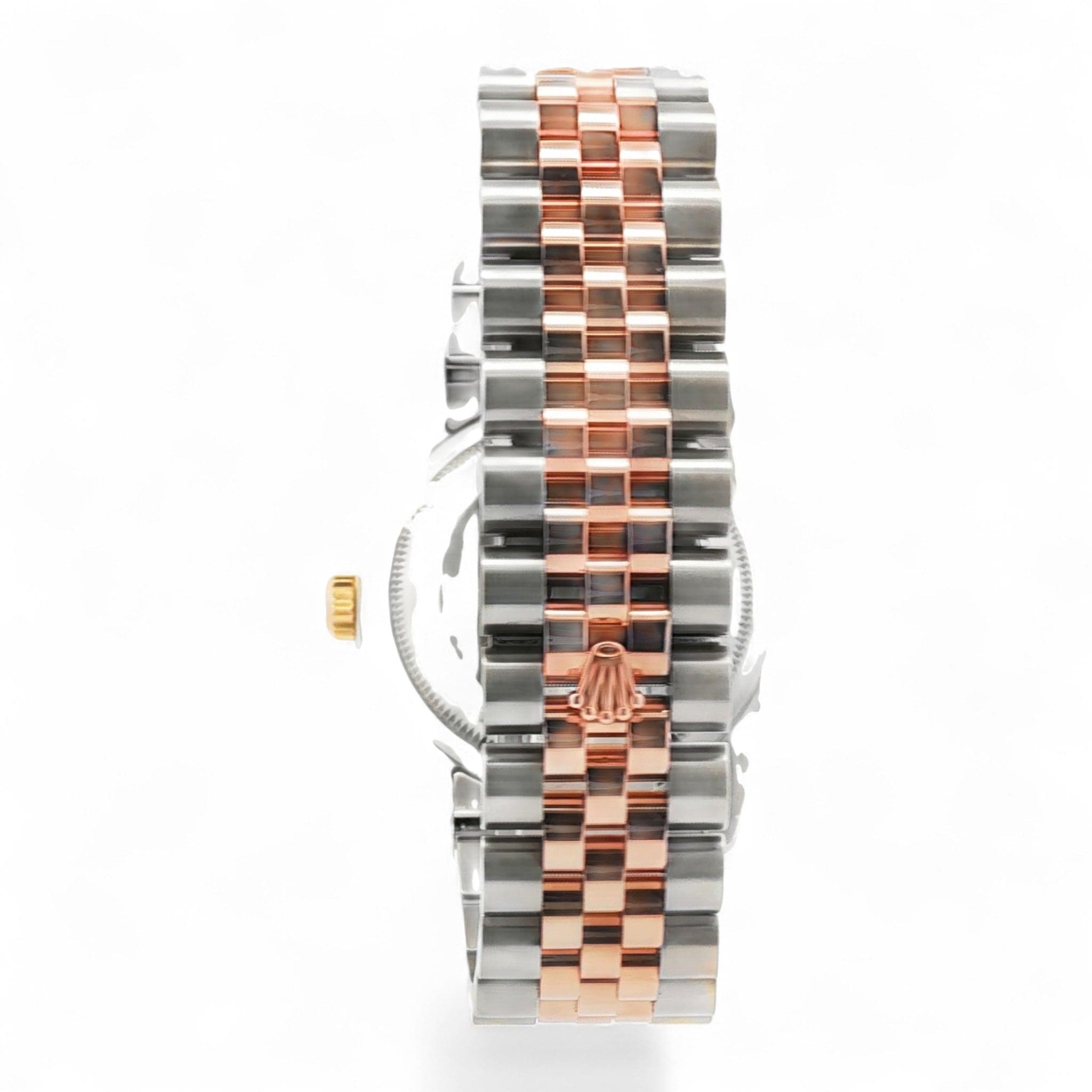The elegant Rolex Datejust watch features a sophisticated two-tone design, combining stainless steel and rose gold for a luxurious yet versatile look. Its soft pink dial is accented with gold hour markers and hands, complemented by a date window at 3 o'clock with a magnifying Cyclops lens for easy reading. The fluted bezel adds a touch of classic refinement, while the Jubilee bracelet ensures a comfortable and stylish fit. Crafted for precision and style, this timepiece embodies timeless luxury and exceptional craftsmanship—perfect for elevating any wardrobe. Reference #116231
