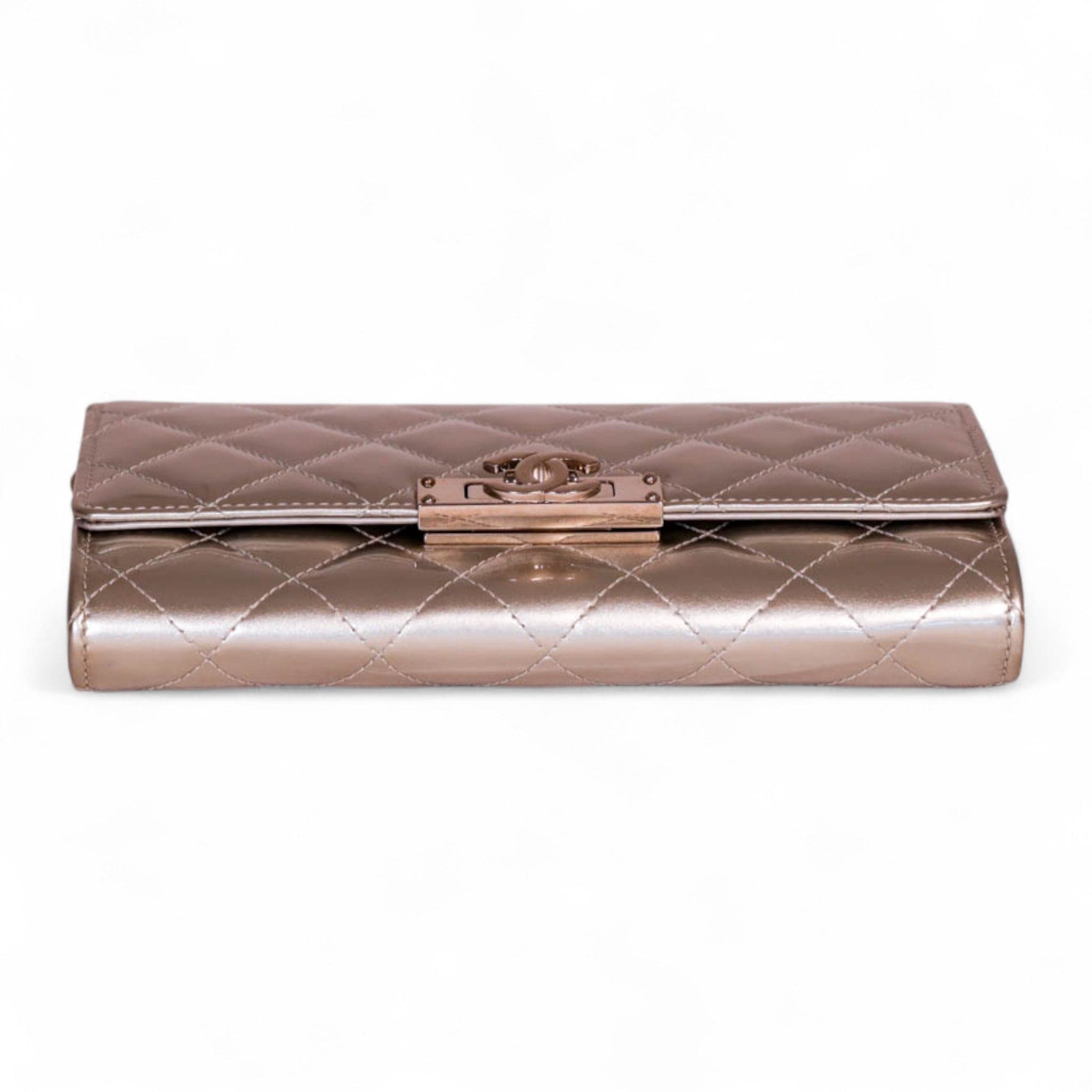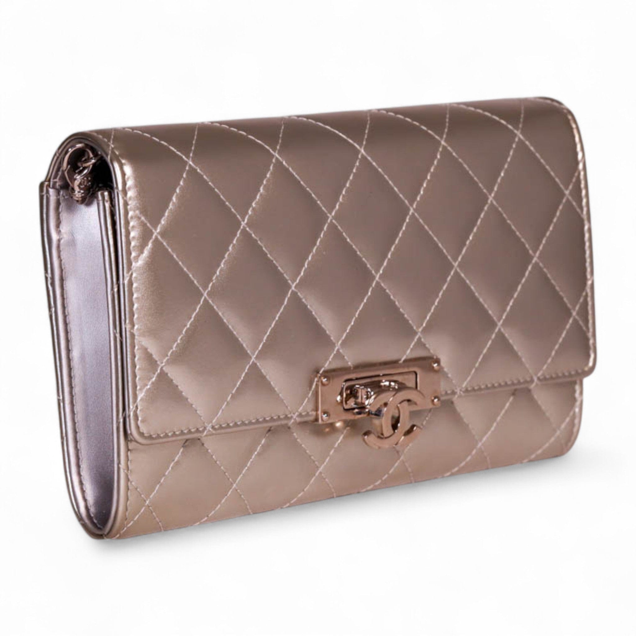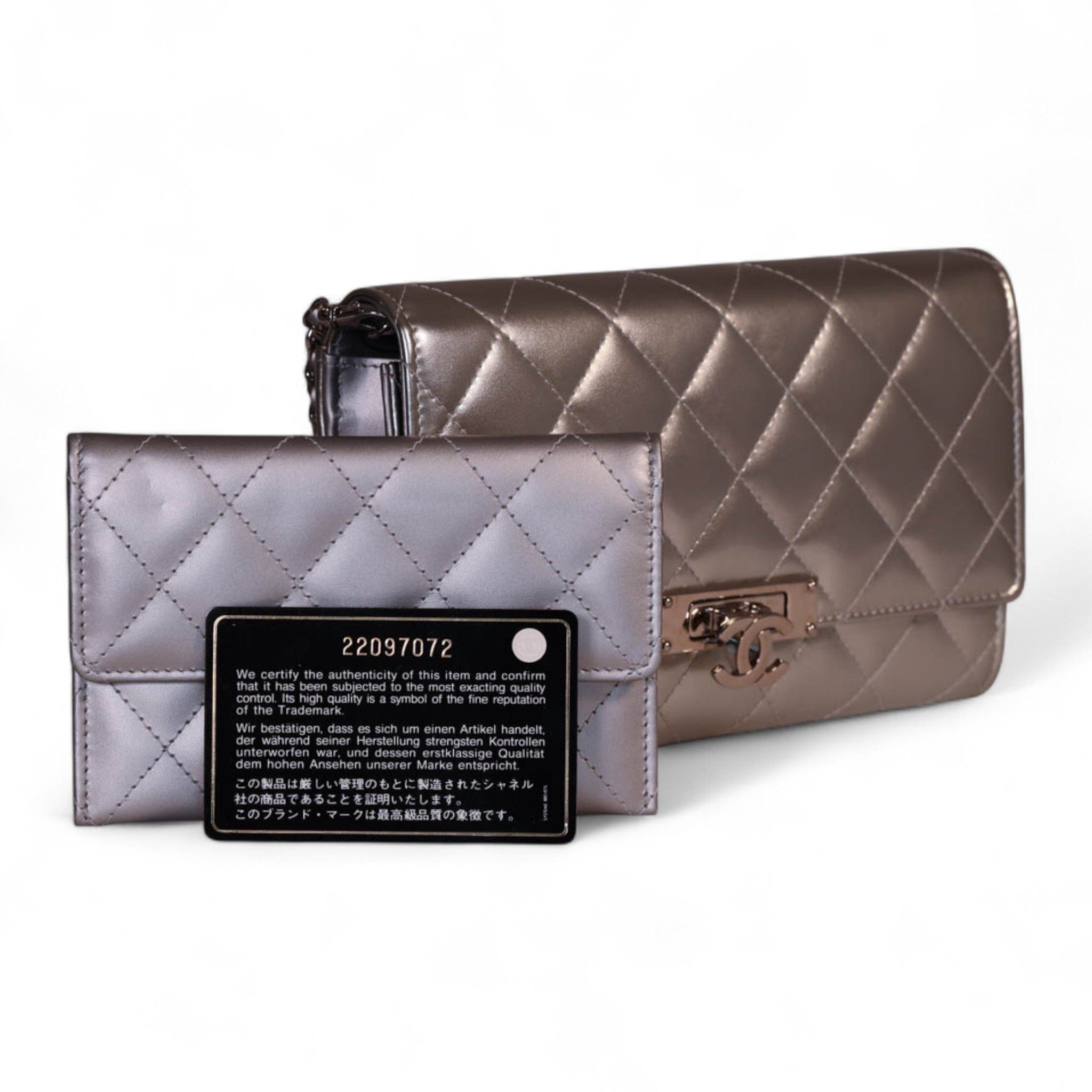 Elevate your accessories collection with this exquisite Chanel Silver Diamond Lattice Leather Chain Shoulder Bag. Crafted from sleek patent leather in a stunning silver color, this luxurious bag features a sophisticated lattice design that adds a touch of elegance and modernity. The chain shoulder strap beautifully complements the overall aesthetic, providing both style and versatility for day or evening wear.