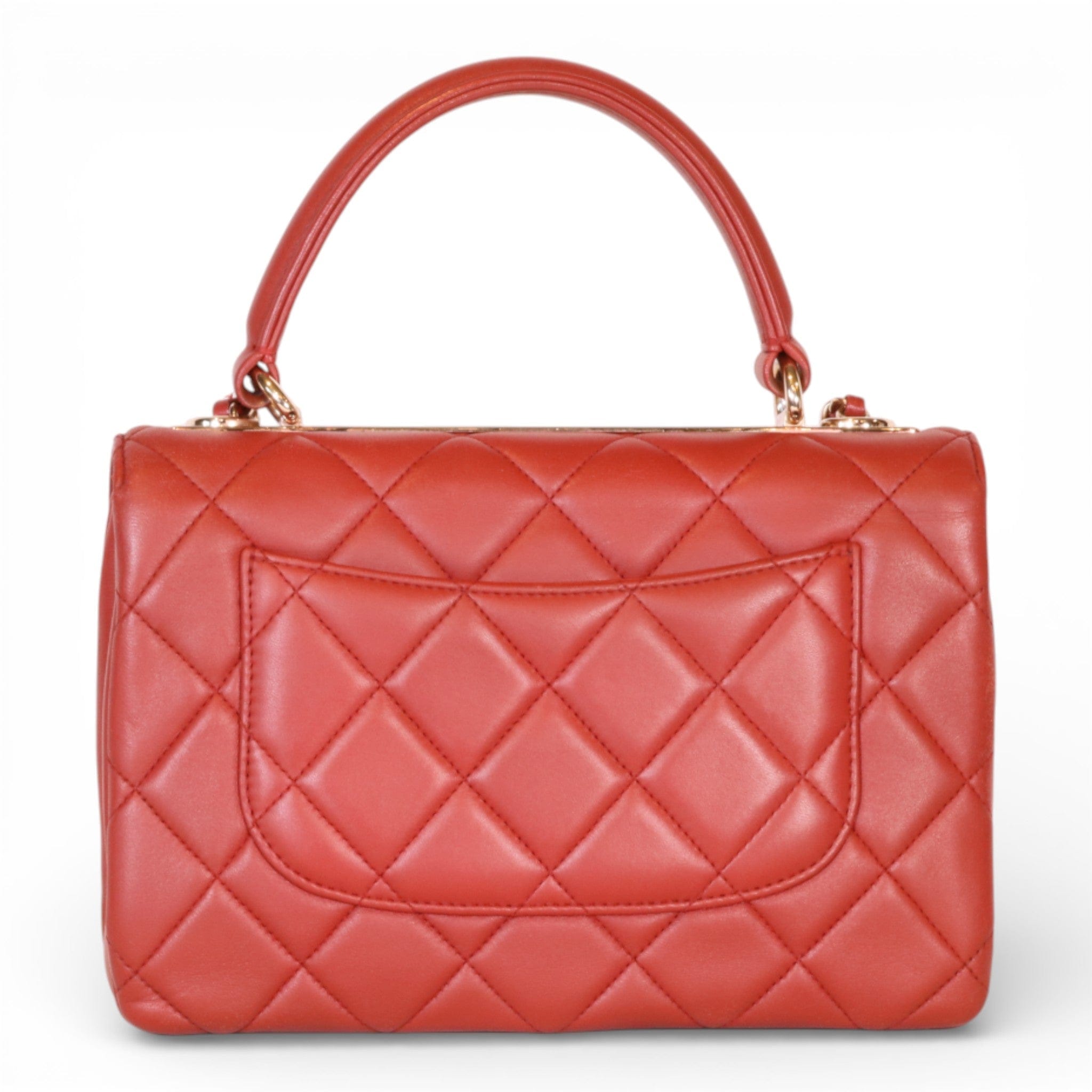 Elevate your collection with this exquisite pre-owned Chanel Trendy CC Flap Bag in striking red lambskin. Crafted with meticulous attention to detail, this small silhouette features the iconic CC turn-lock closure and lustrous gold-tone hardware that epitomizes timeless luxury. In pristine condition, this coveted piece arrives complete with its original dust bag and box—a testament to its impeccable provenance. The supple lambskin leather and refined proportions make it an ideal companion for both refined everyday moments and special occasions. A sophisticated investment for the discerning collector.