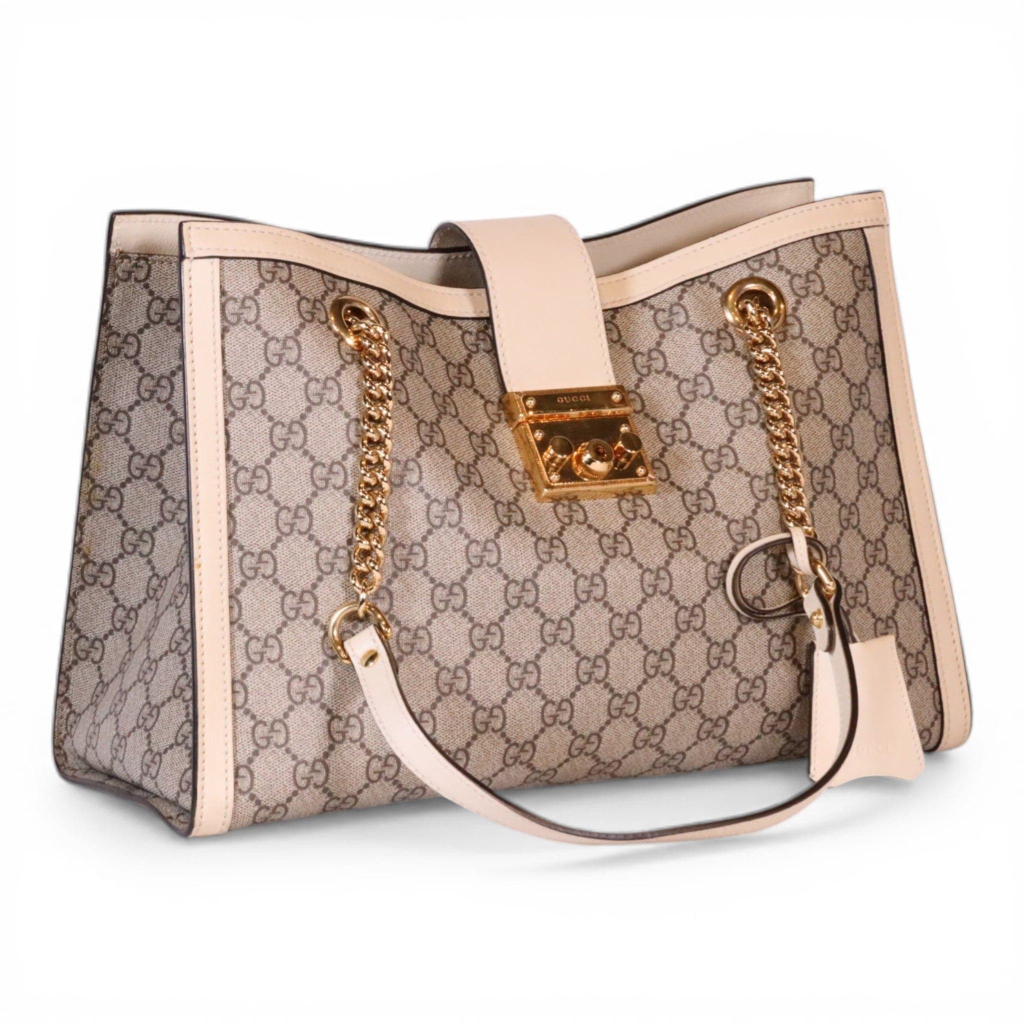 Elevate your collection with this pre-owned Gucci GG Supreme Monogram Medium Padlock Tote in white. Crafted from signature canvas and leather, this iconic tote showcases the recognizable GG monogram and padlock hardware. In good condition with minor scratches on the hardware and a light stain on the leather, it retains its timeless appeal and functionality. Includes the original dust bag for storage and protection.