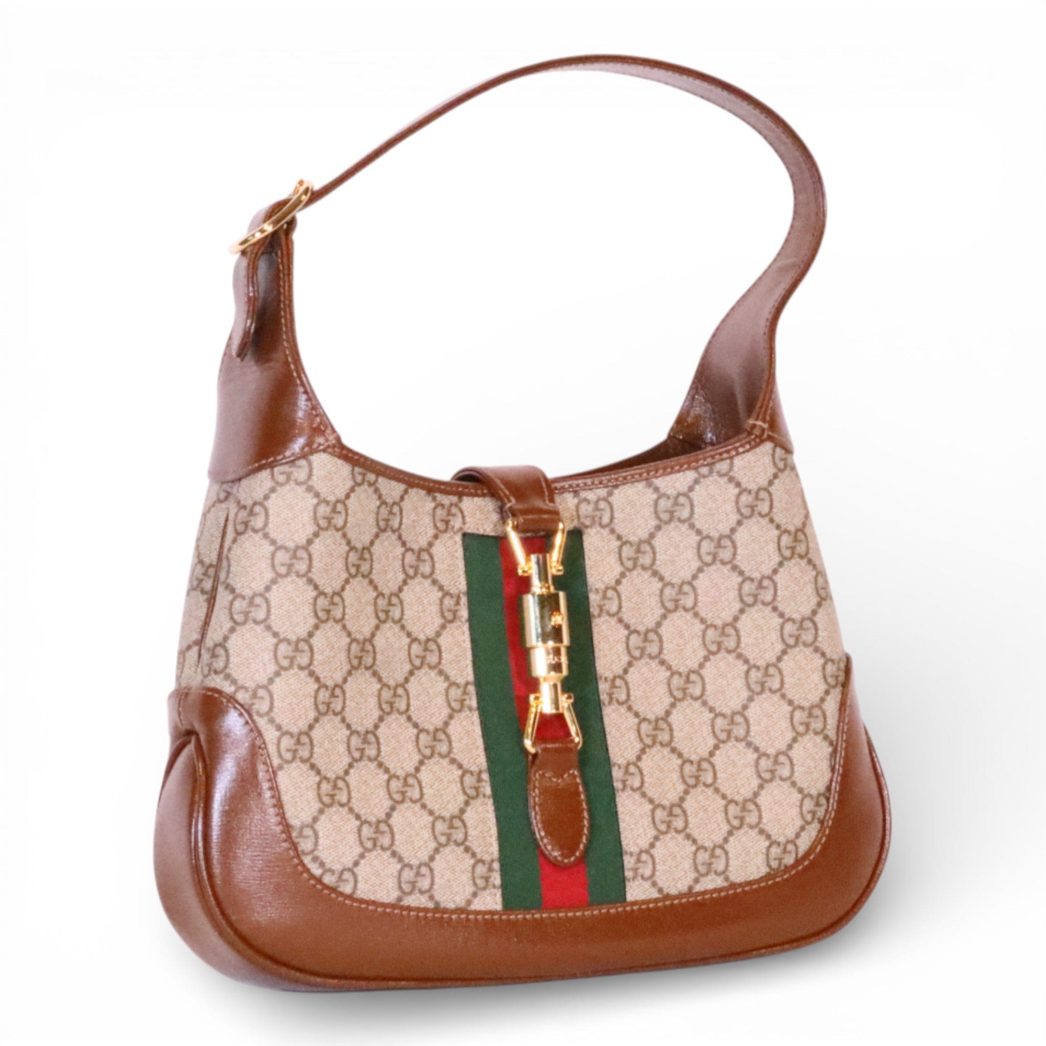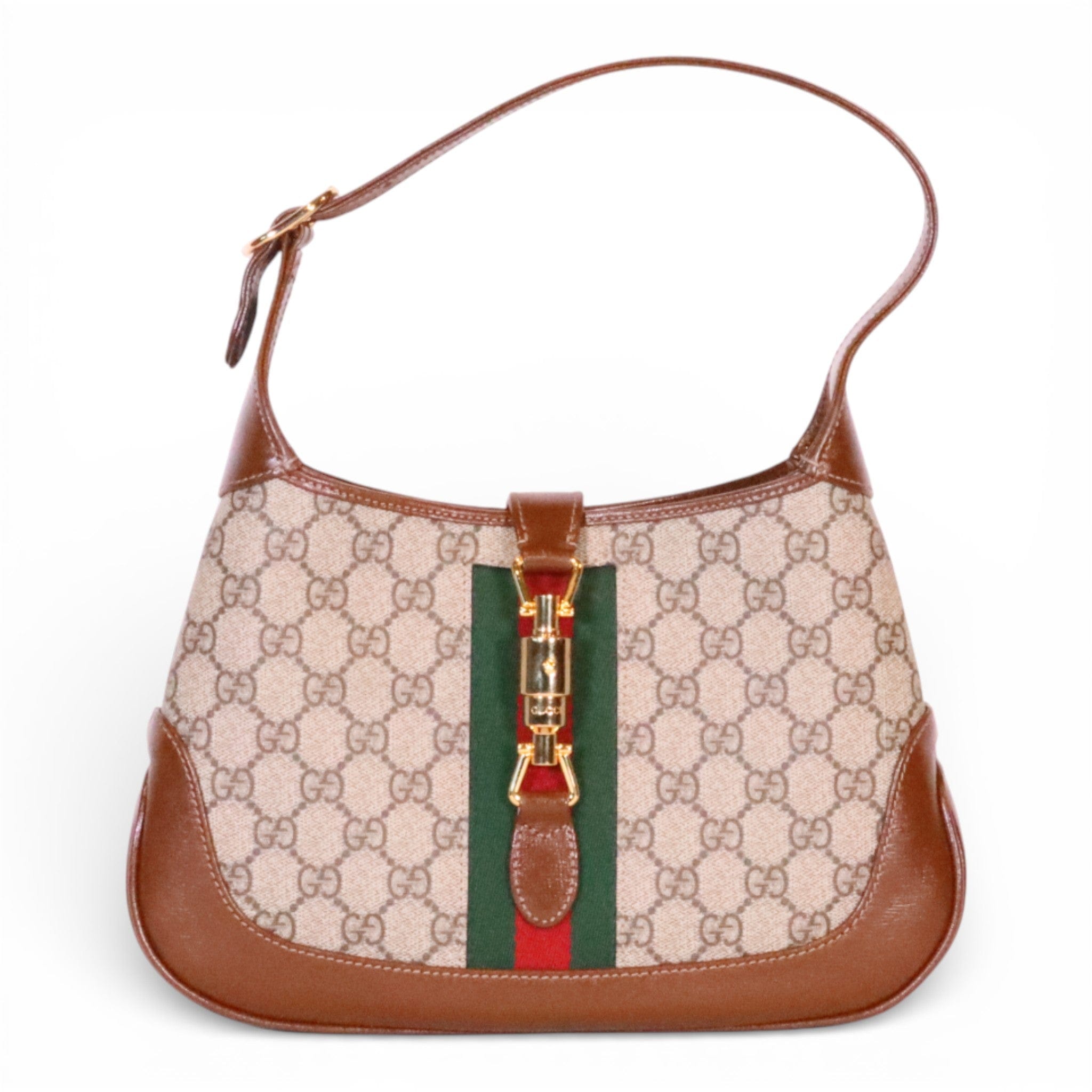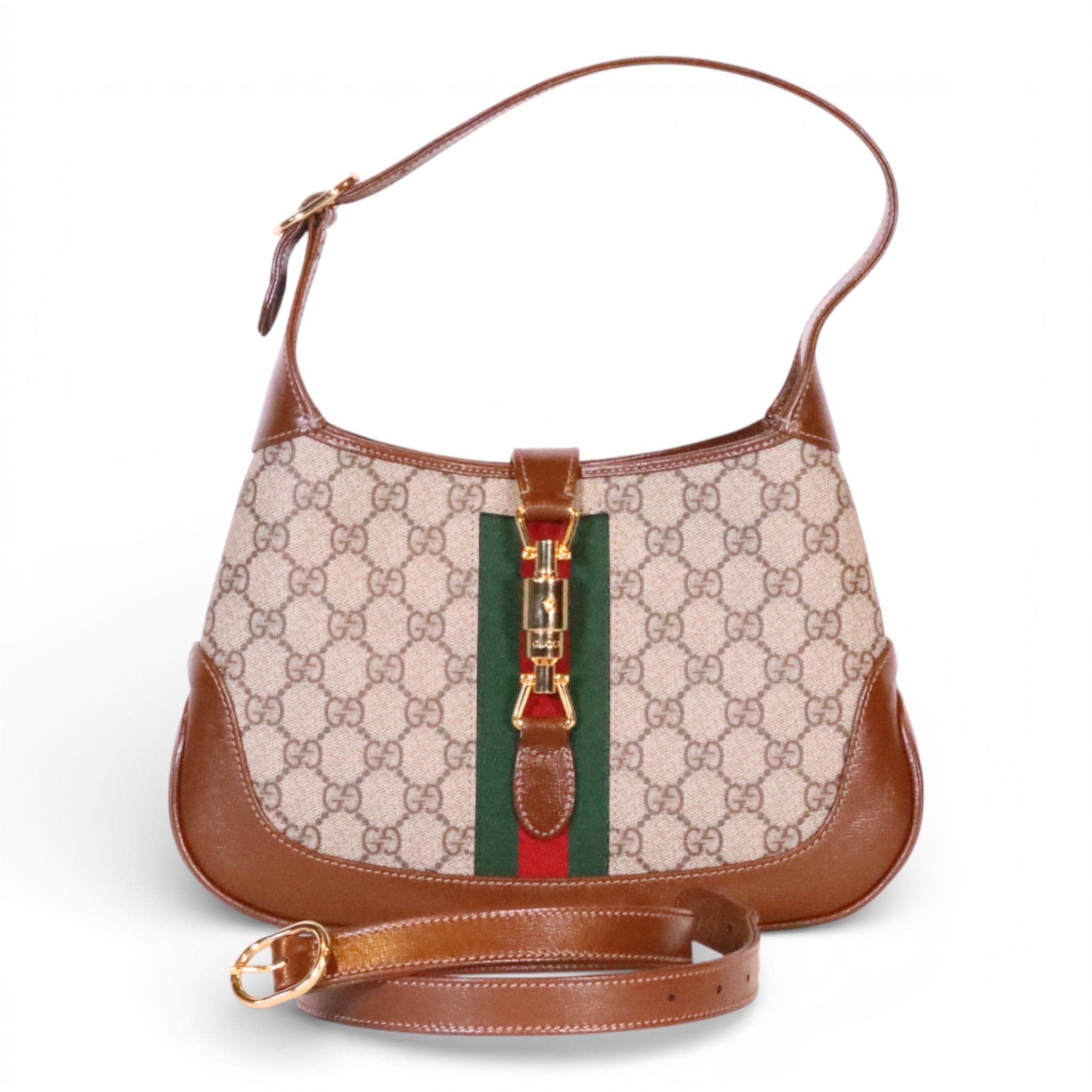 This pre-owned Gucci Jackie 1961 Small Shoulder Bag showcases the iconic GG Supreme Canvas in excellent condition. The timeless silhouette features the brand's signature craftsmanship with its structured shape and refined hardware. Includes a crossbody extender strap for versatile styling options—wear it as a shoulder bag or adjust for crossbody carry. A coveted piece for the discerning collector seeking authentic luxury with character and history.