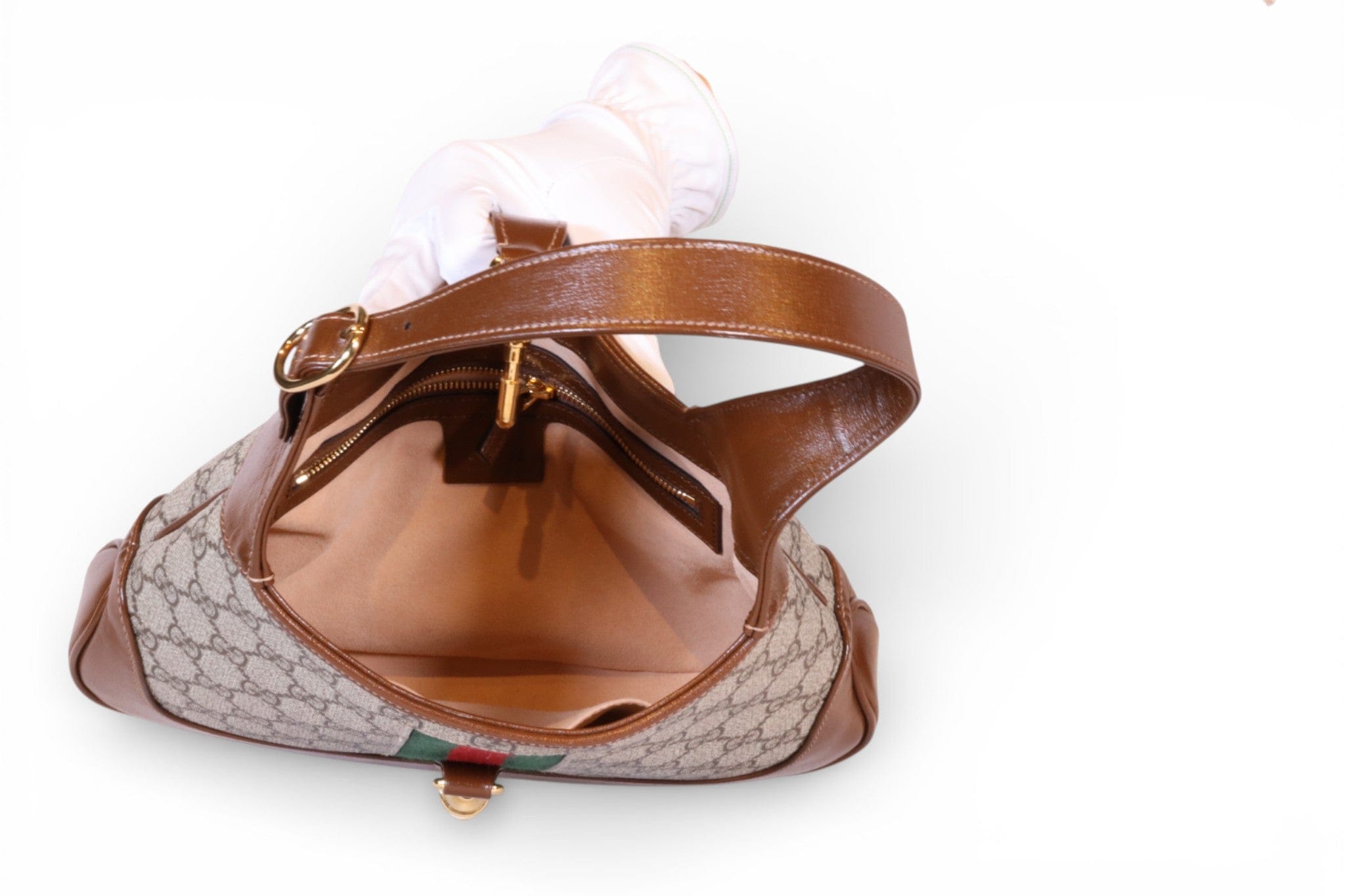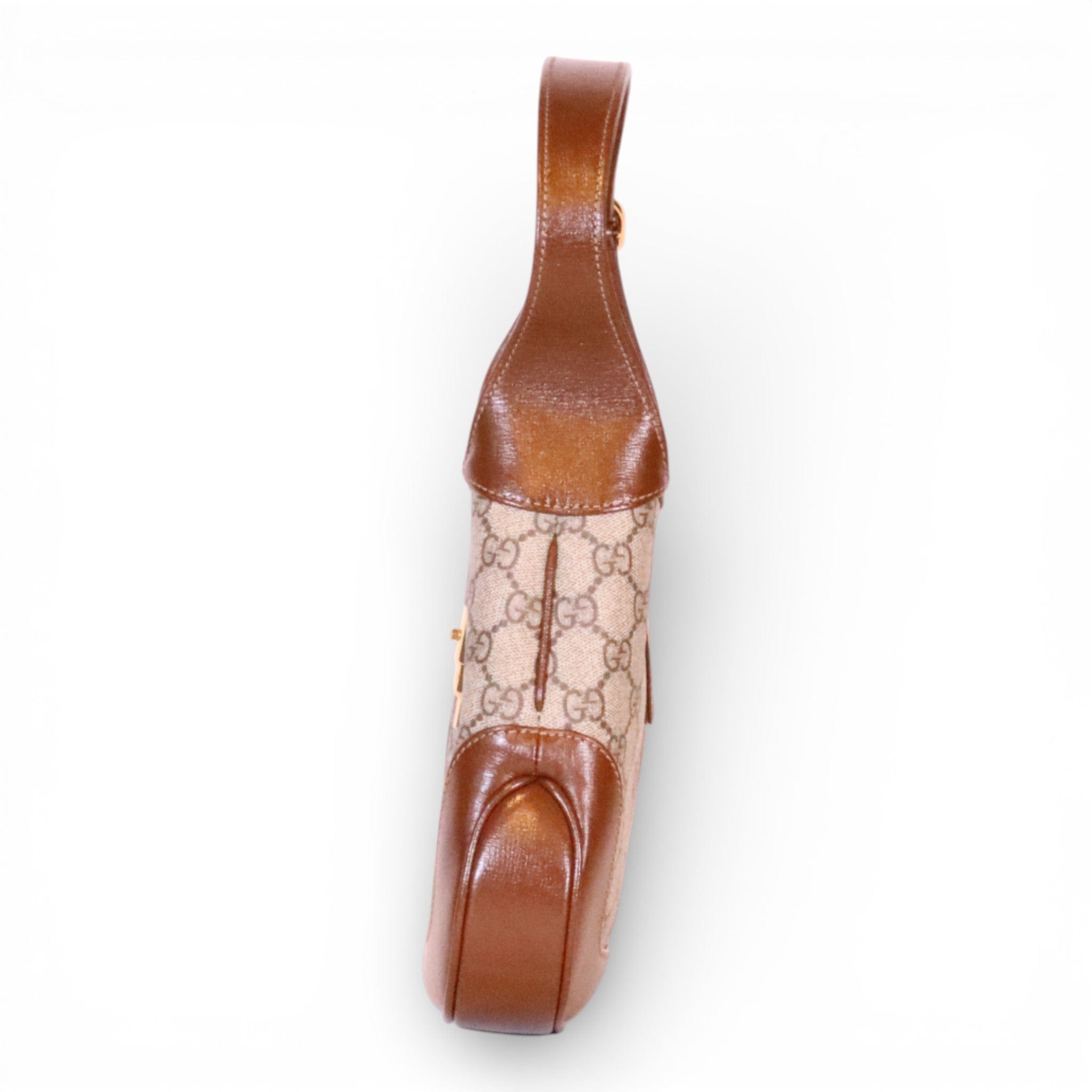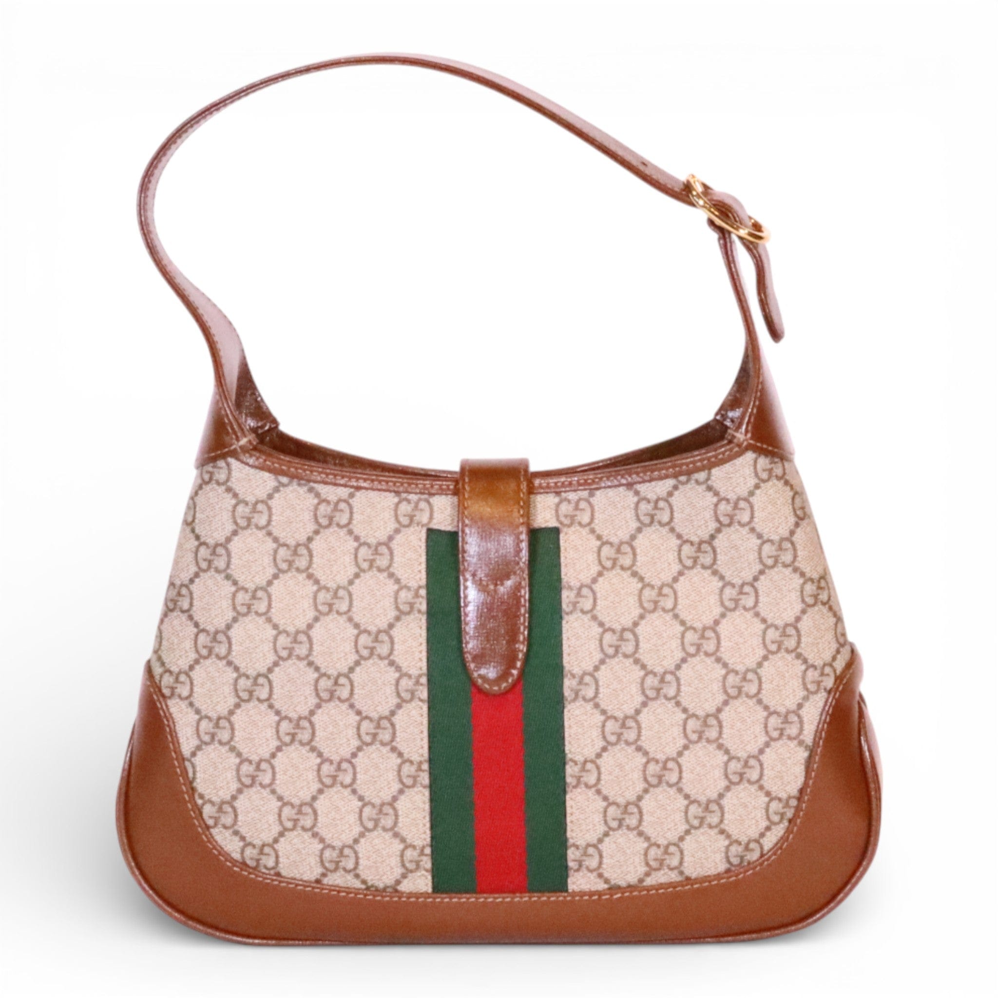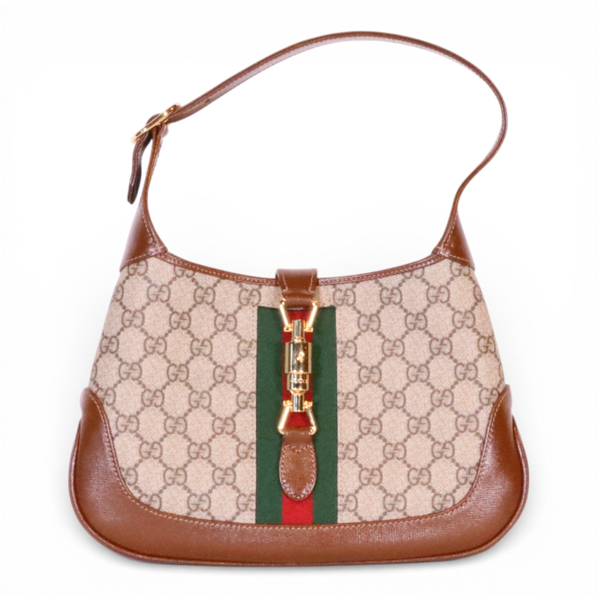 This pre-owned Gucci Jackie 1961 Small Shoulder Bag showcases the iconic GG Supreme Canvas in excellent condition. The timeless silhouette features the brand's signature craftsmanship with its structured shape and refined hardware. Includes a crossbody extender strap for versatile styling options—wear it as a shoulder bag or adjust for crossbody carry. A coveted piece for the discerning collector seeking authentic luxury with character and history.