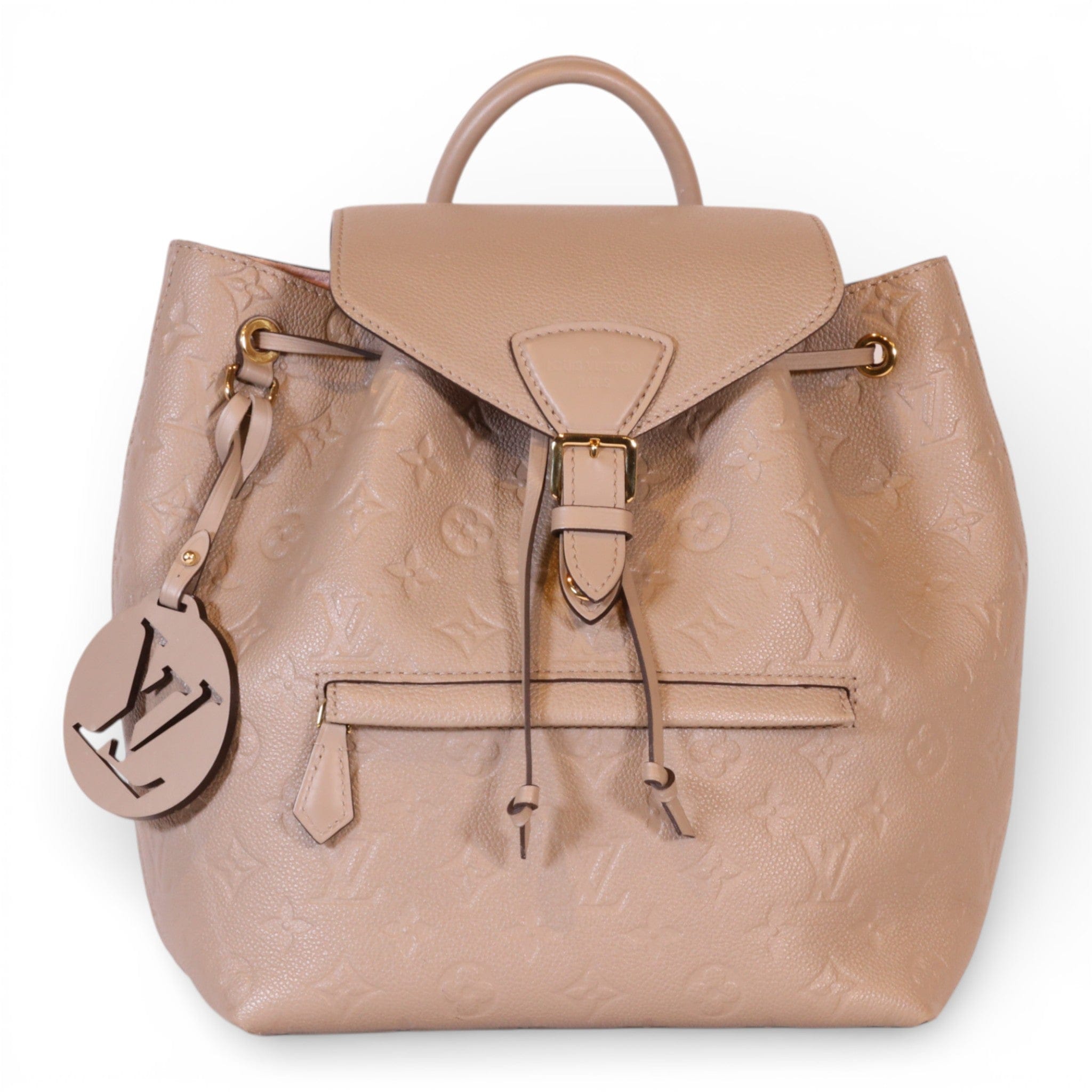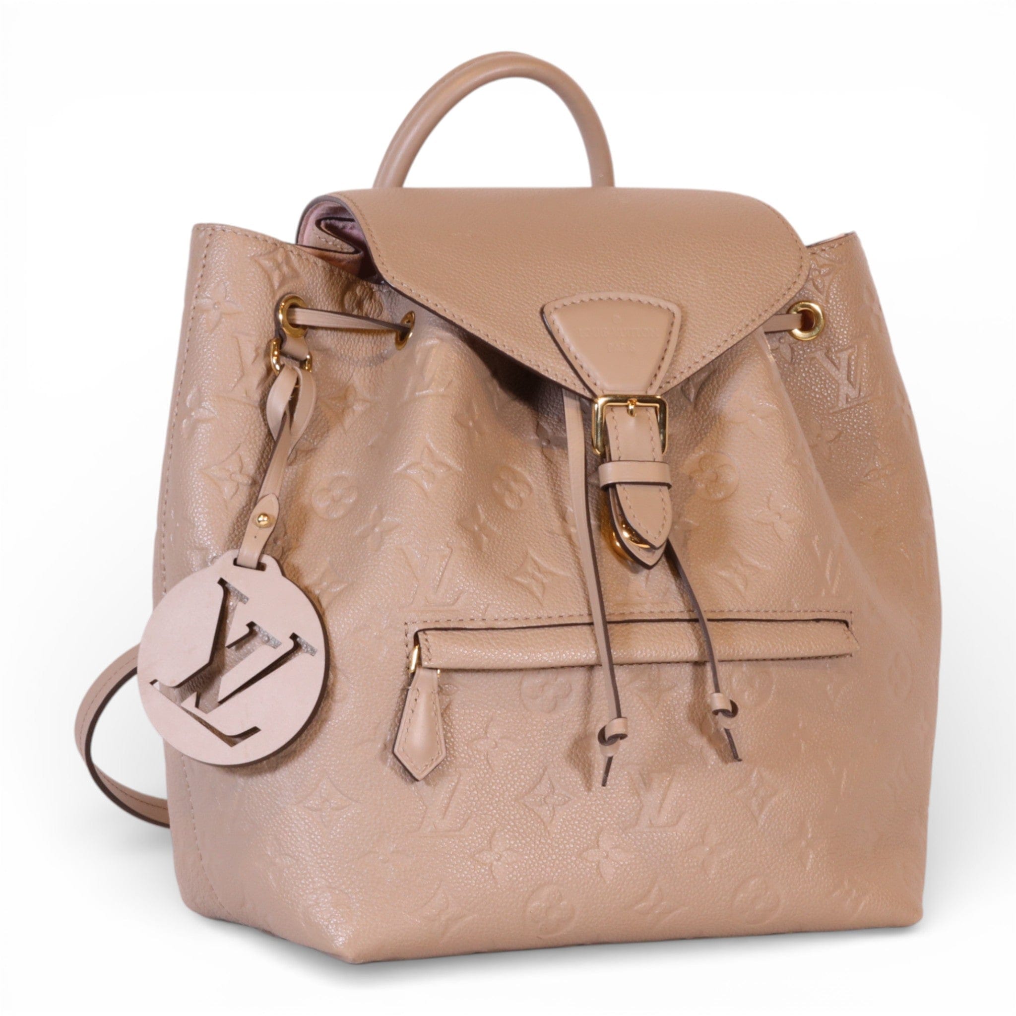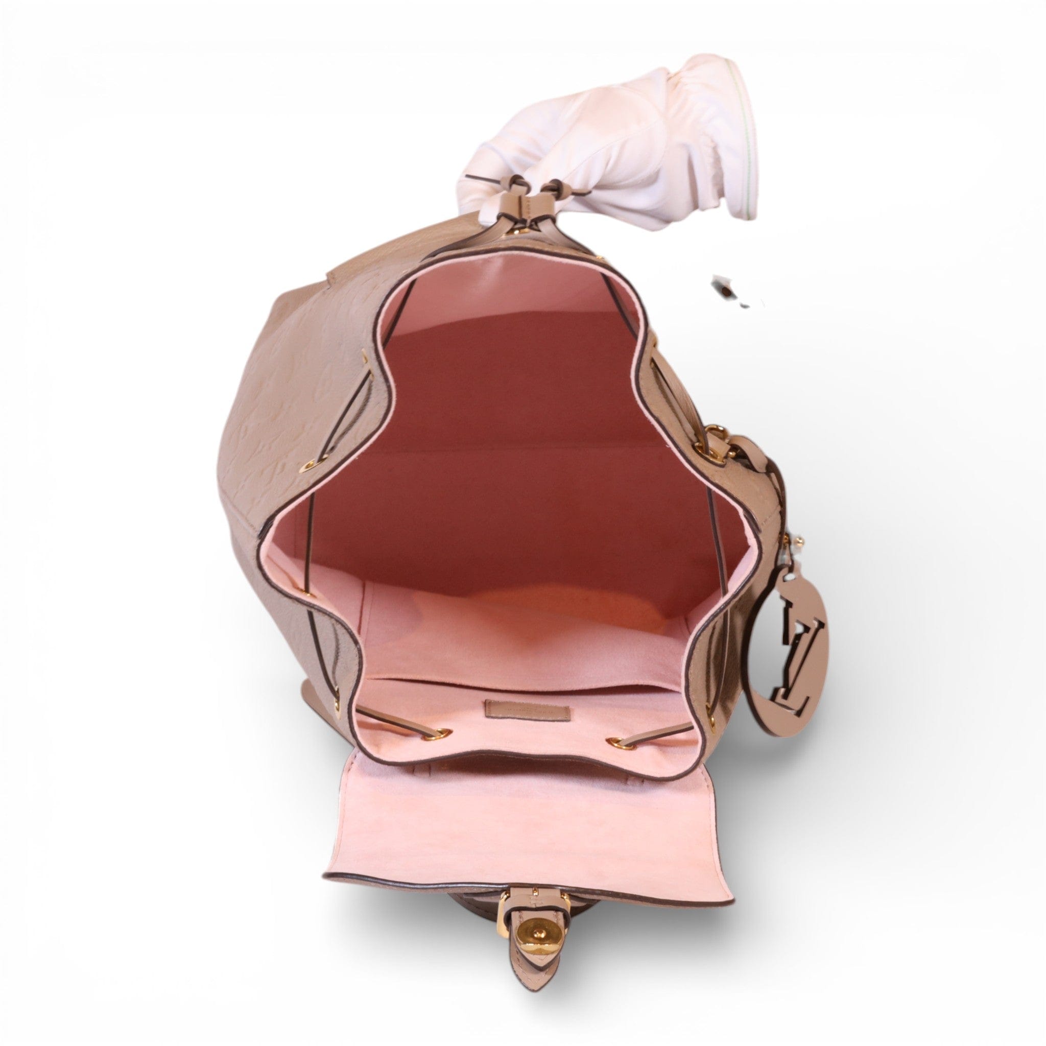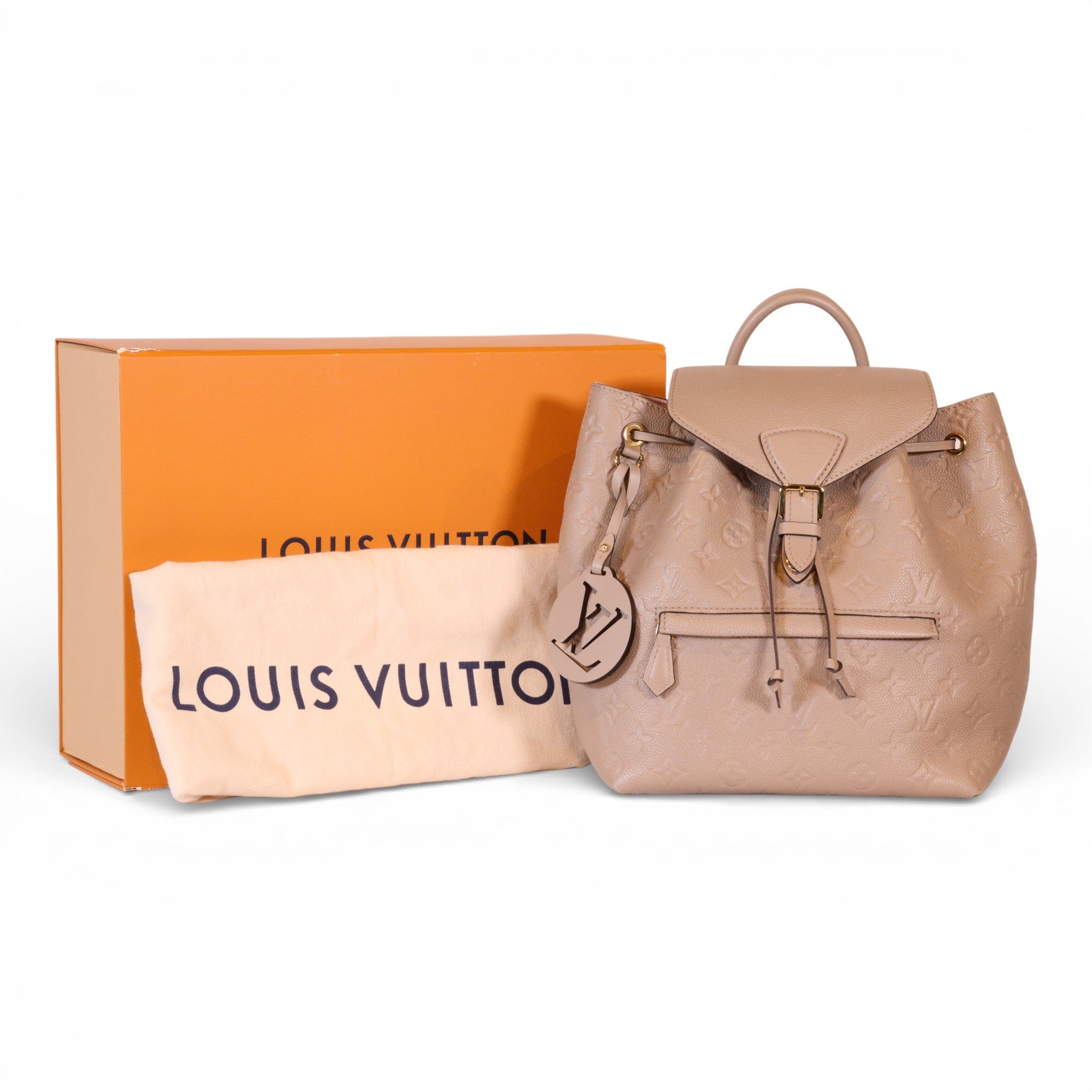 Pre-owned Louis Vuitton Montsouris Backpack crafted in supple Turtledove Empreinte leather, presenting in excellent condition with minimal corner wear consistent with careful use. This iconic silhouette retains its refined aesthetic and functionality, complemented by the original dustbag and presentation box. A distinguished addition to any luxury collection, offering authentic provenance and timeless design at a considered price point.