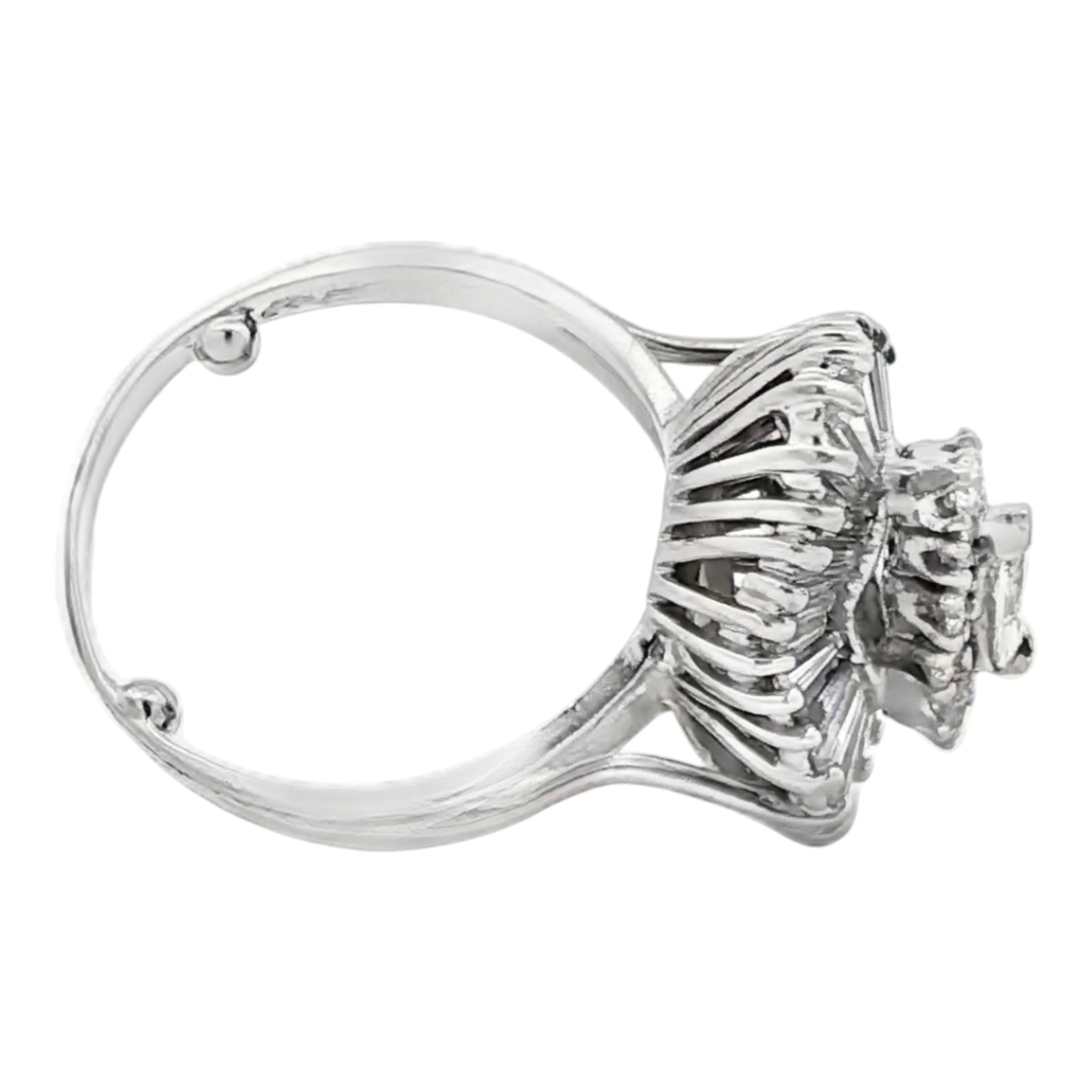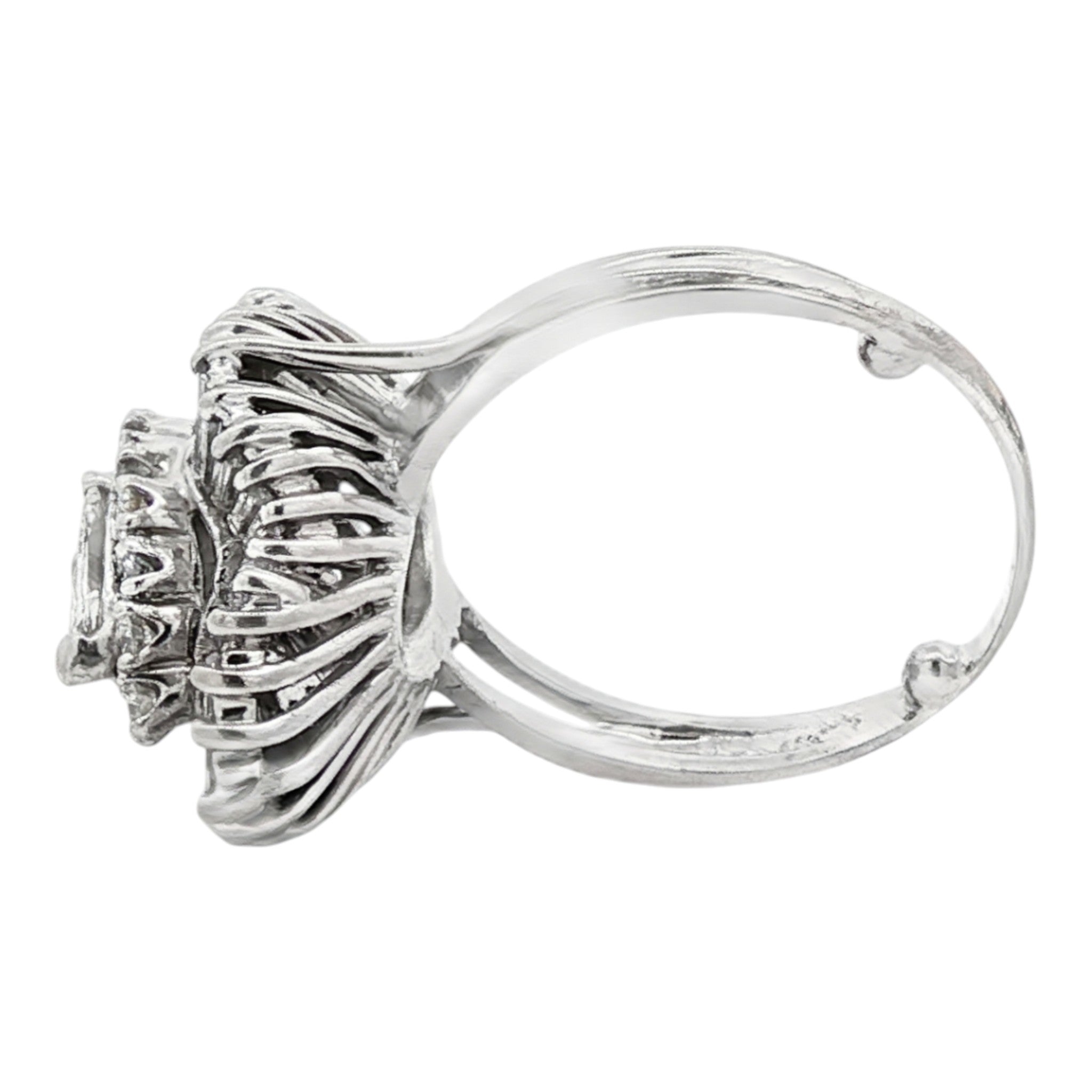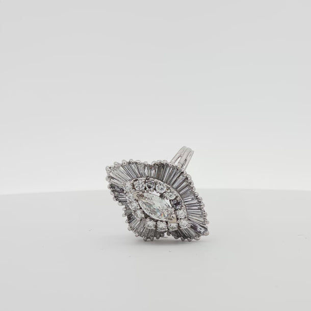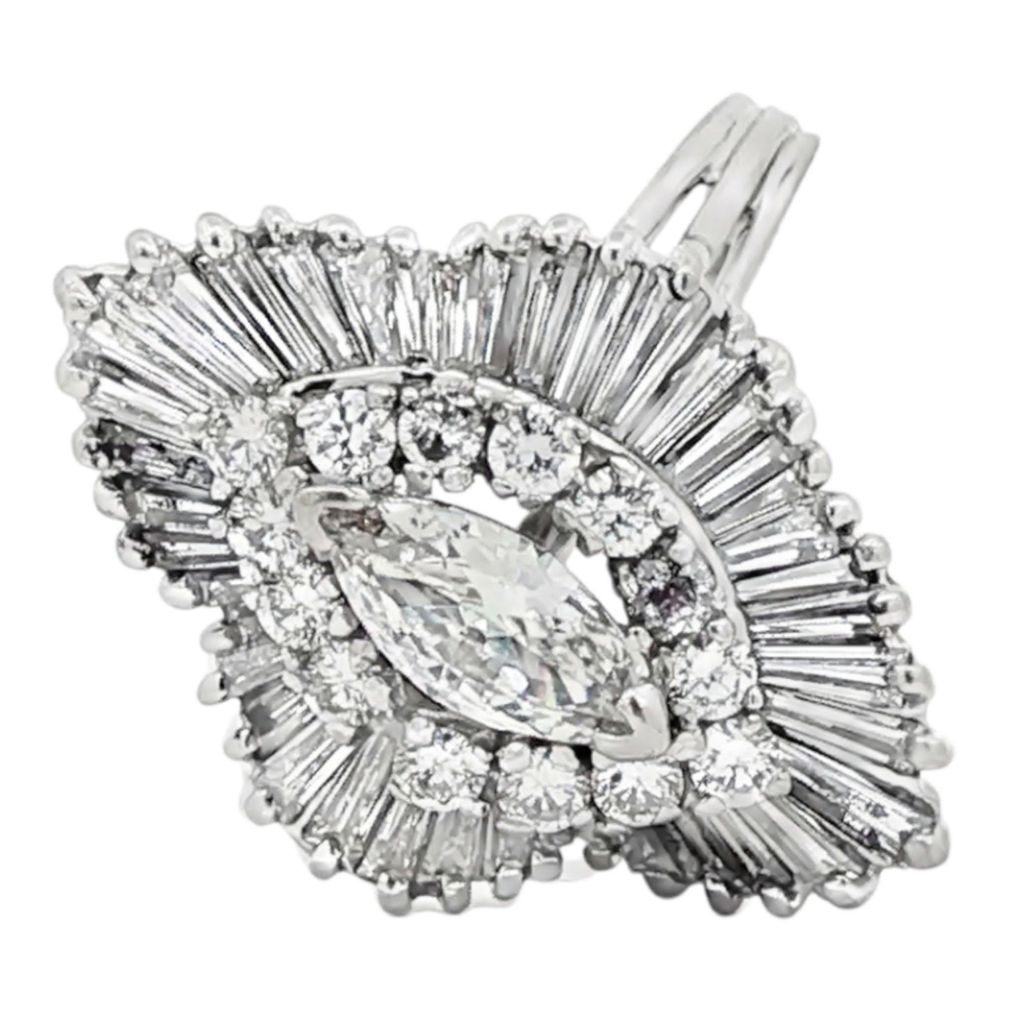 Get ready to sparkle with this 14K white gold engagement ring featuring a dazzling marquise-cut diamond at its heart. Surrounded by a double halo of round and baguette cut diamonds, this ring is perfect for those who love a mix of classic elegance and bold shine. With 3.65 ctw of diamonds, make your proposal unforgettable with this stunning, playful twist on timeless beauty.