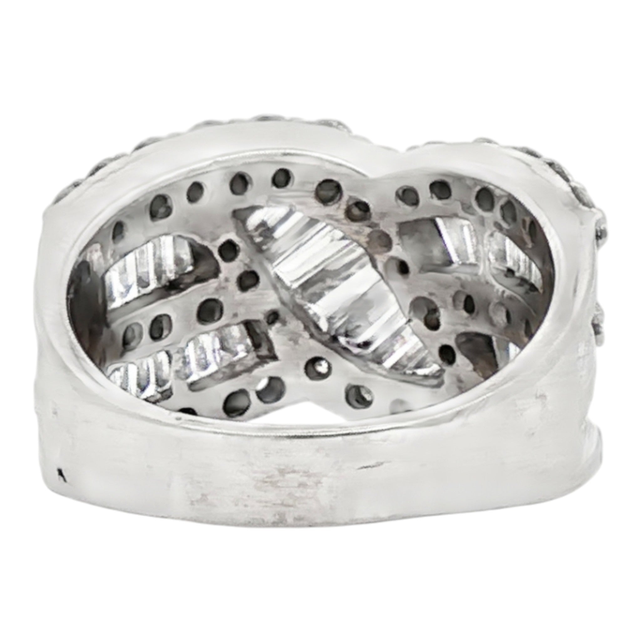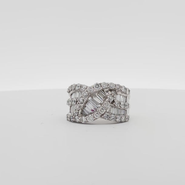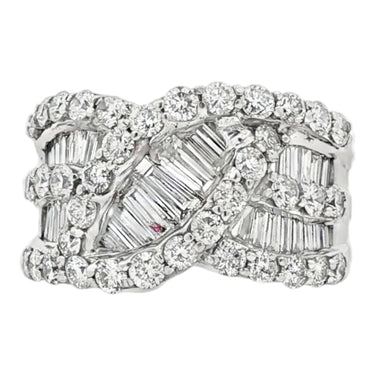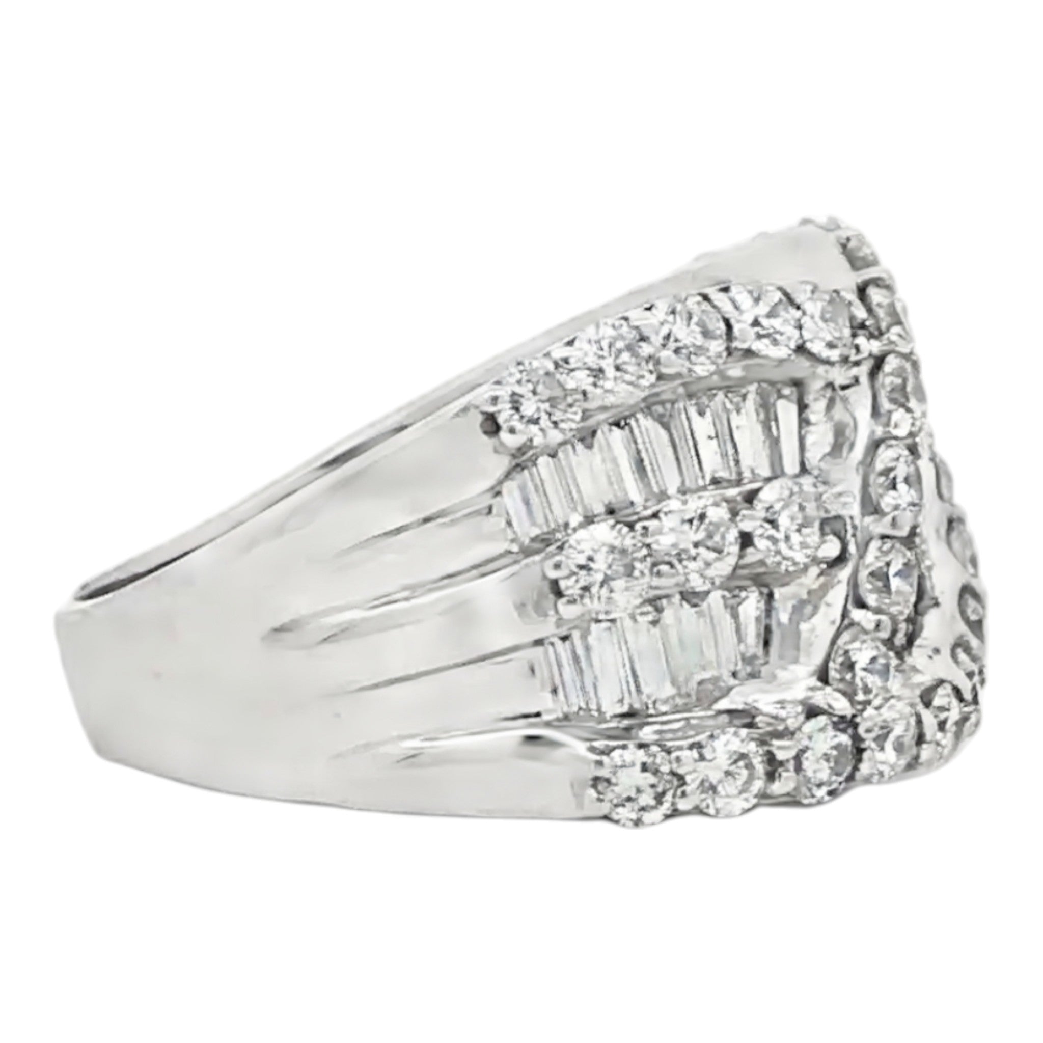 Discover elegance redefined with this 14k white gold fashion ring, where dazzling round and baguette accents unite to create a stunning statement. Its brilliant sparkle and unique design make it the perfect accessory to elevate any outfit, ensuring you stand out with timeless style and grace. Don’t miss the chance to own a piece that combines luxury and sophistication effortlessly. This ring has a carat total weight of 3.16 and weighs 4.91 grams.