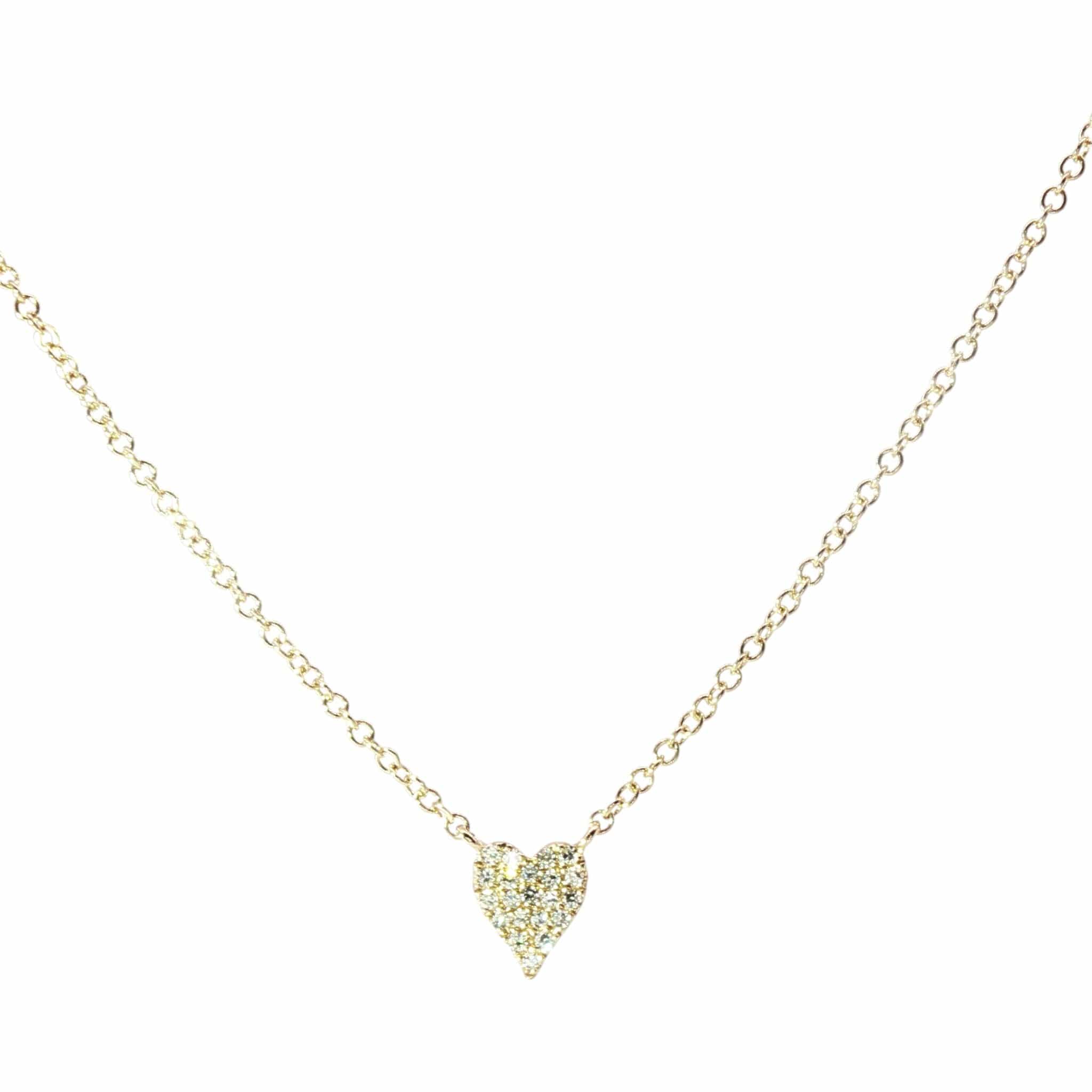 The delicate 14K yellow gold (1.6g) chain suspends a heart shaped pendant, meticulously embellished with round brilliant cut diamonds (.06ct).