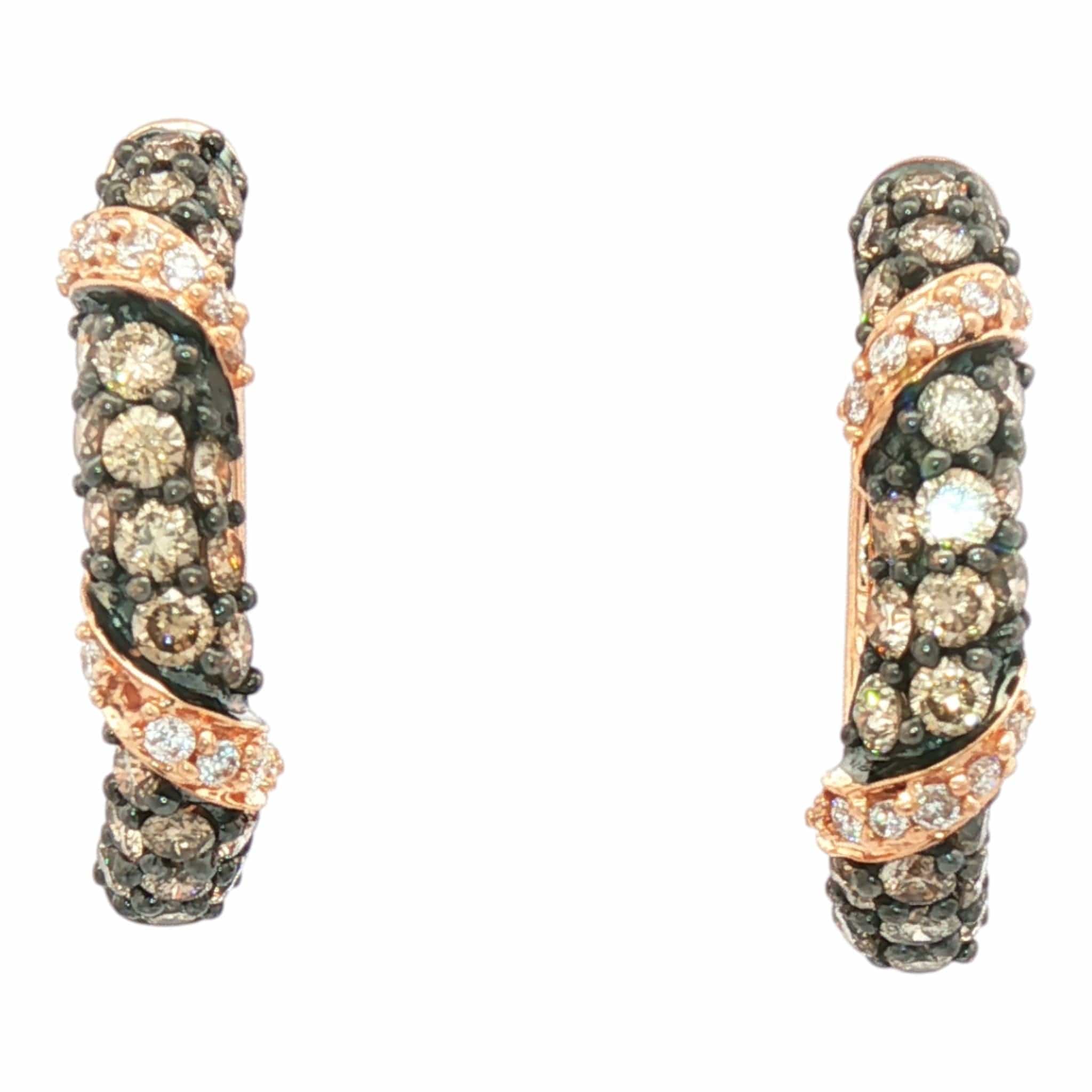 Featuring 1 carat total weight across 70 meticulously selected diamonds, this collection showcases the perfect marriage of chocolate and white diamonds intricately interwoven throughout. The strategic black rhodium accenting amplifies the contrast and brilliance of each stone, creating a multi-dimensional sparkle that captures light from every angle. These huggies represent Le Vian's mastery of color and composition, offering a distinctive alternative to traditional diamond jewelry.