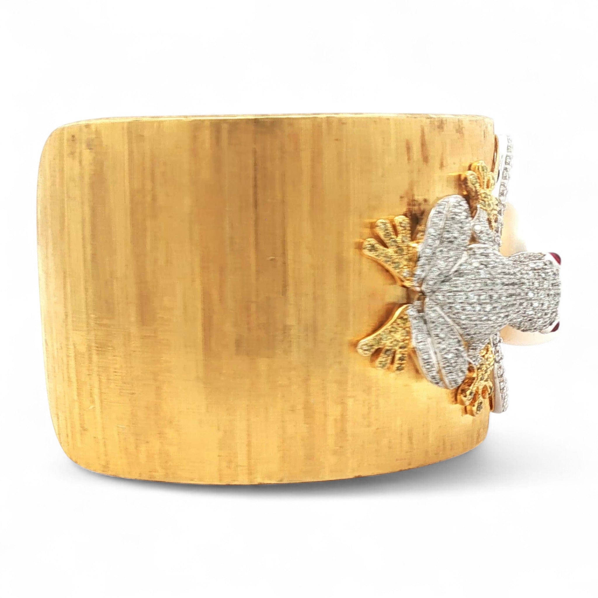 Playful yet undeniably refined, the Amphibian Serenade Ring celebrates nature’s whimsy through the artistry of fine jewelry. Crafted in radiant 18K yellow gold (76.80g), this exceptional design unites luxurious texture with the captivating charm of a jeweled tableau.