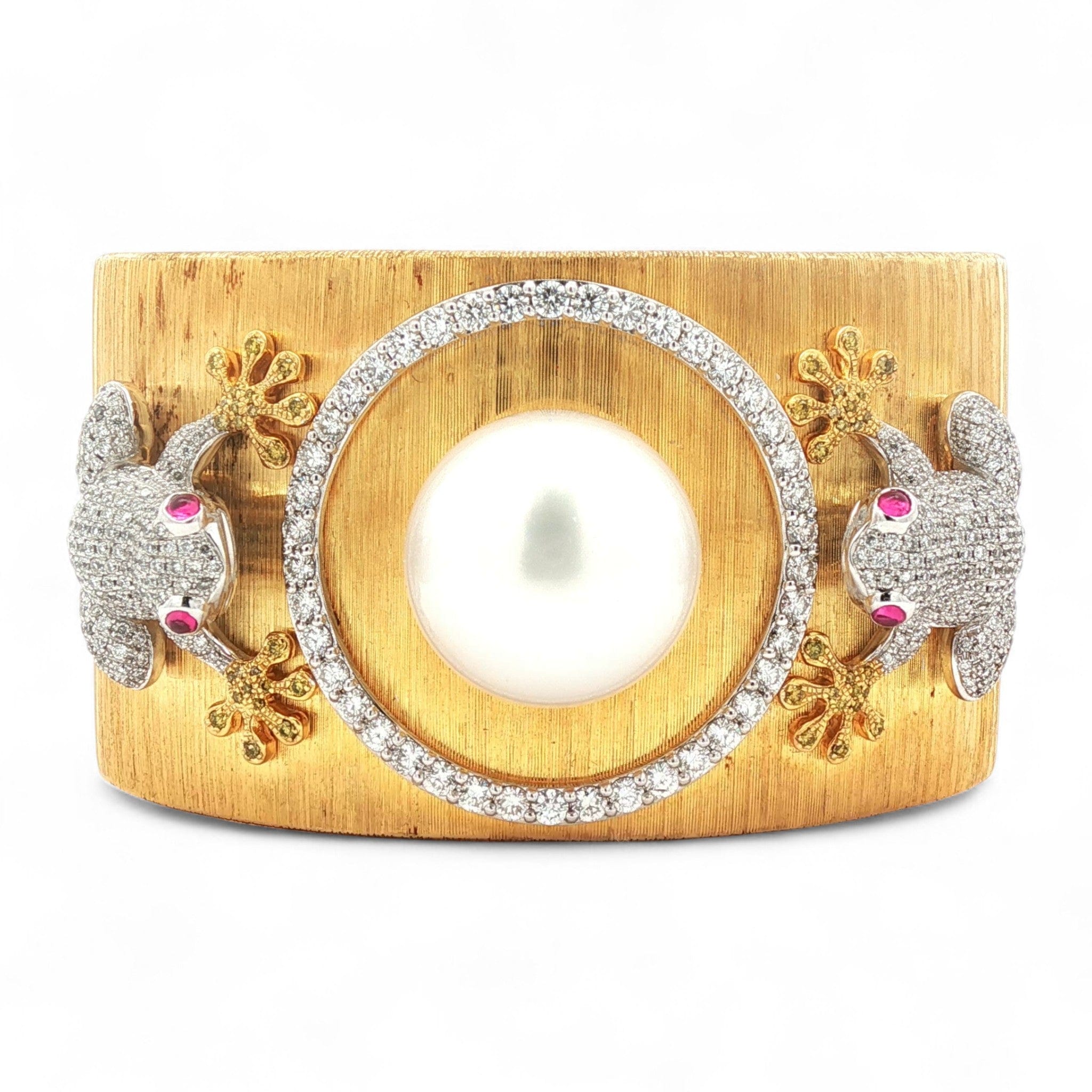 At its heart glows a luminous South Sea pearl, encircled by a halo of brilliant white diamonds (3.31cts) that amplify its iridescent beauty. On either side, two diamond-encrusted frogs—set with vivid ruby eyes (0.18cts)—appear to cradle the pearl, symbolizing prosperity, transformation, and joy. Gold diamonds (0.36cts) are pave-set within each frog flipper.