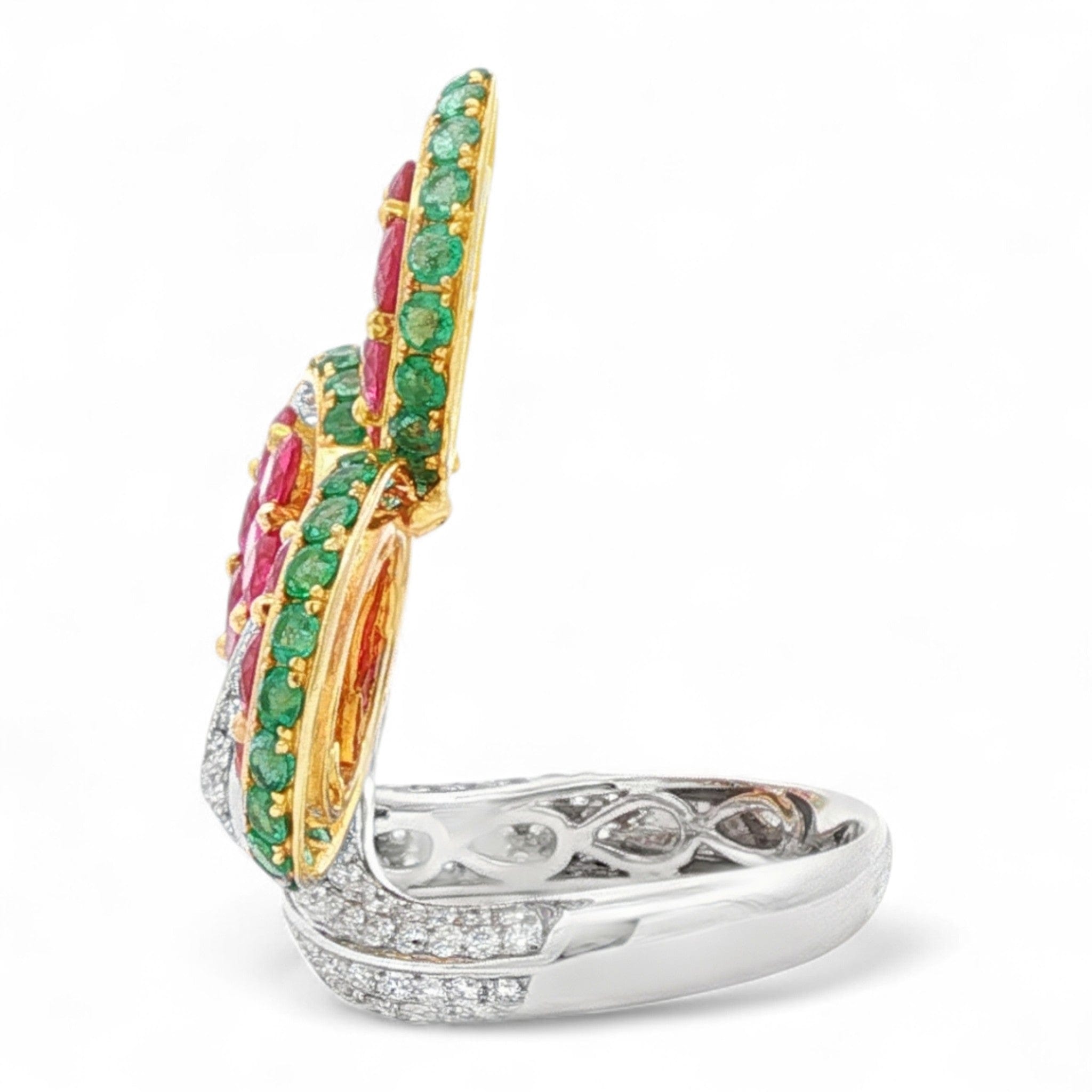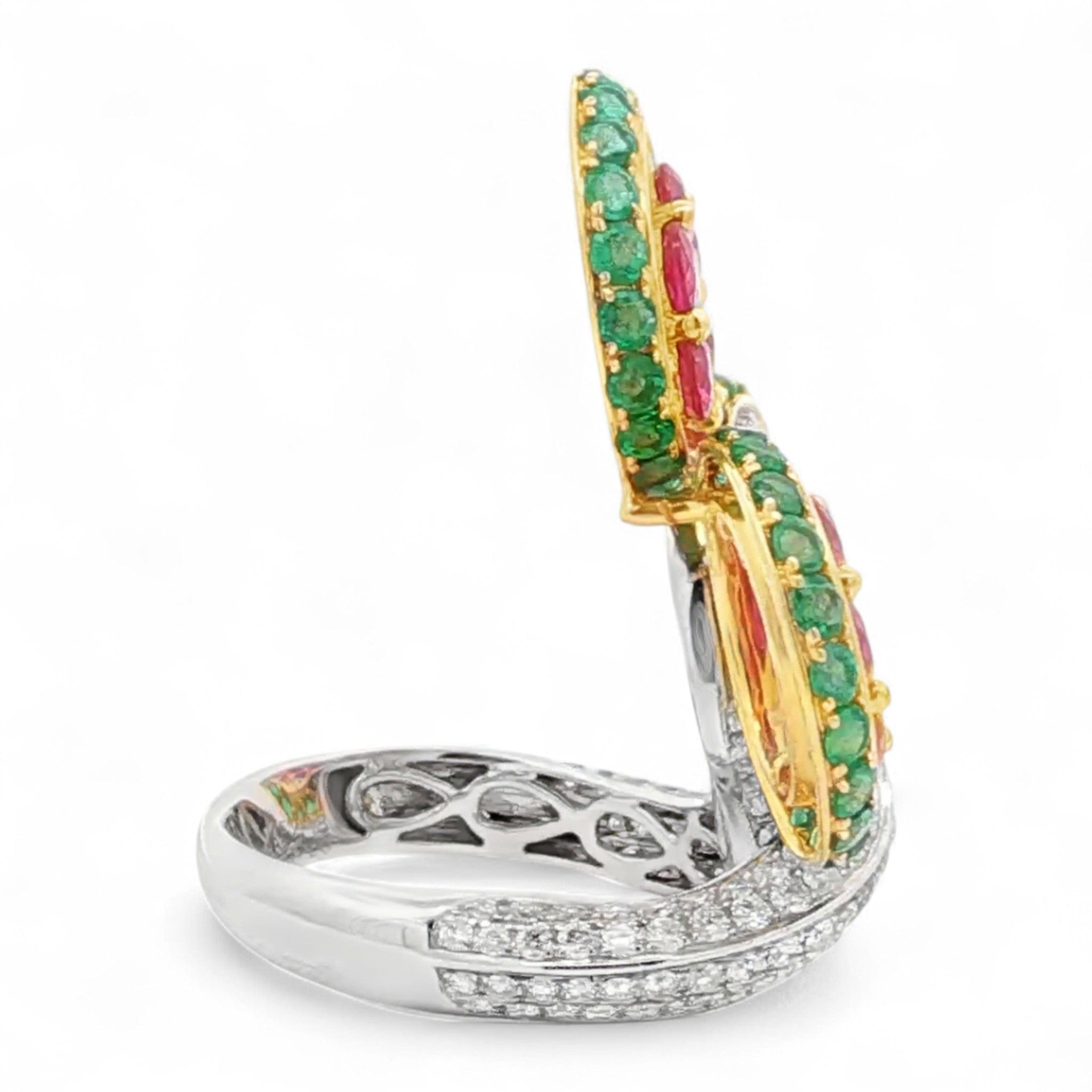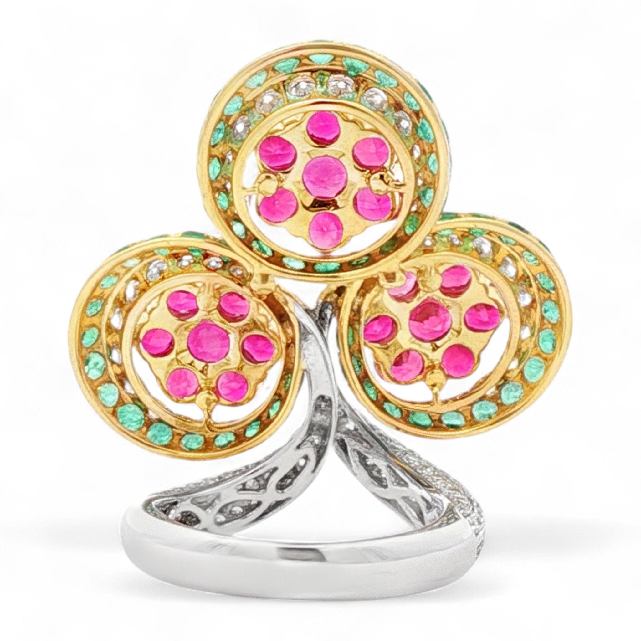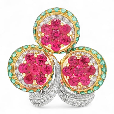 Trinity Bloom Ring in 18K White and Yellow Gold | Ruby, Emerald, and Diamond Accents