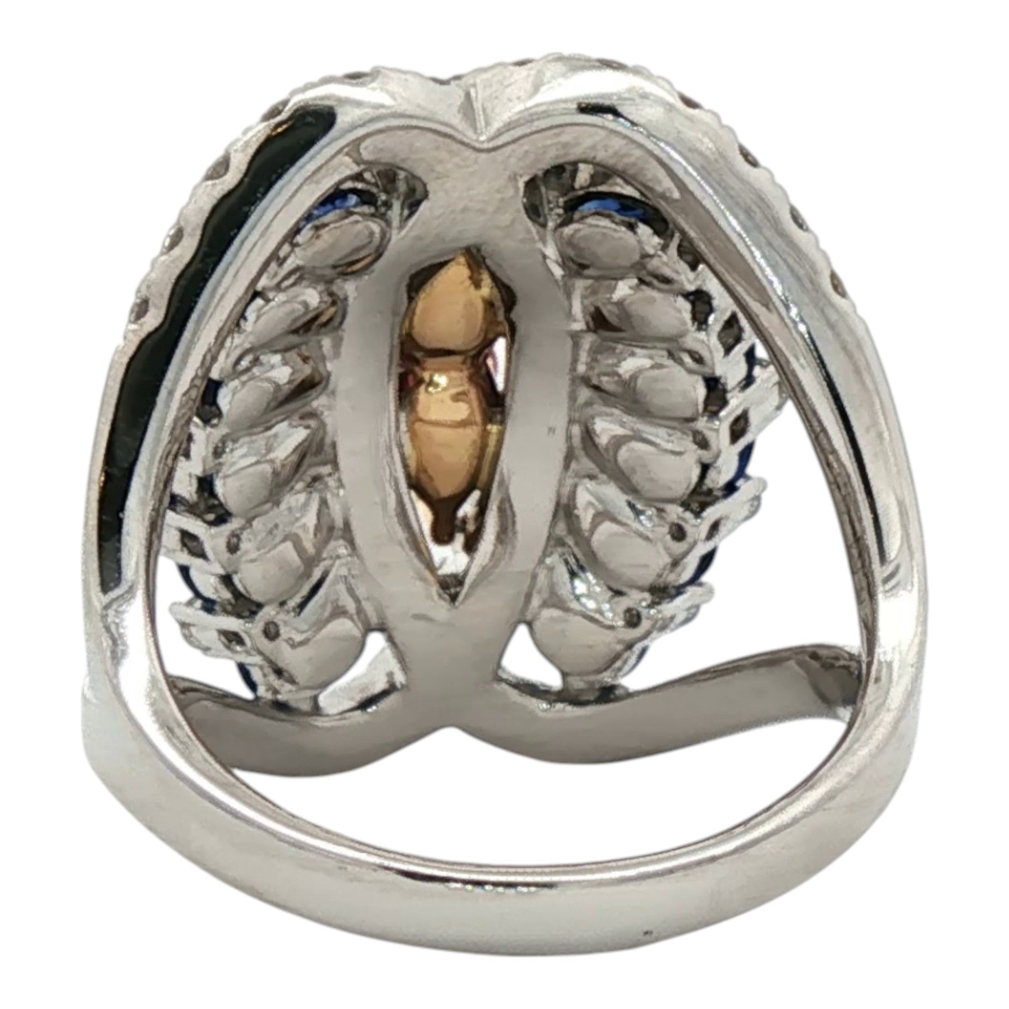 Encircling these treasures, fifty-four round brilliant white diamonds (1.19 cts) shimmer with celestial light, their brilliance tracing elegant arcs that evoke eternal motion and grace. Every gemstone is meticulously hand-set to achieve a perfect equilibrium of color, texture, and form—an artful expression of strength, sophistication, and the timeless pursuit of beauty.