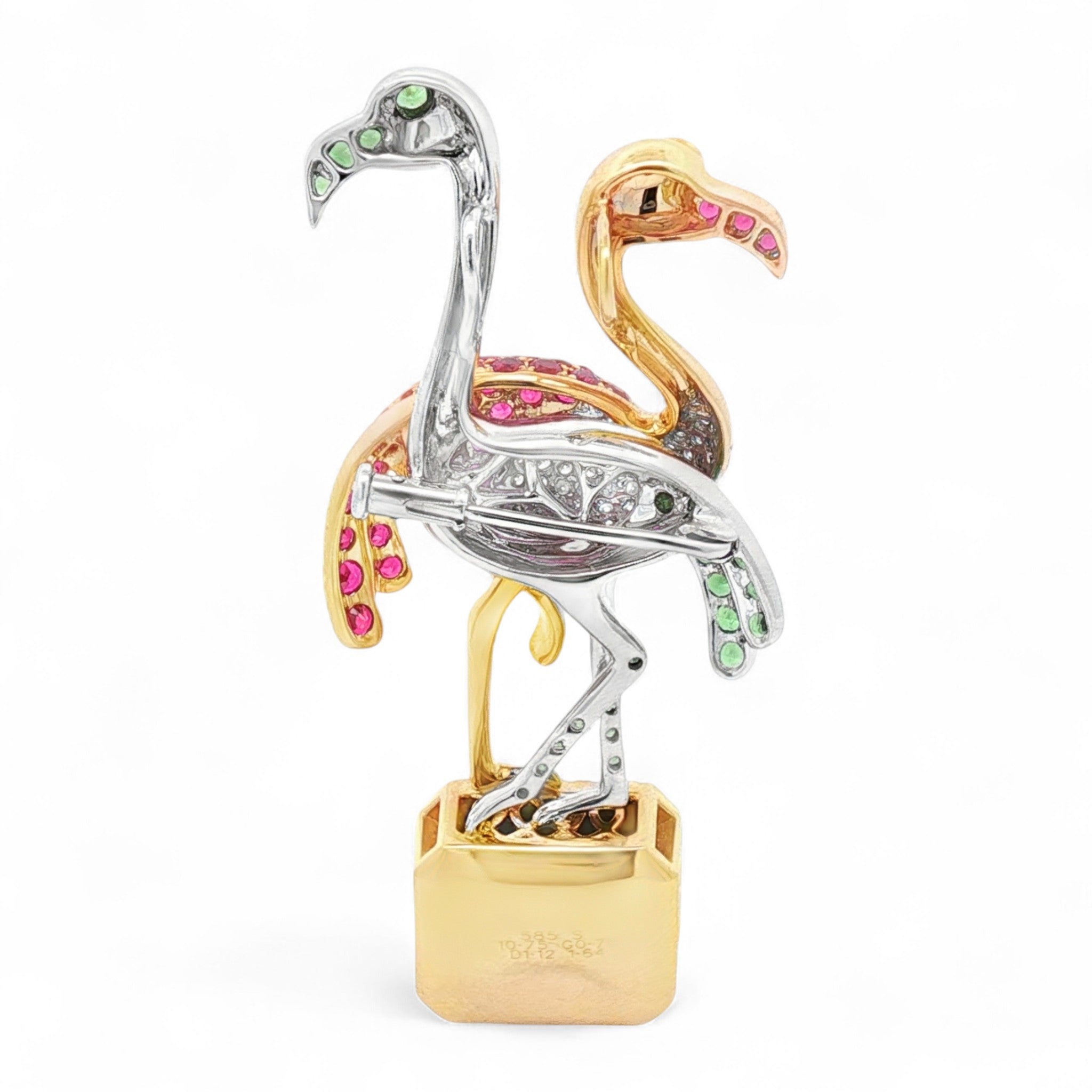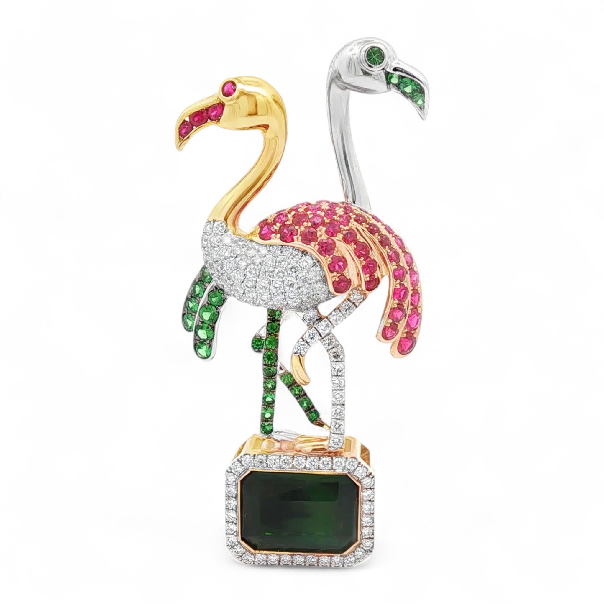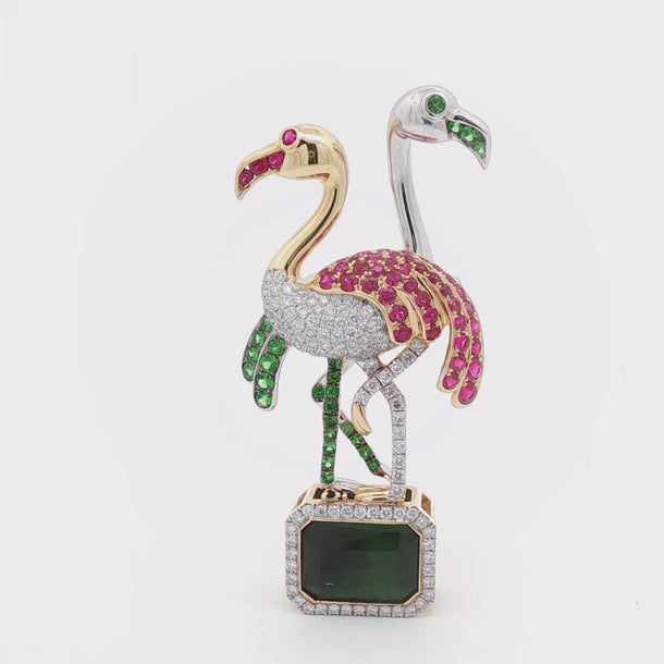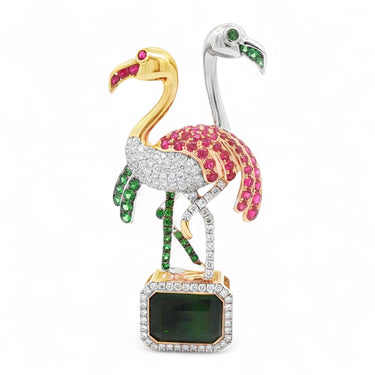 Delight in the elegance of this captivating 14K white and yellow gold flamingo brooch/pendant. Weighing 17.49 grams, this masterpiece features a stunning emerald-cut tourmaline of 10.75 carats. The vibrant design is accented with 30 round green garnets totaling 0.75 carats and 46 radiant rubies totaling 1.64 carats. Enhanced by 113 round white diamonds totaling 1.12 carats, this piece exudes elegance and charm. Versatile as both a brooch and pendant, this exquisite flamingo is the perfect blend of nature-inspired beauty and luxurious craftsmanship, making it a standout accessory for any occasion.