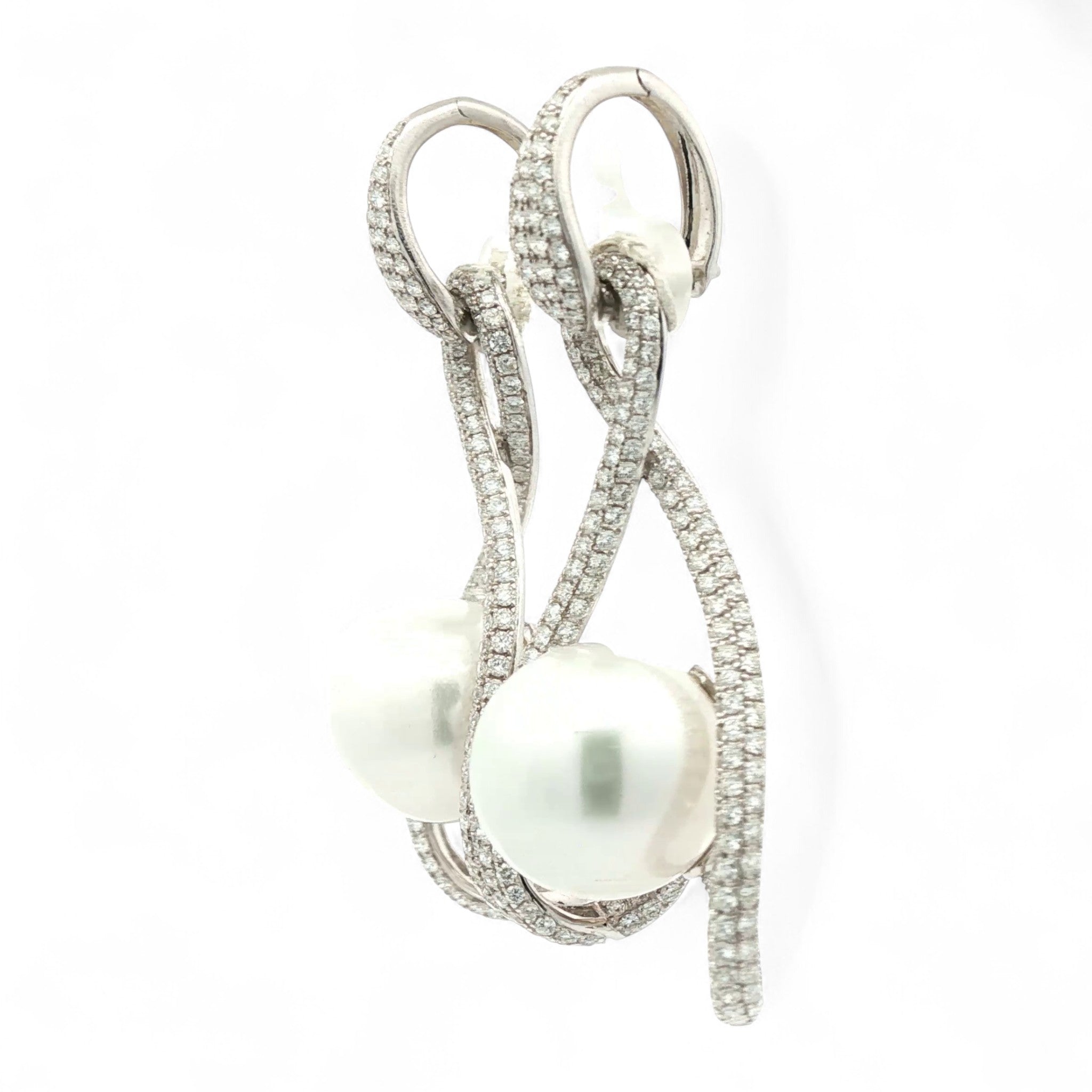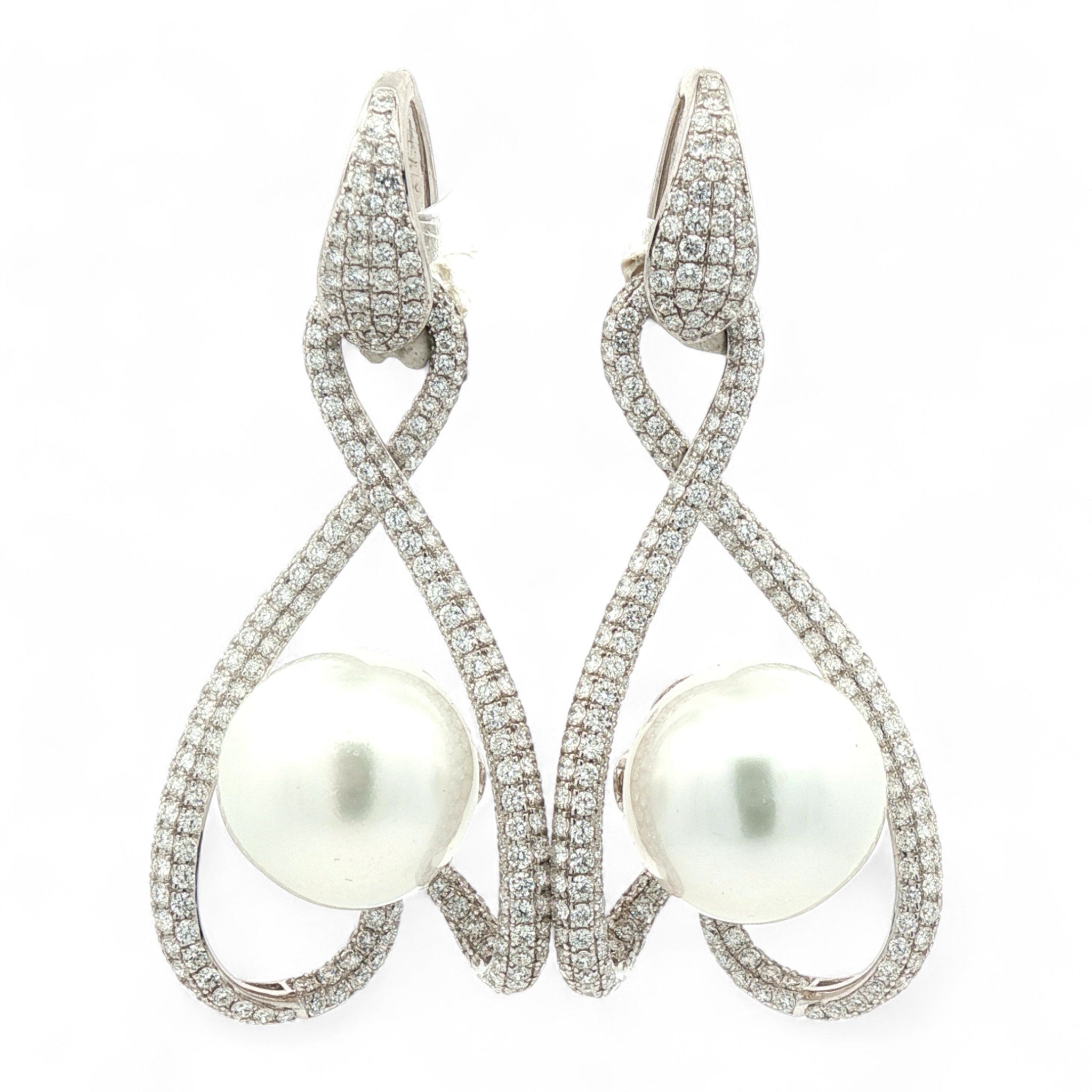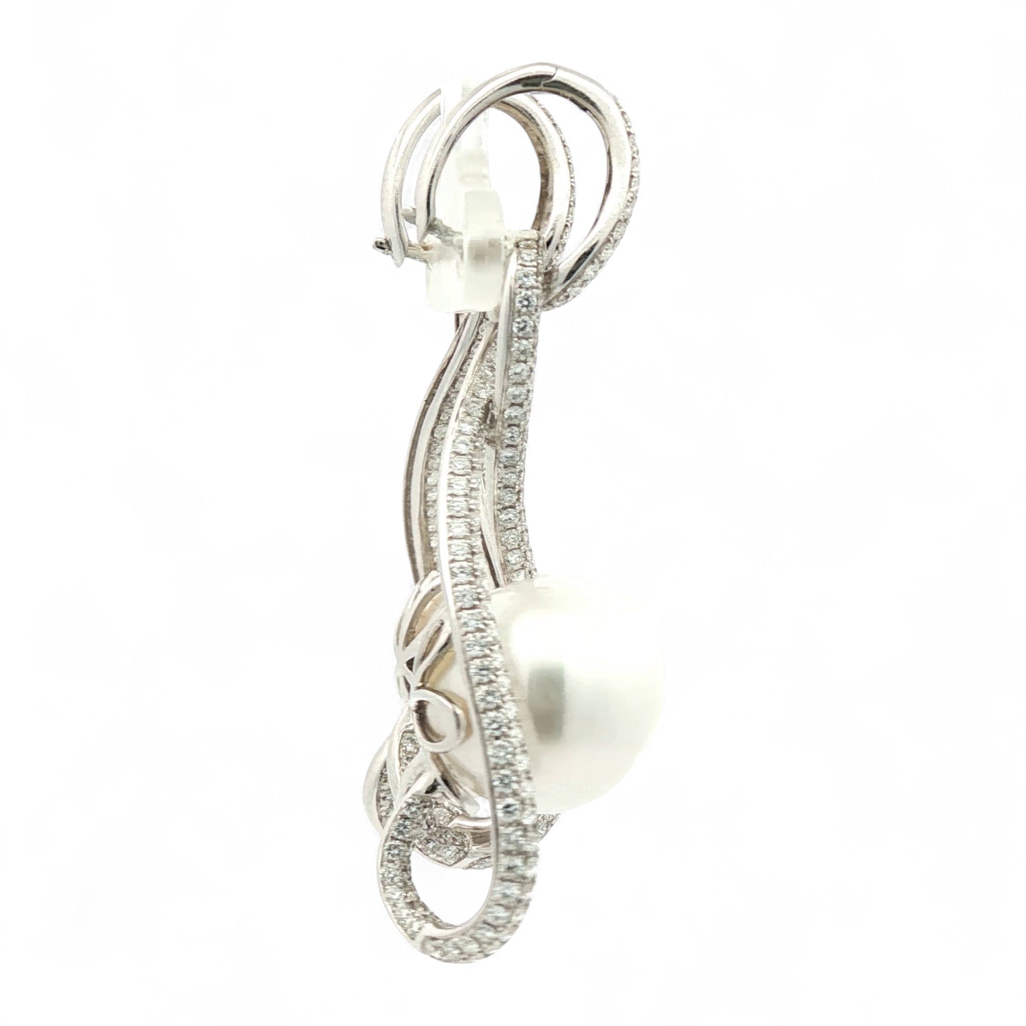 Elevate your jewelry collection with these stunning 18K white gold earrings weighing 13.21 grams. Featuring two luminous white South Sea pearls, each measuring 15mm, they exude timeless elegance. Complemented by a cascade of 550 round white diamonds totaling 5.65 carats, the intricate design creates a captivating blend of brilliance and sophistication. The enchanting drop style, combined with the radiant pearls and sparkling diamonds, makes these earrings perfect for special occasions or adding a touch of luxury to everyday wear. A truly exquisite expression of craftsmanship and elegance.