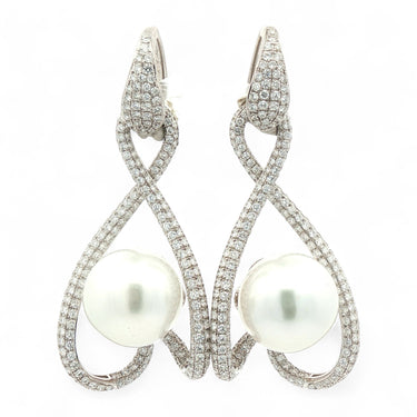 Elegant 18K White Gold Earrings Featuring White South Sea Pearl & Diamonds