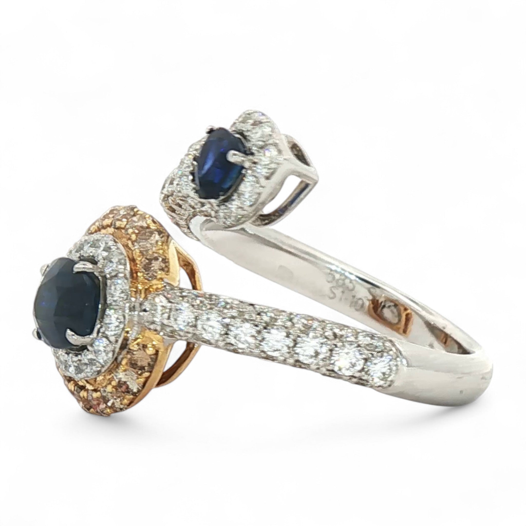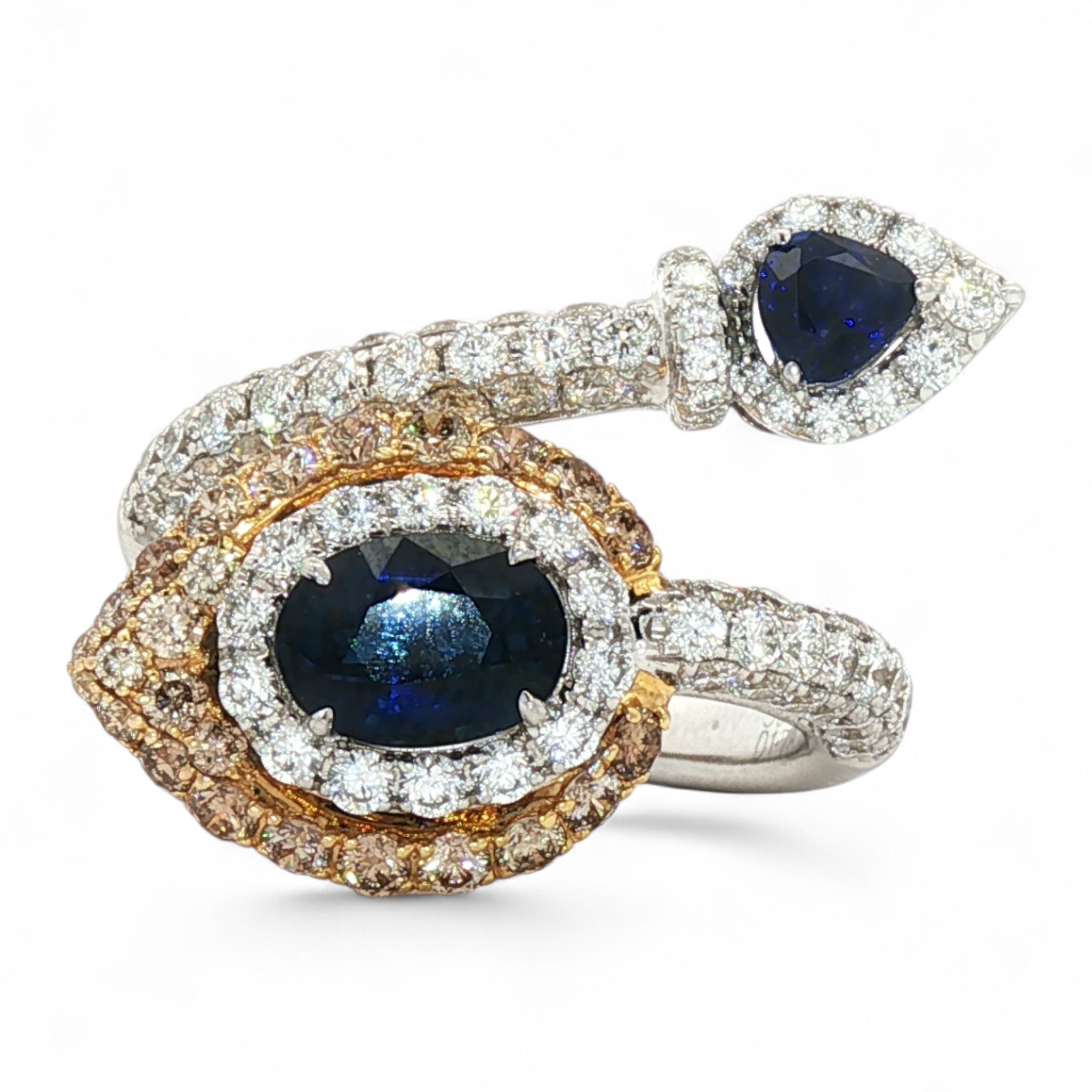 At its center, an oval blue sapphire (1.44 cts) commands attention with its velvety hue and celestial glow, accompanied by a smaller sapphire (0.34 cts) that adds a graceful echo of serenity. Surrounding these vivid gems, eighty-four round white diamonds (1.31 cts) shimmer with pure radiance, their brilliance accentuated by twenty-five round brown diamonds (0.47 cts) that lend a subtle, earthy warmth to the composition.