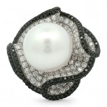 Make a striking statement with this exquisite 18K white gold ring weighing 11.74 grams. Adorned with a luminous 14mm white South Sea pearl at its center, the ring is beautifully accented by a radiant array of 152 round white diamonds totaling 2.69 carats and 244 round black diamonds weighing 1.39 carats. The intricate design blends the classic elegance of the pearl with stunning contrasts of black and white gemstones, creating a captivating piece fit for special occasions. Expertly crafted, this ring embodies sophistication and modern luxury, making it a standout addition to any jewelry collection.