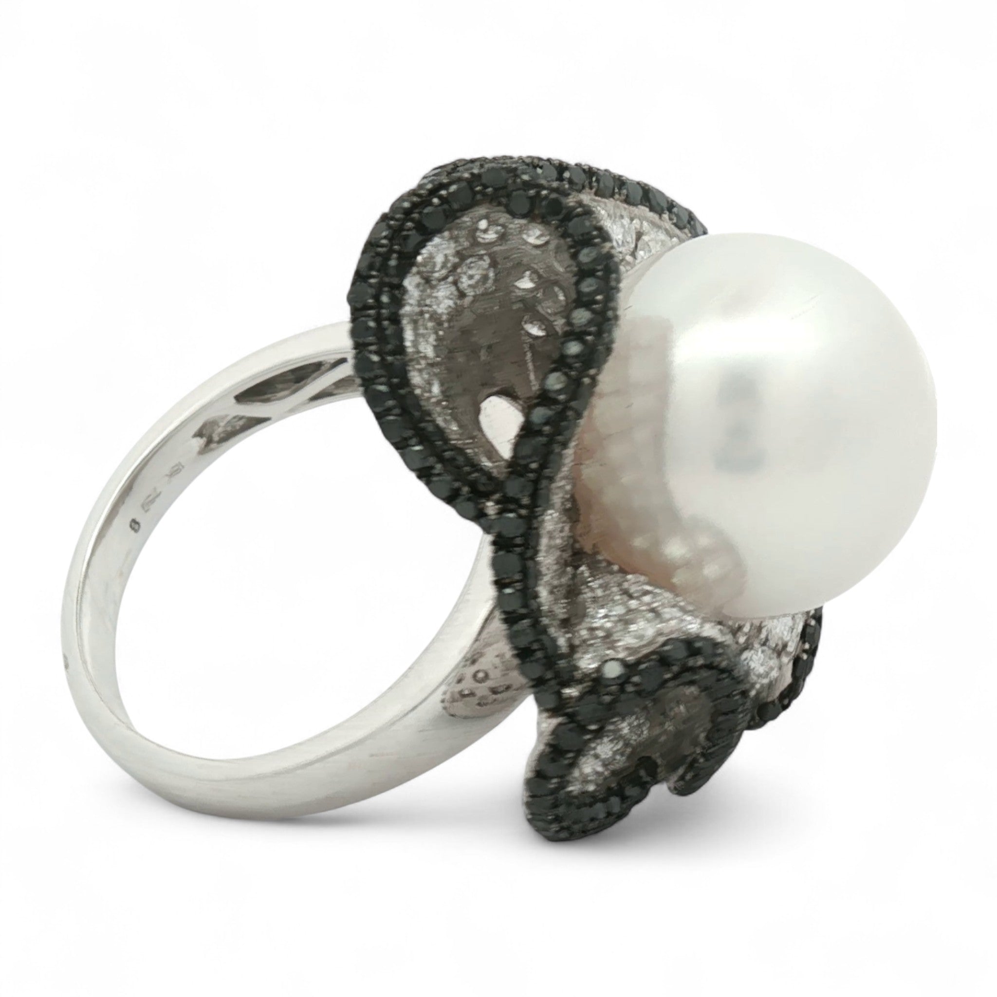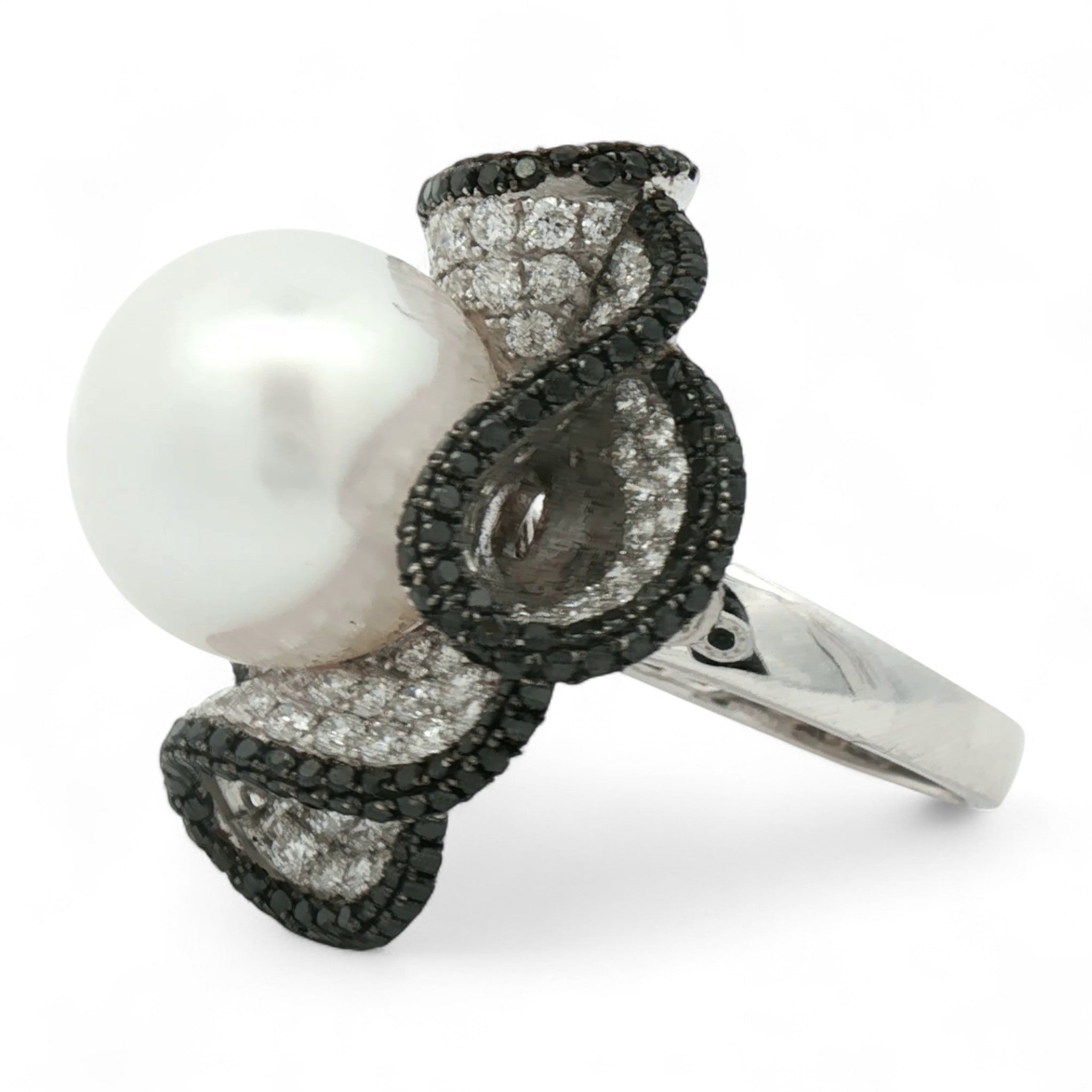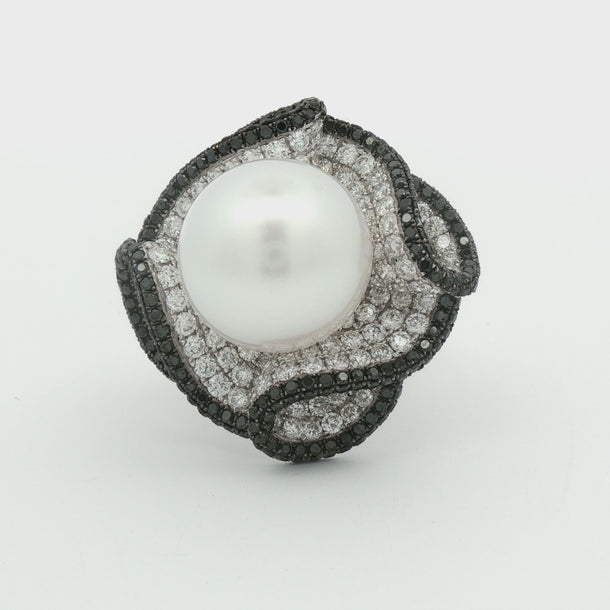 Sophisticated 18K White Gold Ring Featuring White South Sea Pearl & Black & White Diamonds