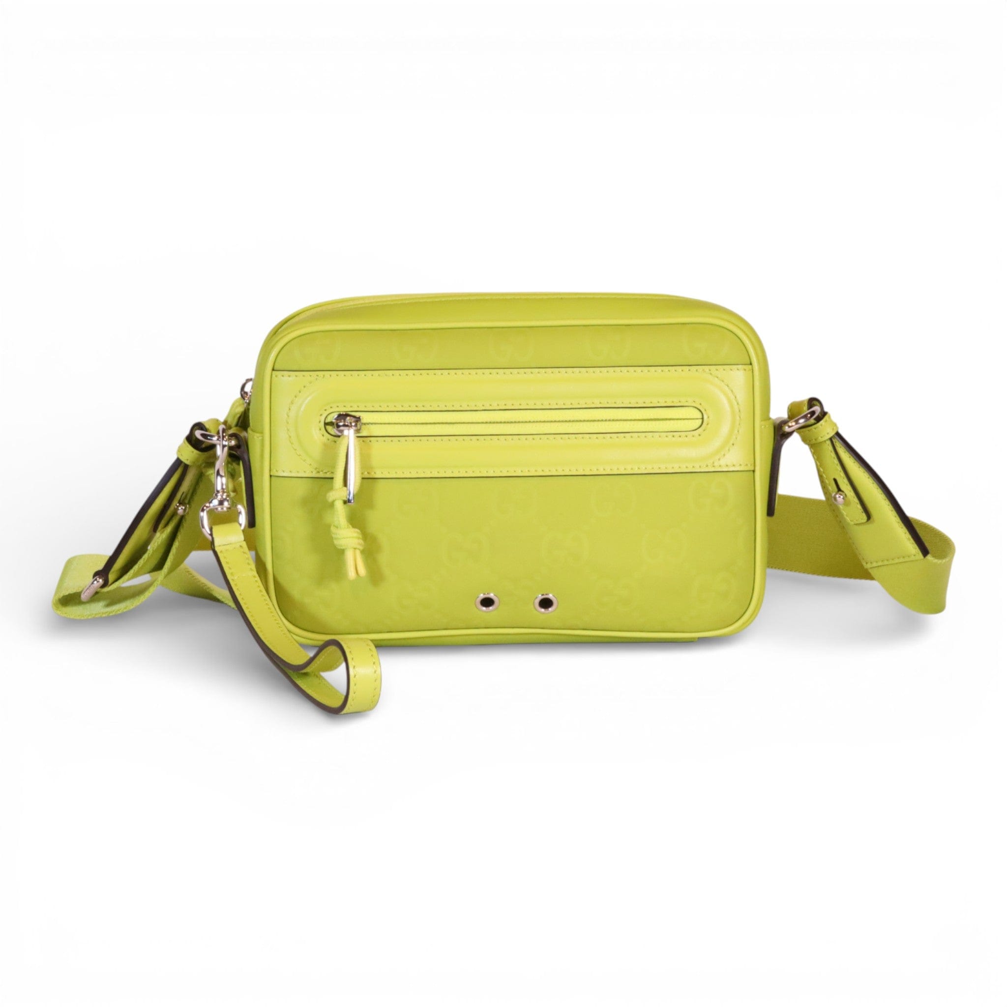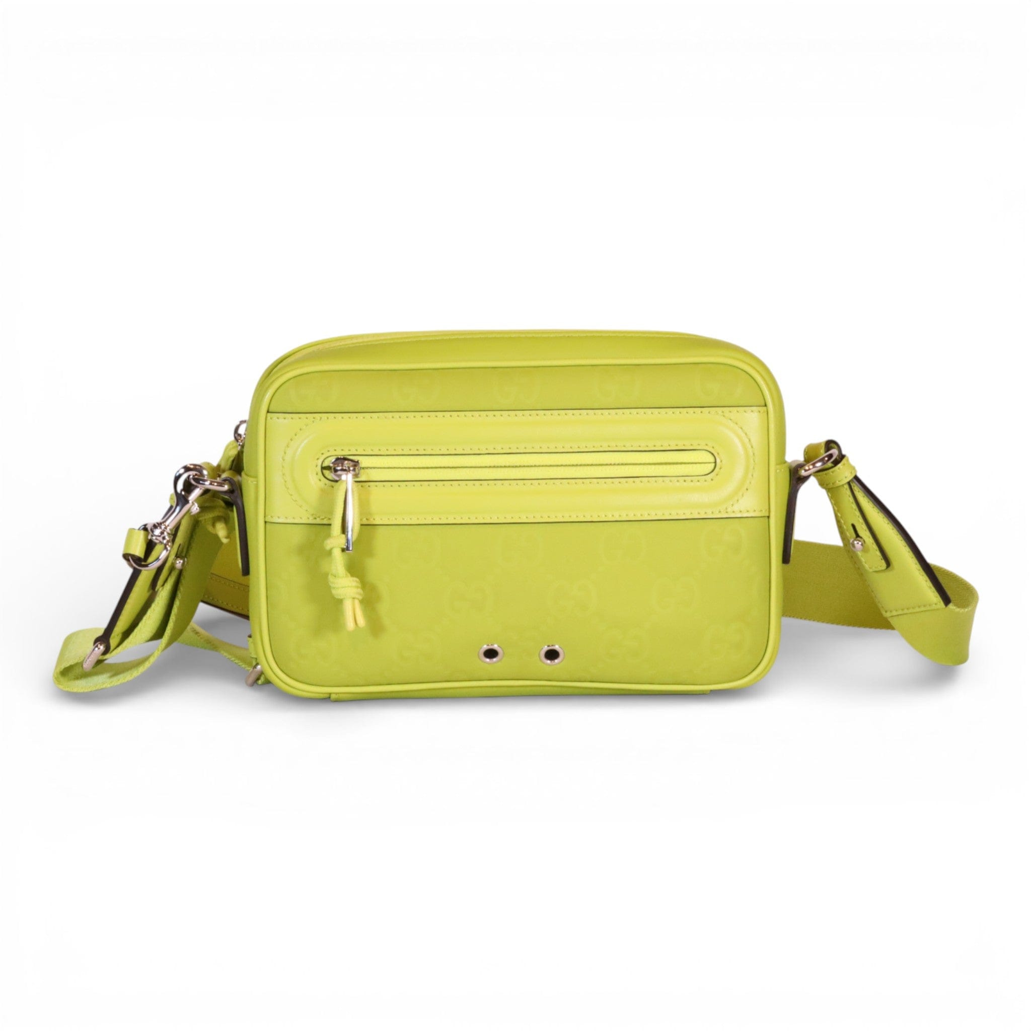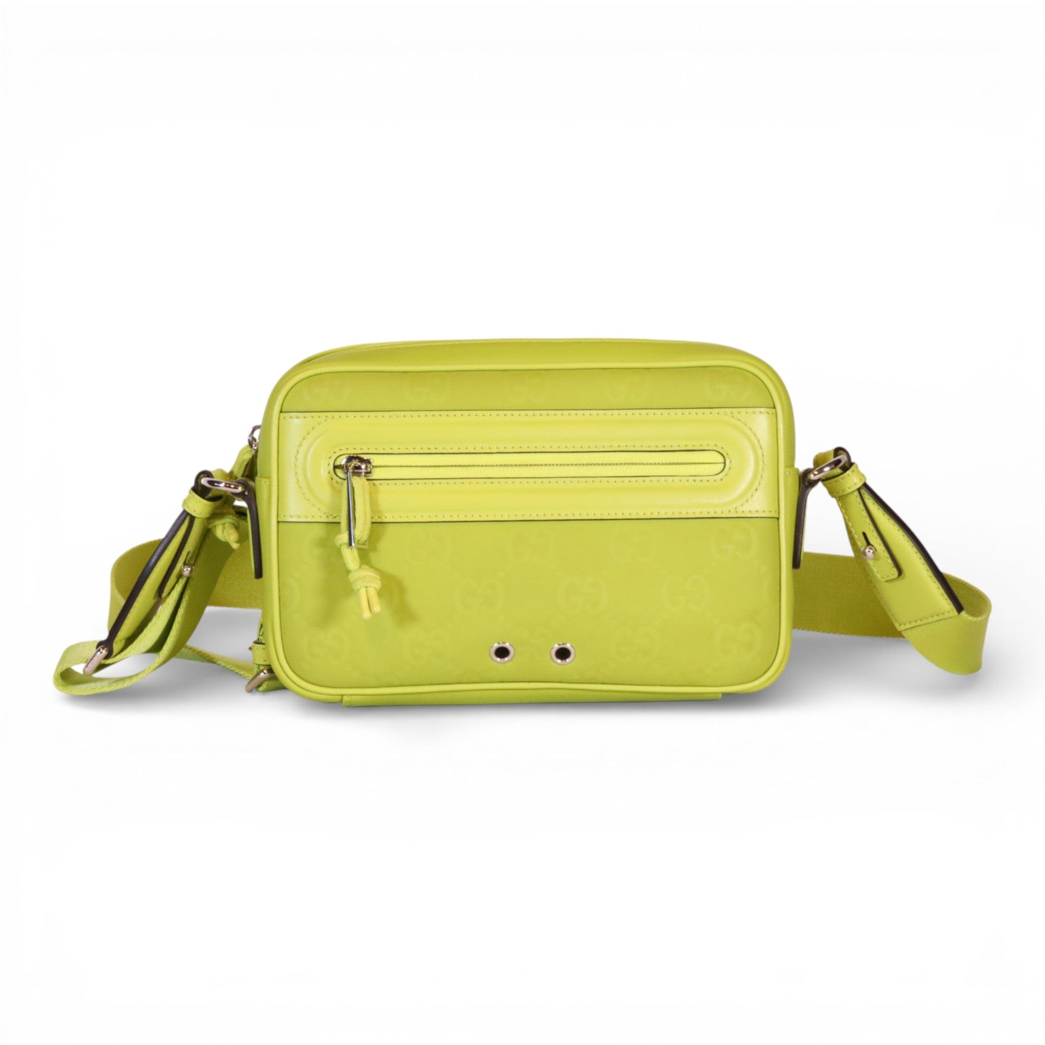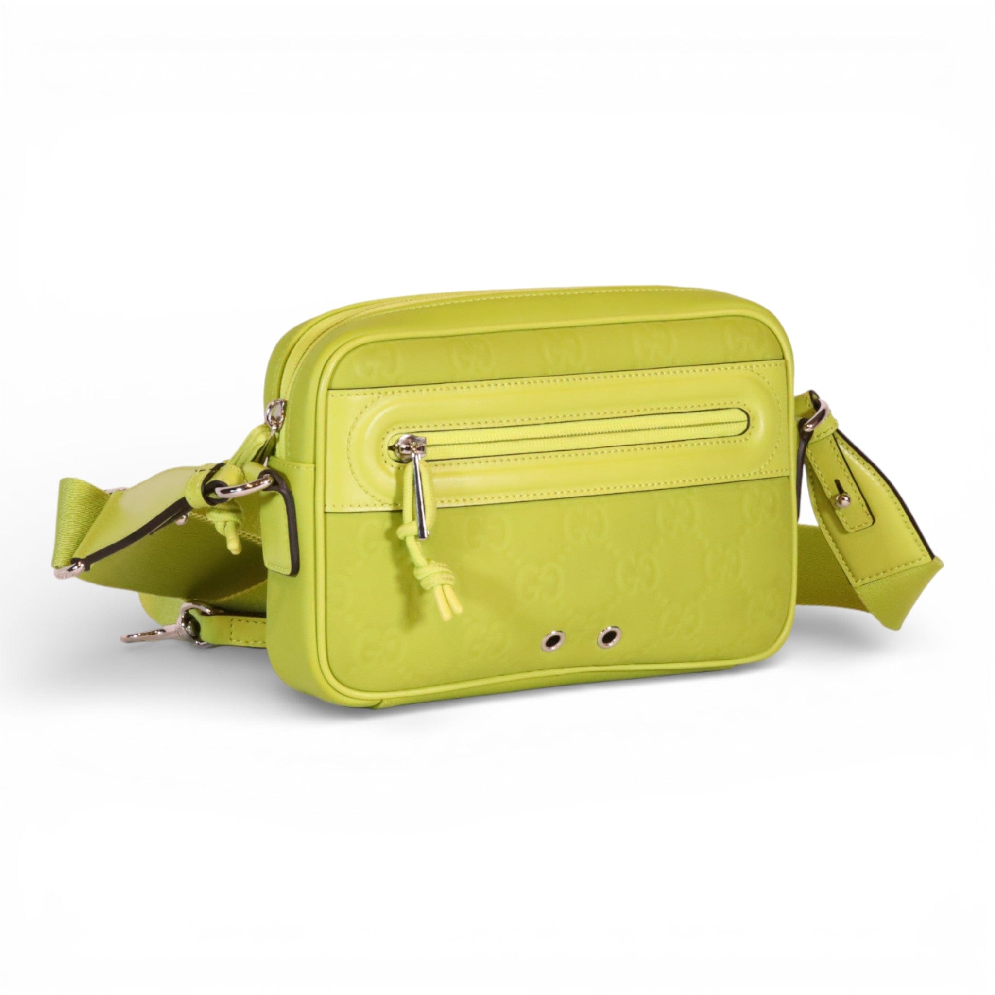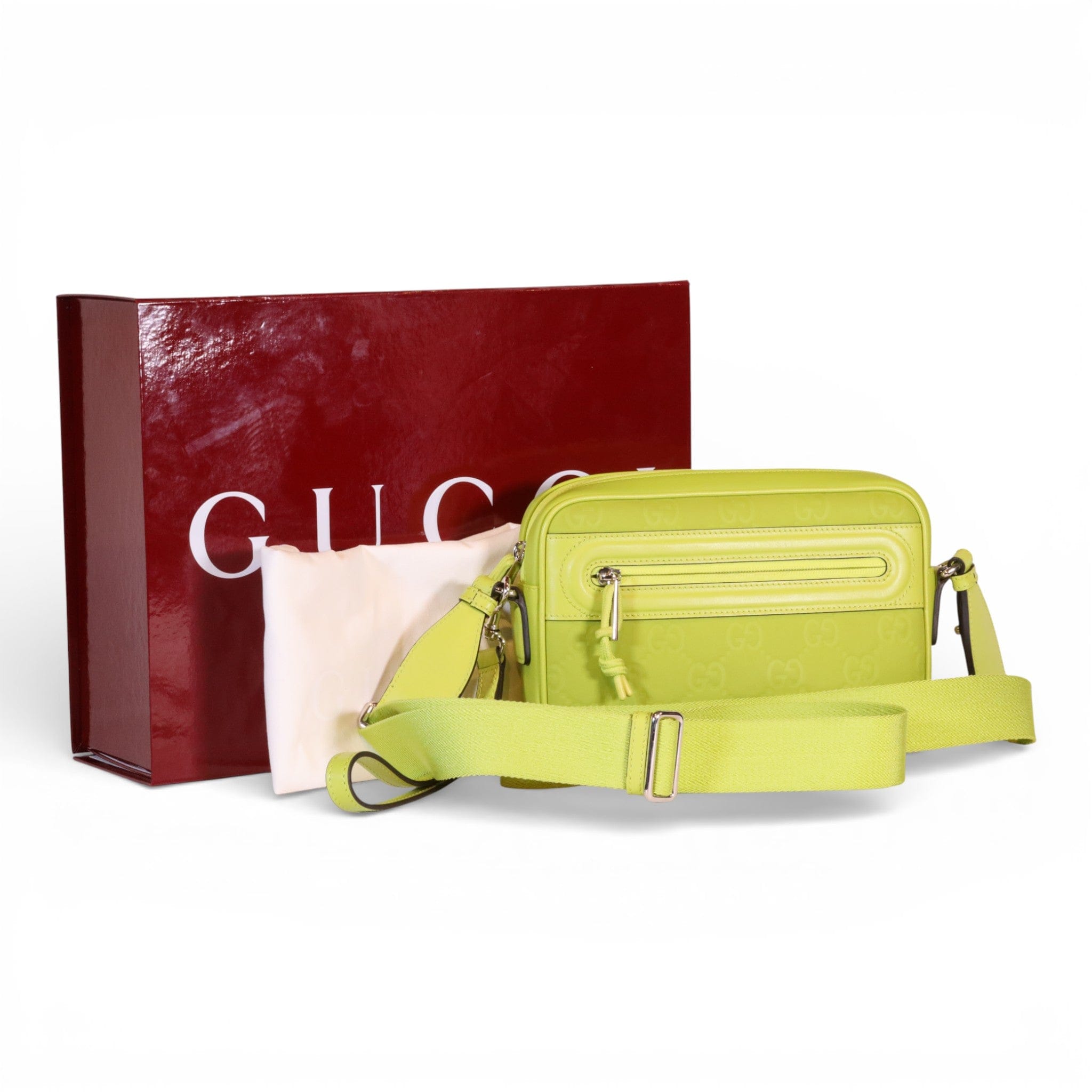 Elevate your accessory collection with this pre-owned Gucci Edge Small Crossbody in striking lime green rubberized leather. Meticulously maintained in excellent condition, this compact silhouette delivers contemporary style with the iconic Gucci aesthetic. The durable rubberized finish resists daily wear while maintaining its vibrant hue, making it an investment piece that transitions seamlessly from day to evening. Includes original box and dust bag for complete provenance and storage. A refined choice for the discerning collector seeking luxury with sustainability in mind.