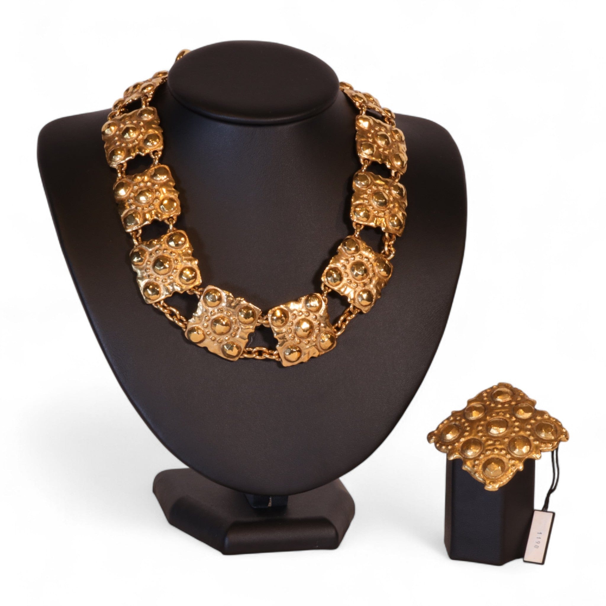 Vintage Chanel 2cc3 1988 Gold Hammered Square Necklace & Brooch