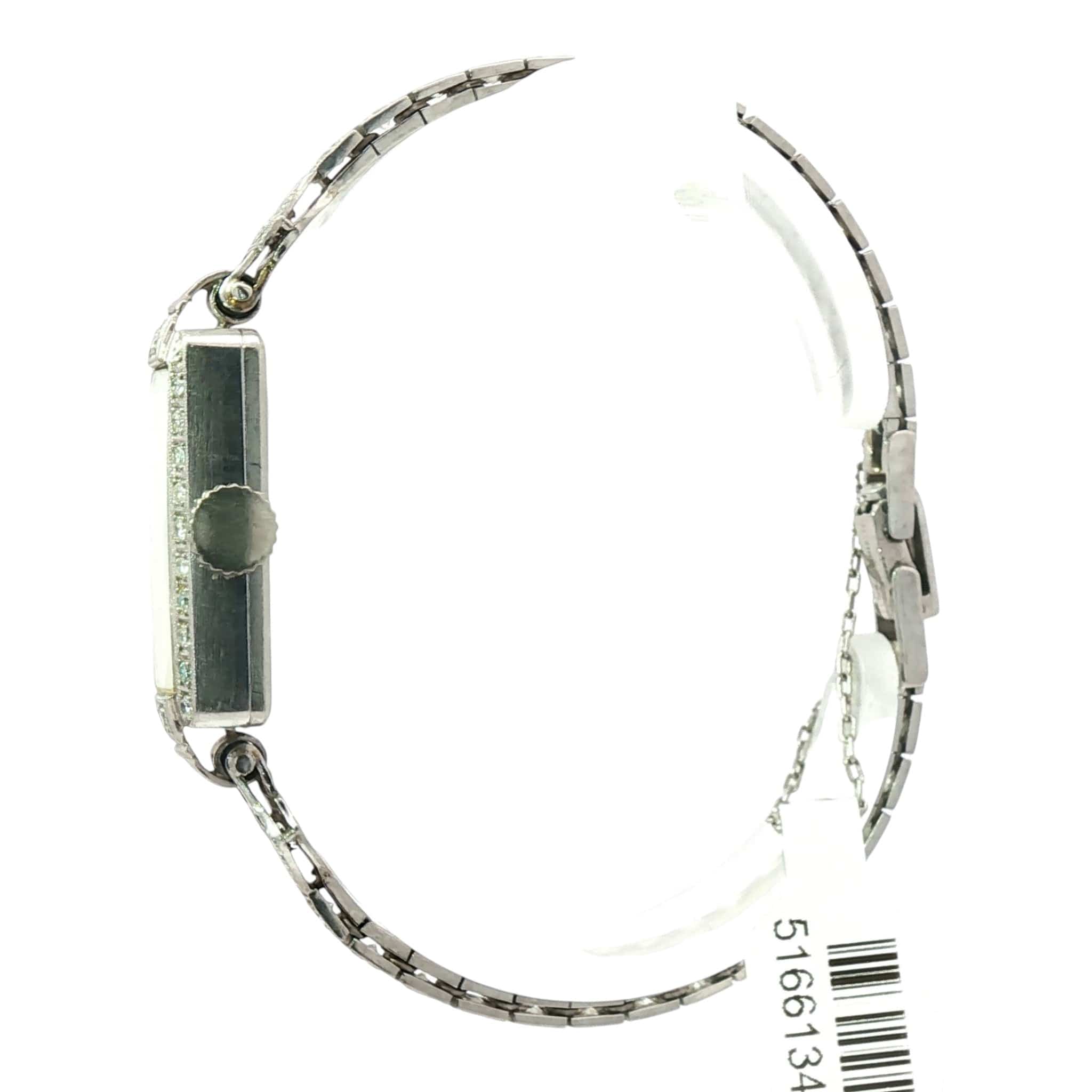 Crafted in platinum (18.9g) with diamond accents, the watch showcases the period's signature streamlined design and meticulous attention to detail.