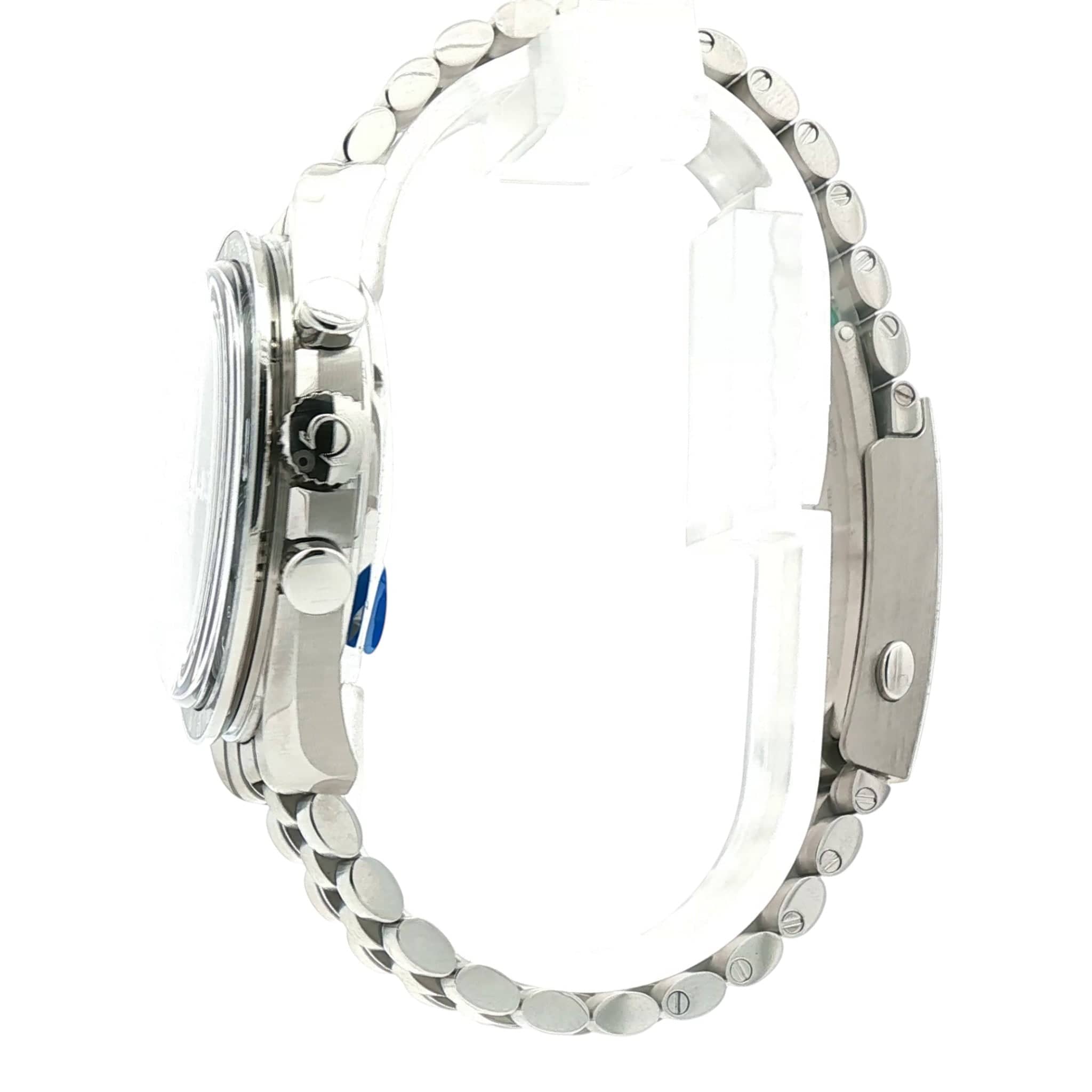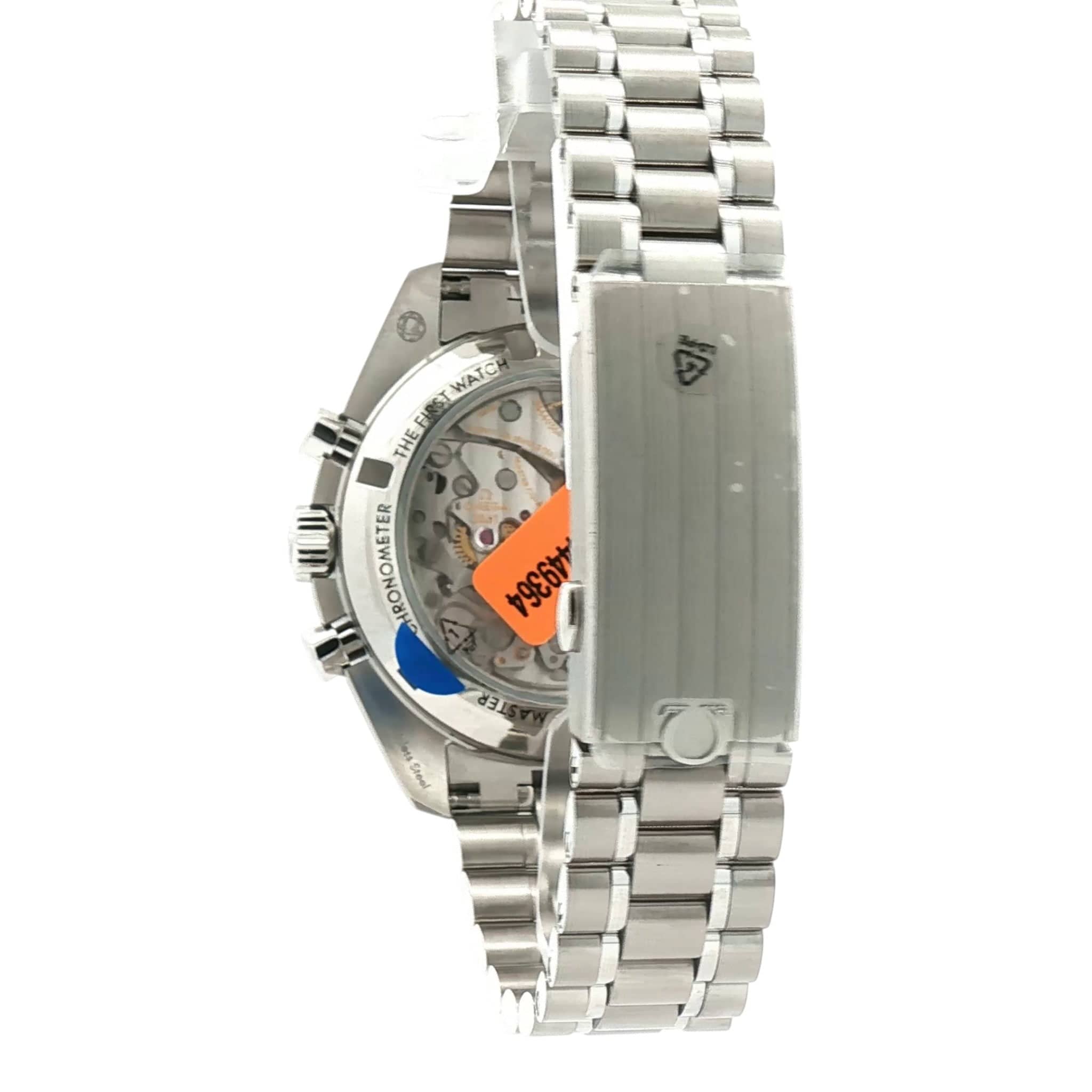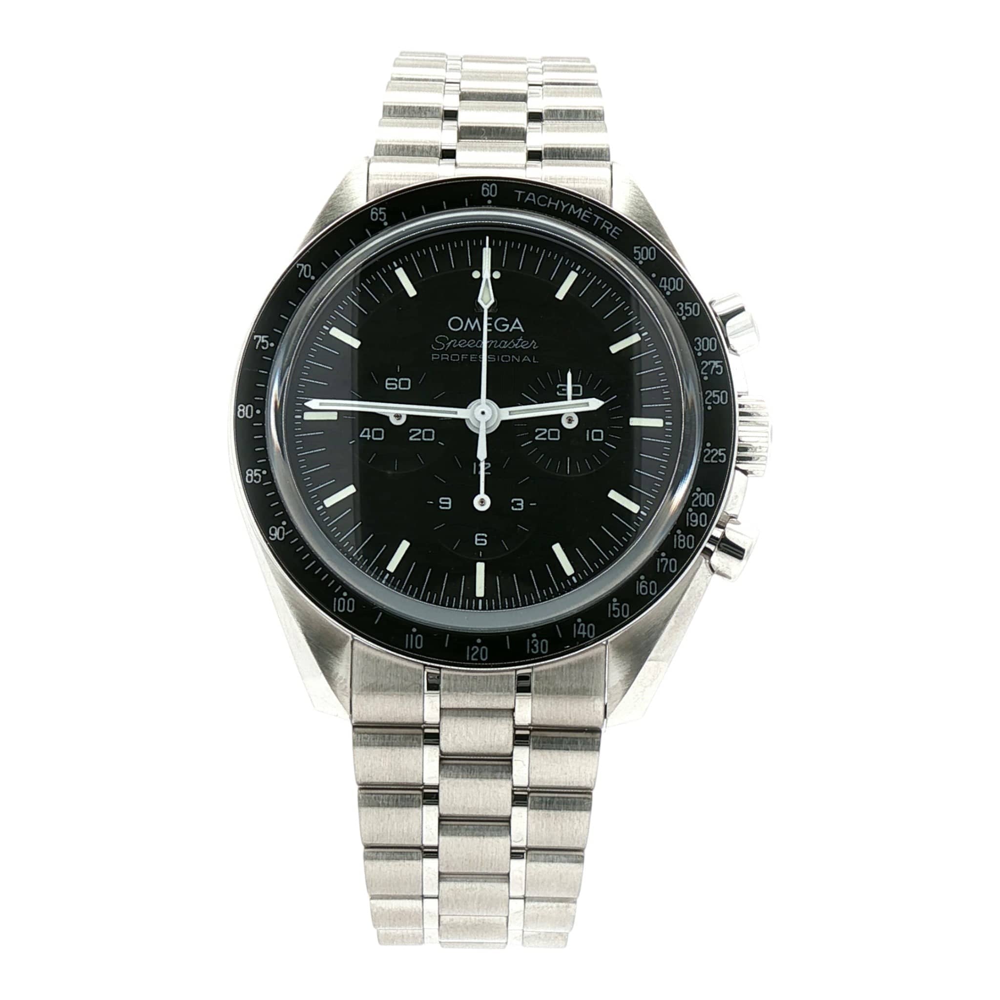 This 42 mm Moonwatch is crafted from stainless steel and set on a polished-brushed bracelet with five arched links per row. It is equipped with sapphire crystal on both the dial side and caseback. Drawing inspiration from the 4th generation Speedmaster worn on the lunar surface, the watch includes an asymmetrical case, a black step dial with an applied OMEGA logo, and the well-known “dot over 90” on the anodized aluminum bezel.