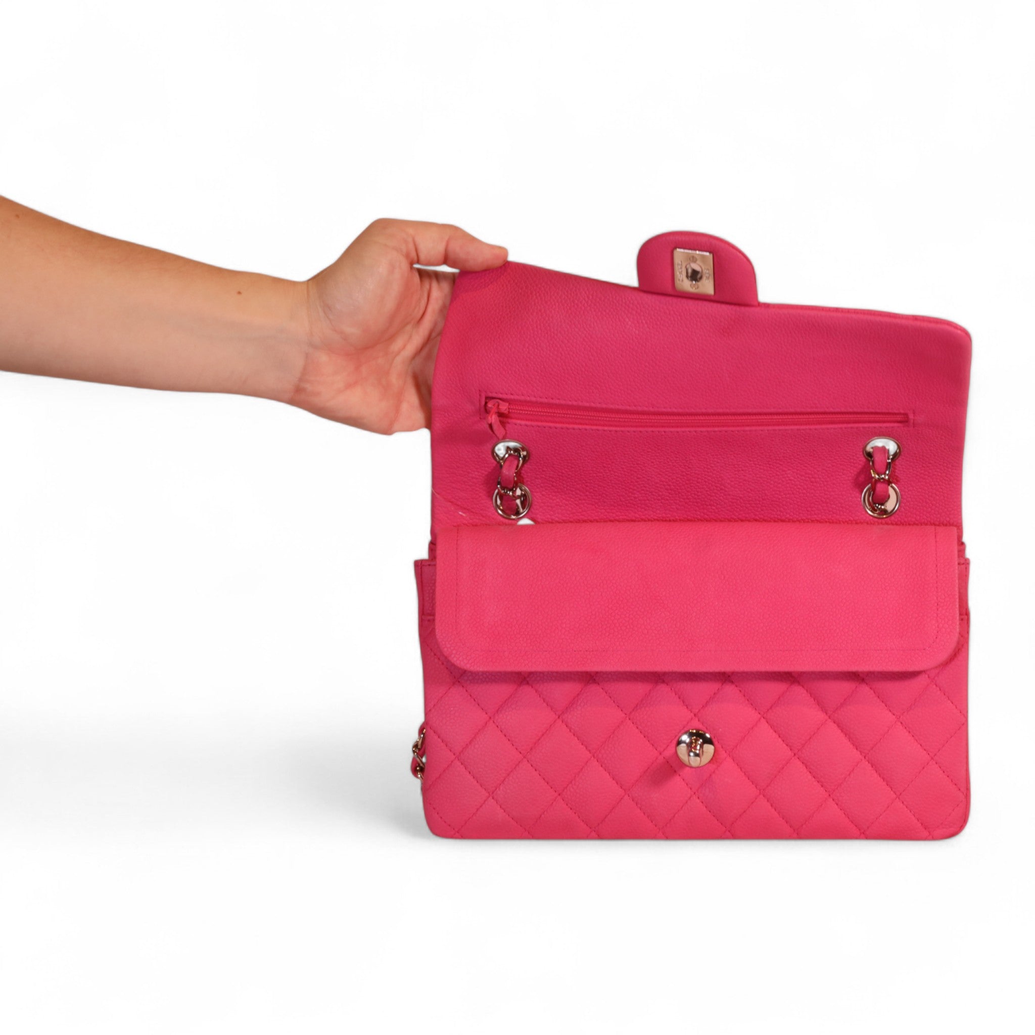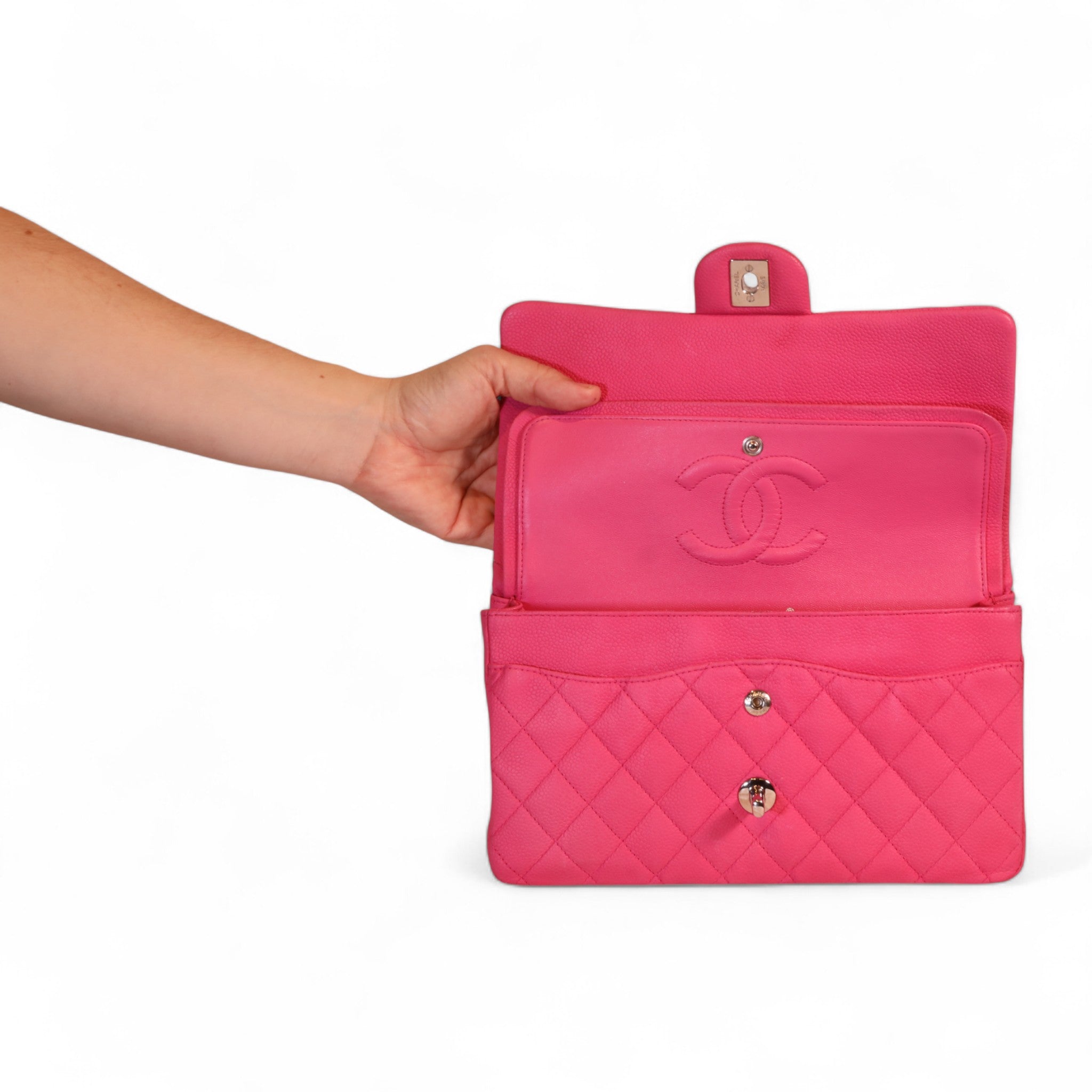 Discover elegance with the Chanel Classic Double Flap Shoulder Bag in a stunning pink quilted suede and caviar leather combination. Crafted with signature Chanel craftsmanship, this bag features the iconic quilted design and a versatile double flap closure. In like-new condition, it offers timeless style and sophistication, perfect for elevating any ensemble. A must-have piece for collectors and fashion enthusiasts alike.