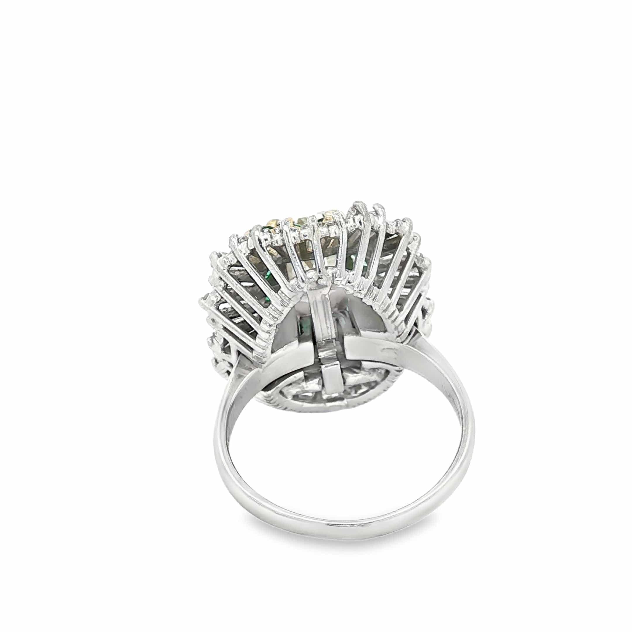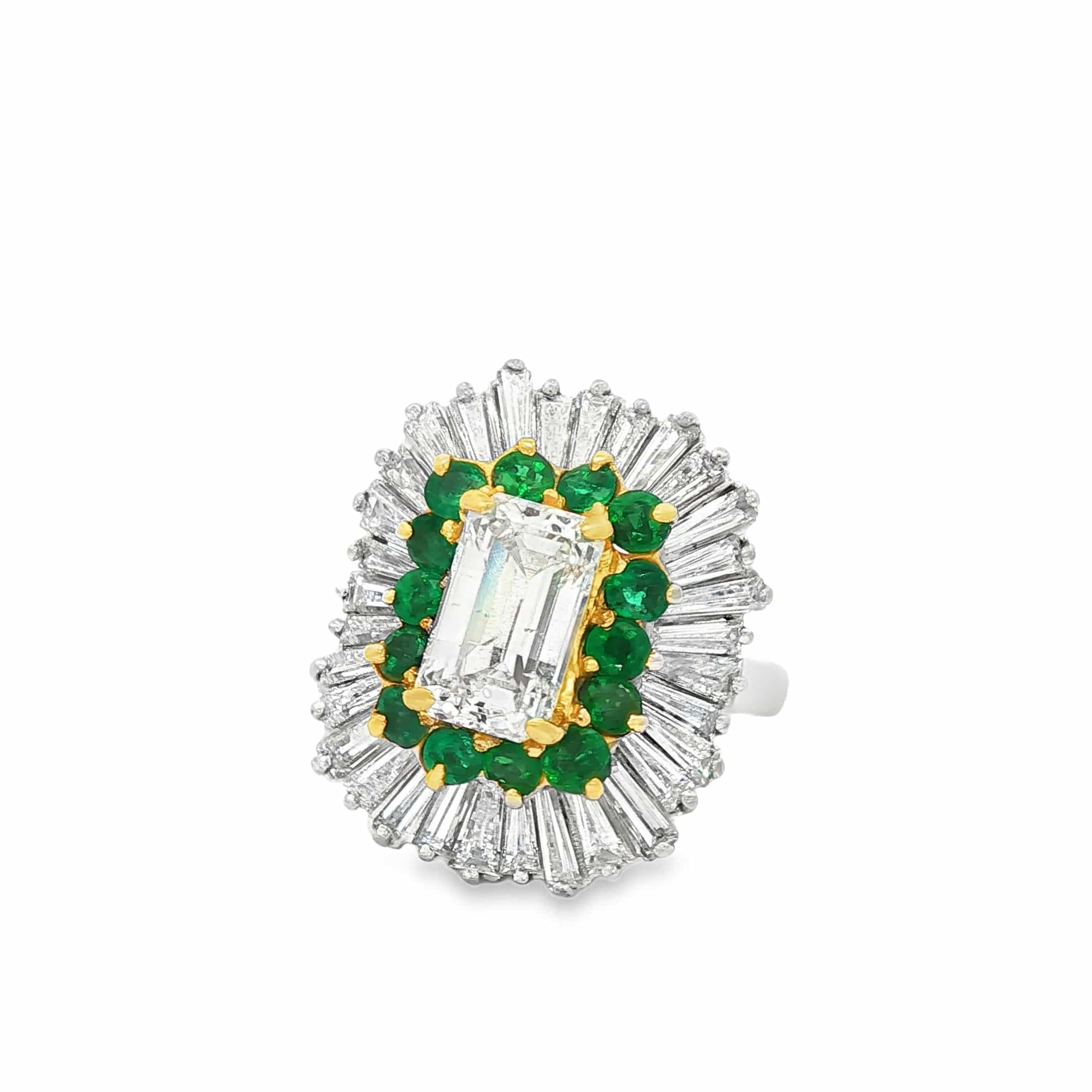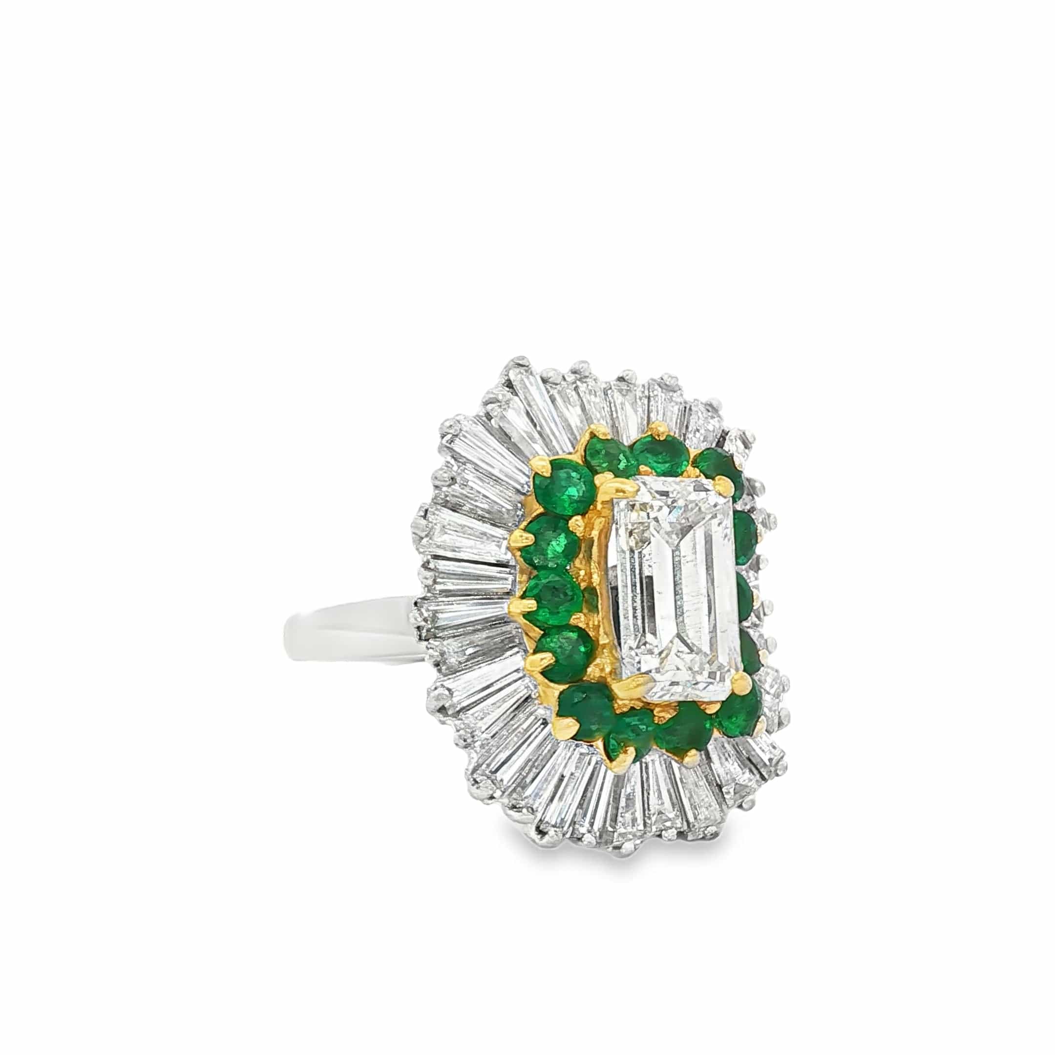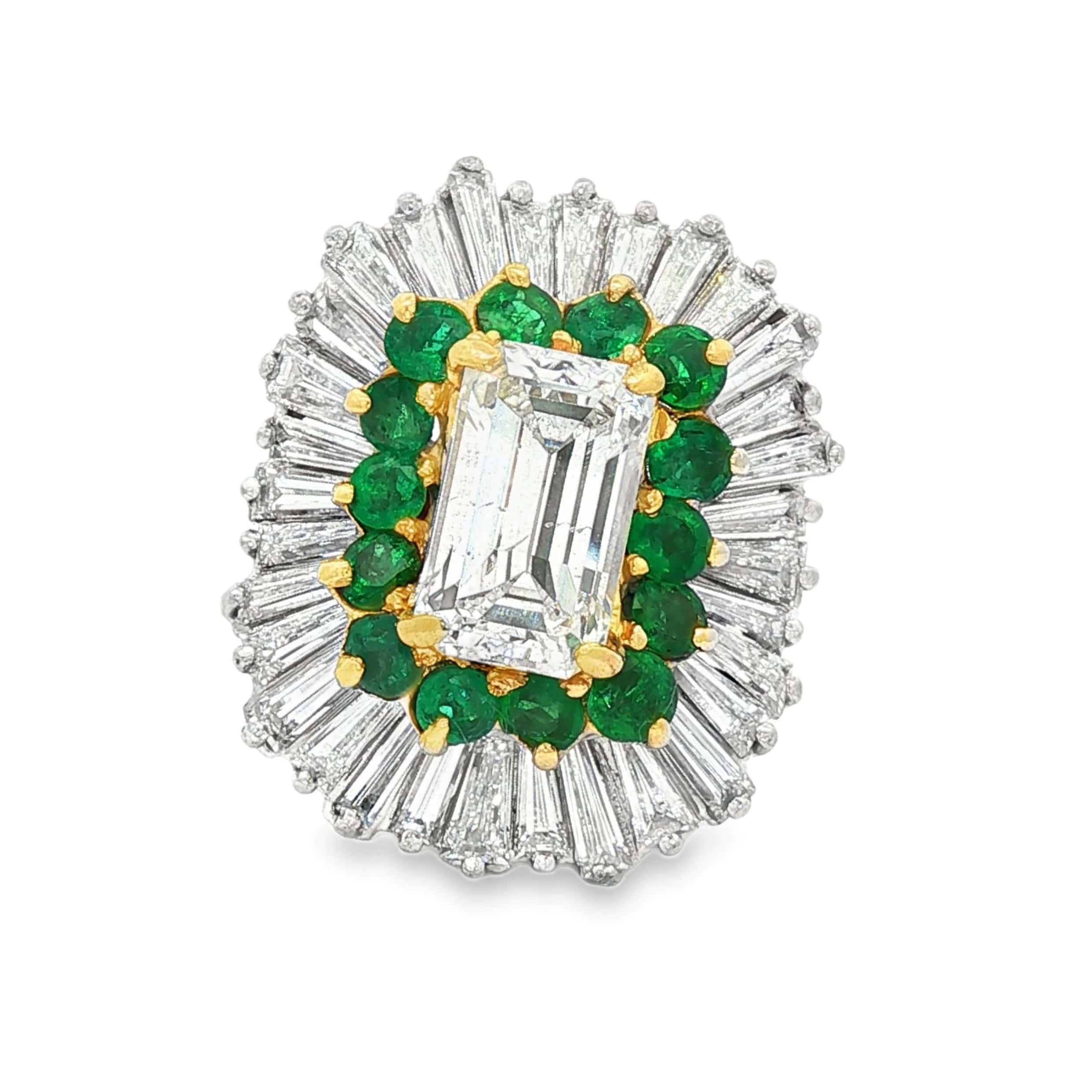 This sophisticated platinum ring features a striking 9.8x5.5mm emerald-cut diamond as its centerpiece, complemented by 30 tapered baguette diamonds and 14 round emeralds totaling 3.5 carats. The 2.0mm shank provides elegant proportions while maintaining structural integrity, and the piece is hallmarked in platinum for authenticity. Weighing 15.5 grams, this ring balances visual impact with wearable comfort. The combination of brilliant diamonds and vivid green emeralds creates a distinctive, refined aesthetic perfect for those seeking distinctive luxury. Currently sized at 7.0, our in-house jeweler can adjust the fit to your specifications, ensuring a perfect and lasting investment.