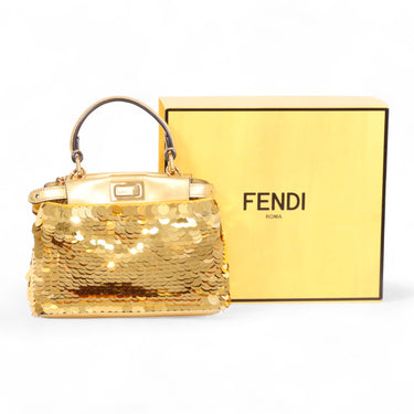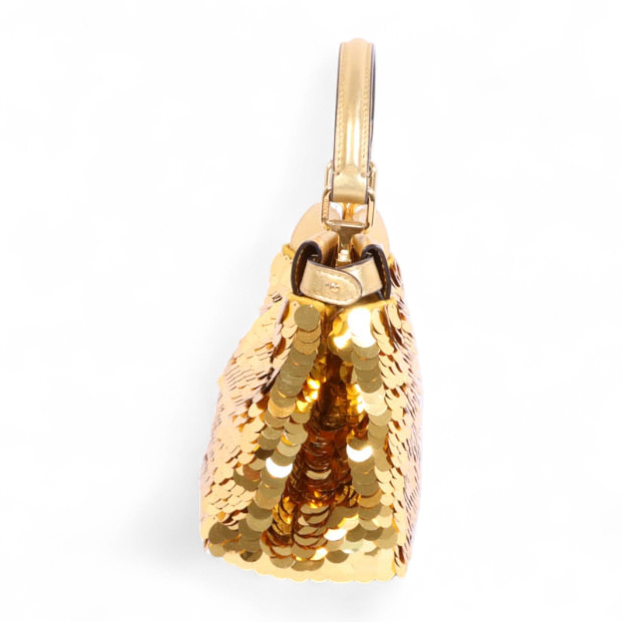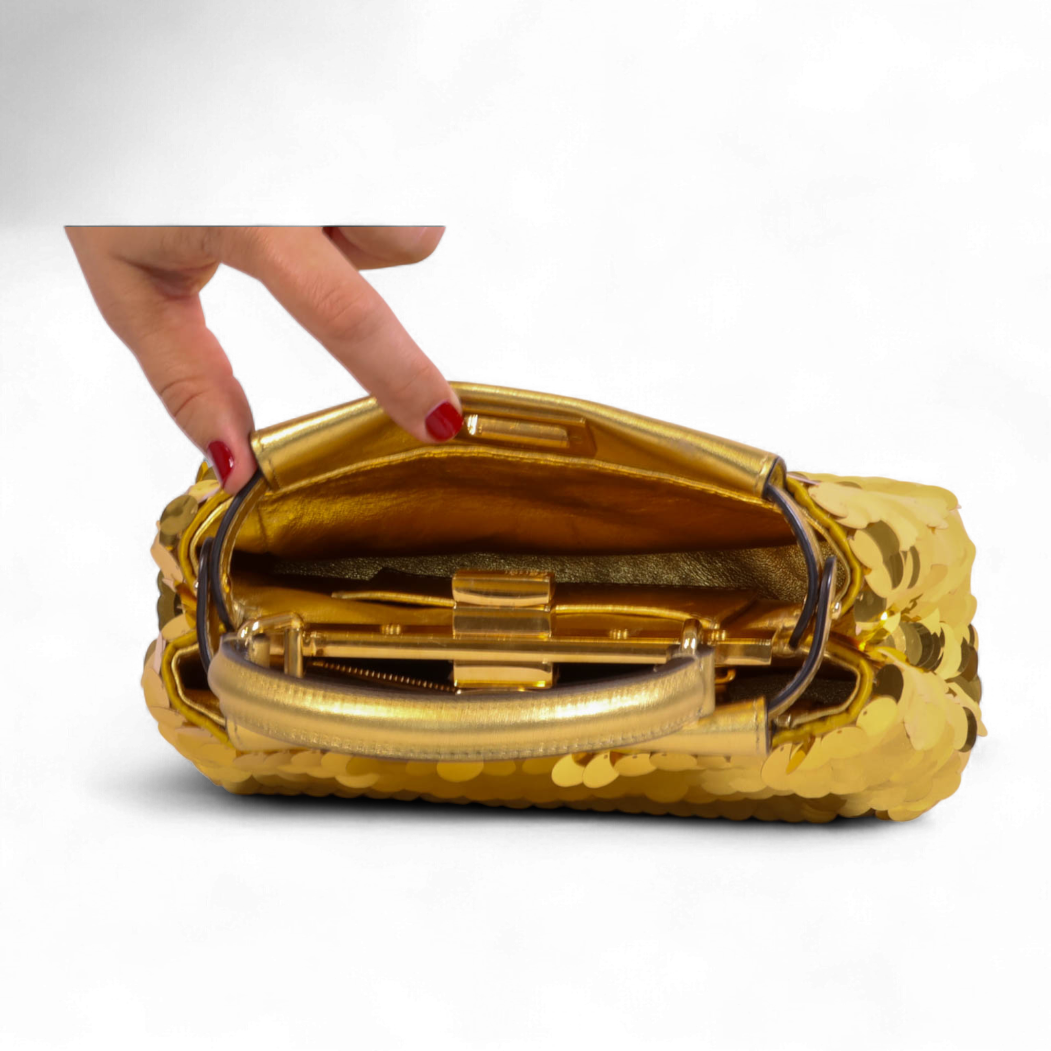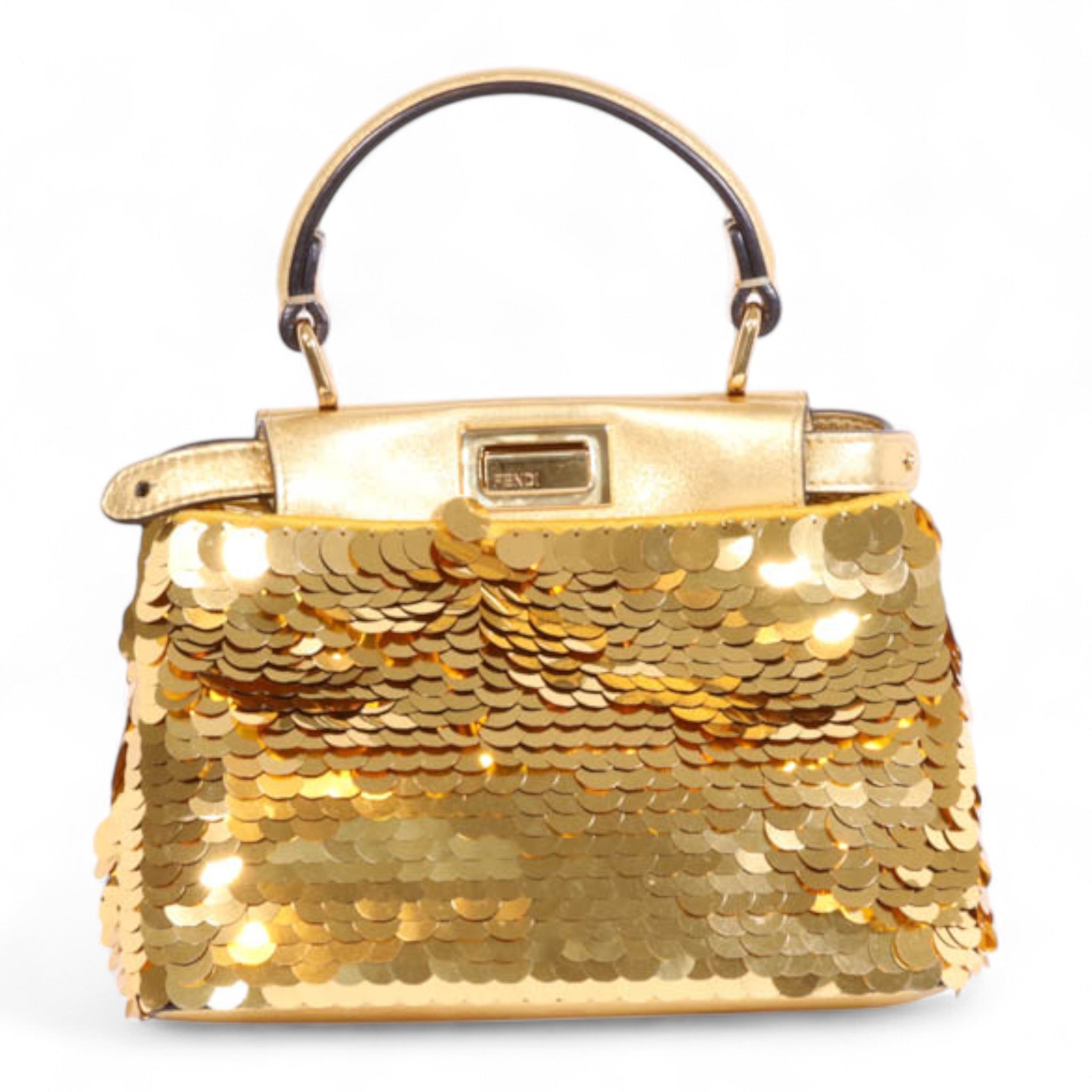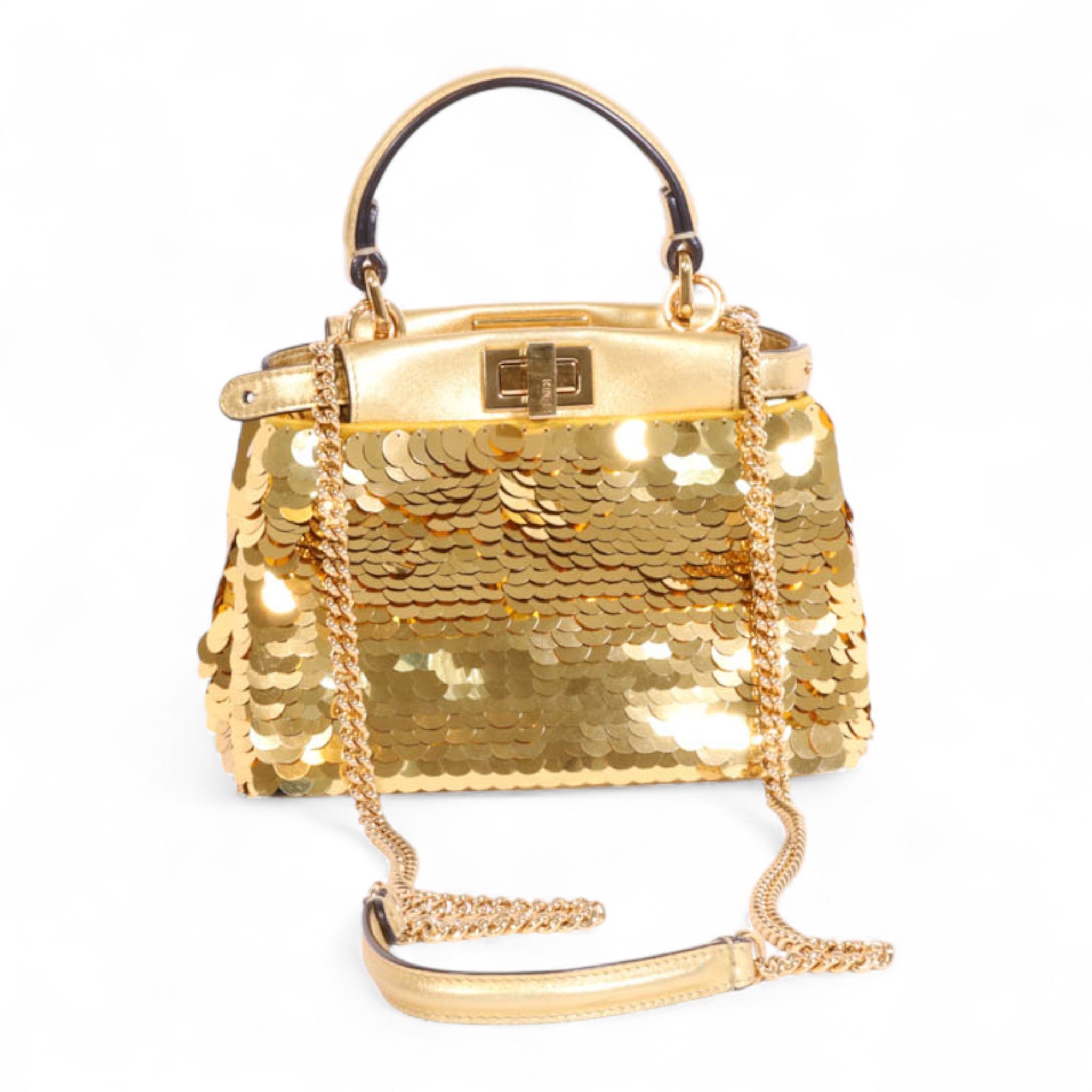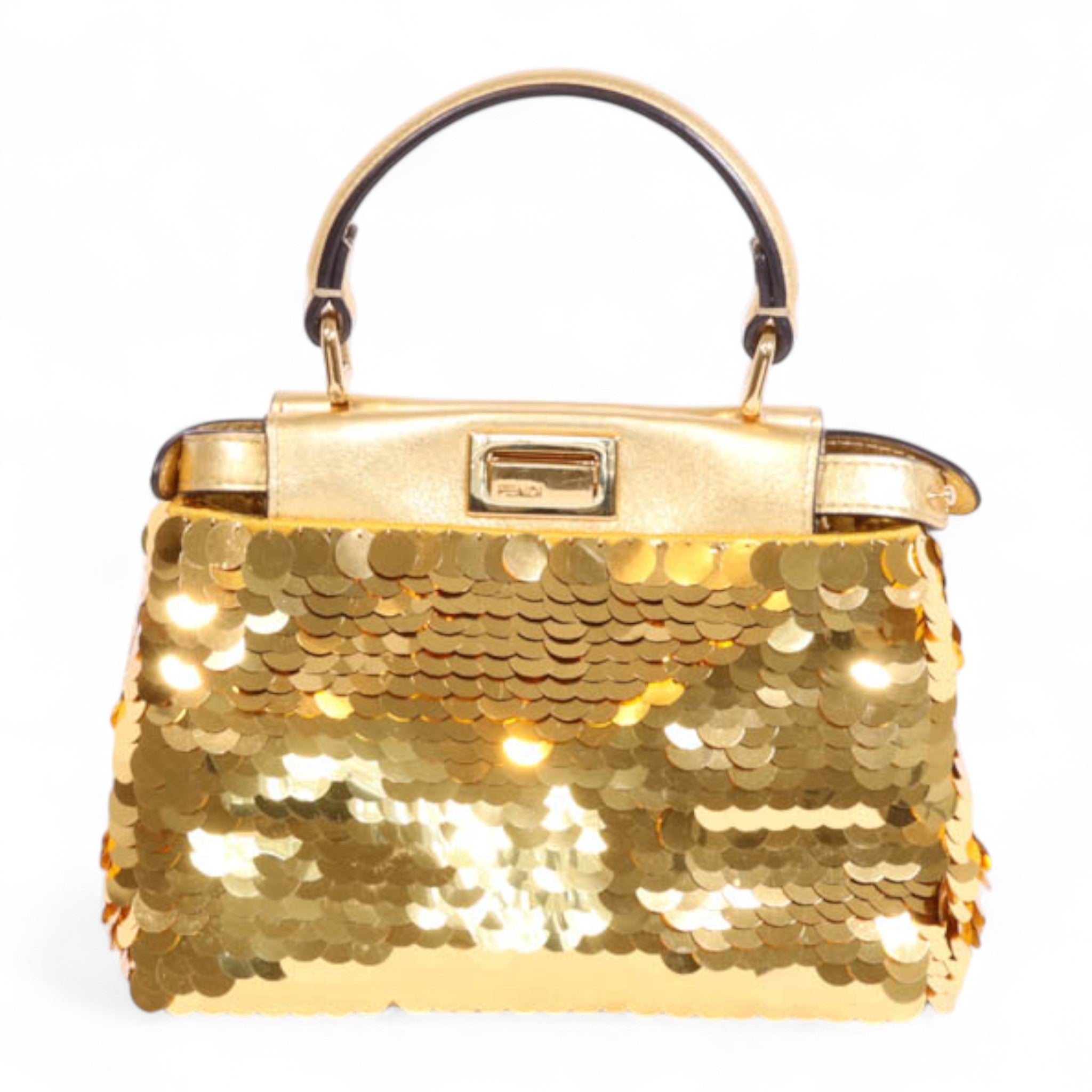 Discover luxury with the Fendi Paillette Peekaboo Mini in stunning gold. This exquisite handbag combines Fendi's classic Peekaboo silhouette with a mesmerizing sequin finish that captures the light perfectly. Crafted with precision, it features a structured top handle and a detachable shoulder strap for versatile styling. Inside, you'll find a well-organized interior, ideal for securing your essentials with elegance. The gold-tone hardware adds a touch of glamour, making it the perfect accessory for special occasions or to elevate your everyday look. Shine with sophistication with this standout piece from Fendi.