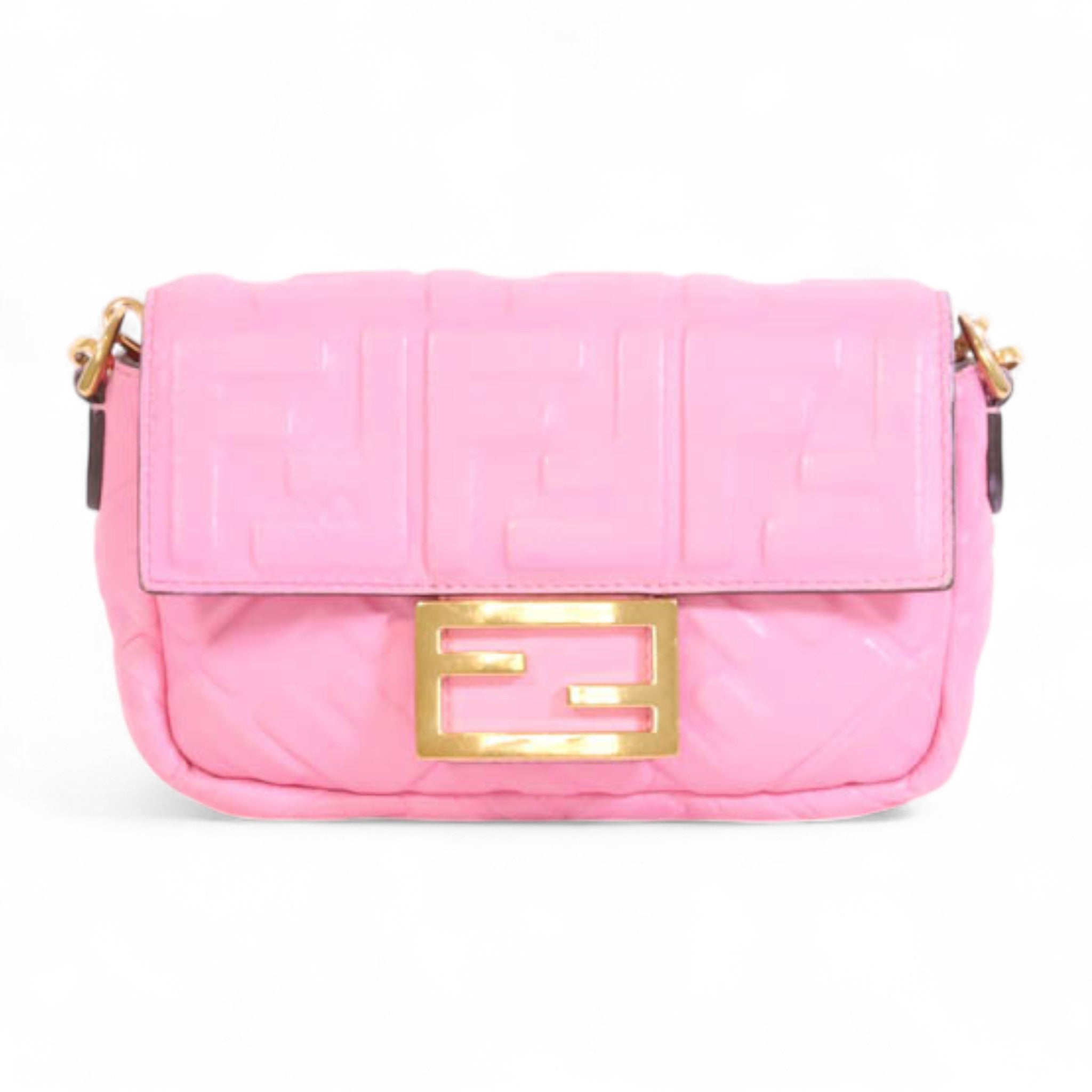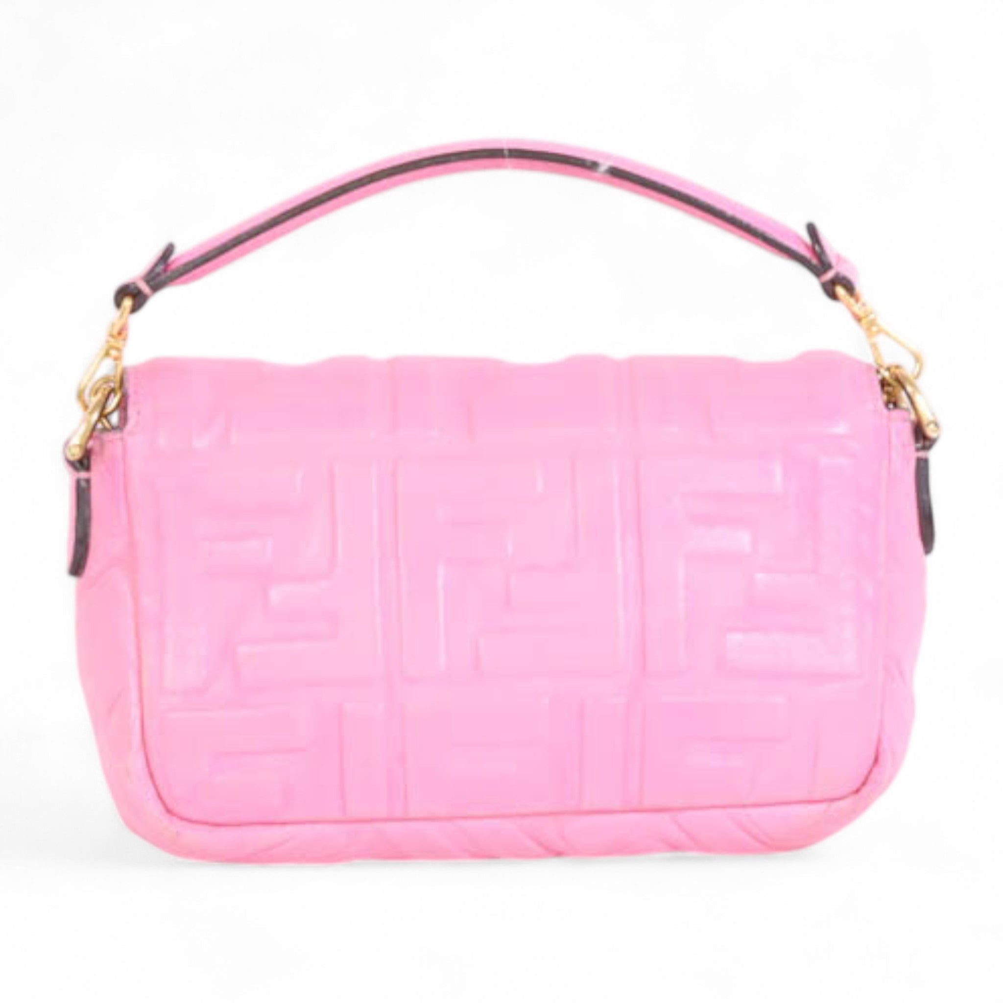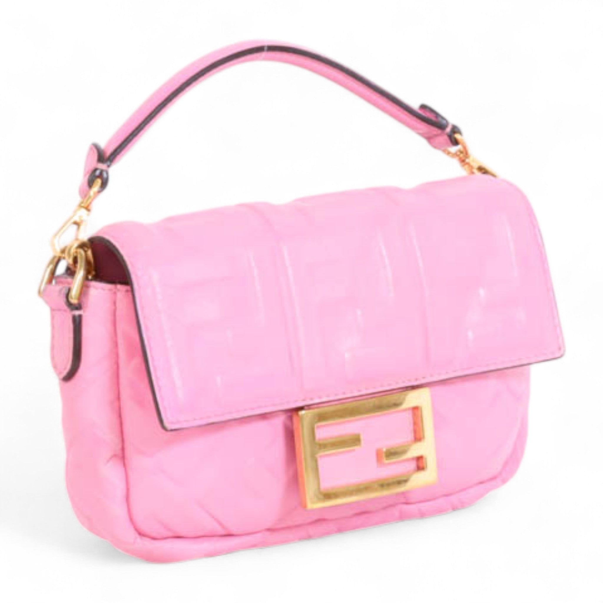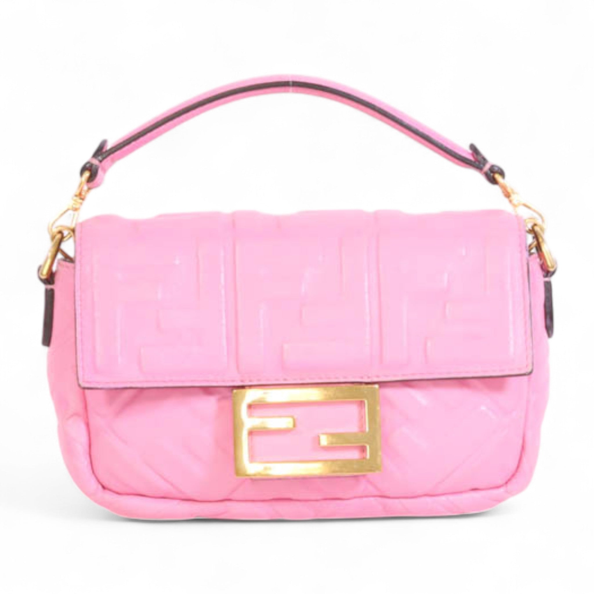 Introducing the Fendi Baguette Bag in a chic, vibrant pink. This iconic handbag exudes elegance and style, perfect for adding a playful touch to any ensemble. Crafted from premium quality materials, it features Fendi's signature embroidered logo pattern and a gold-toned emblematic clasp. Compact yet spacious enough to hold your essentials, it’s perfect for both day and night outings. Complete with a comfortable shoulder strap, this bag promises both fashion and functionality. Elevate your accessory game with this timeless piece from Fendi.