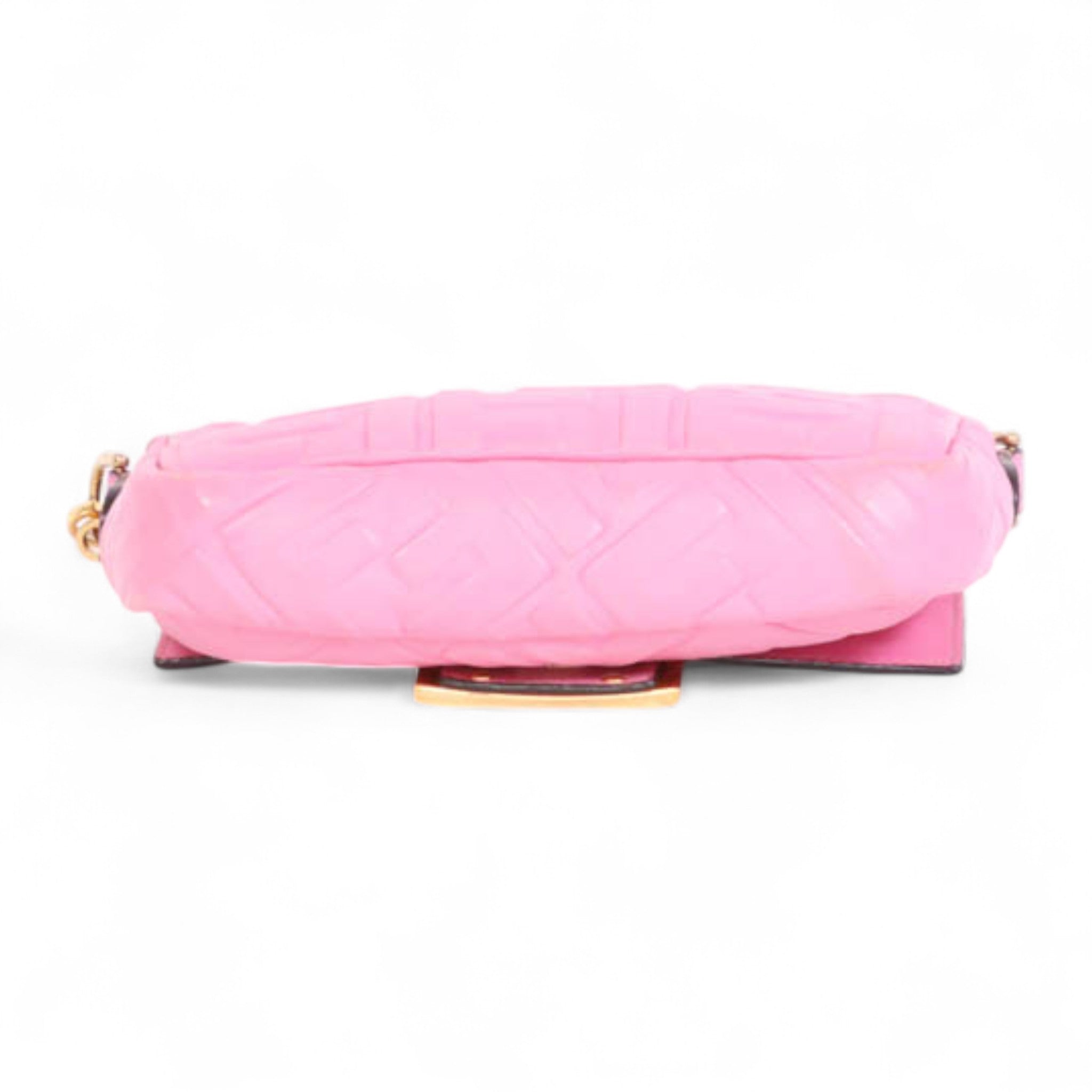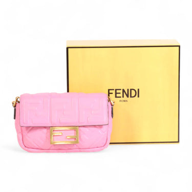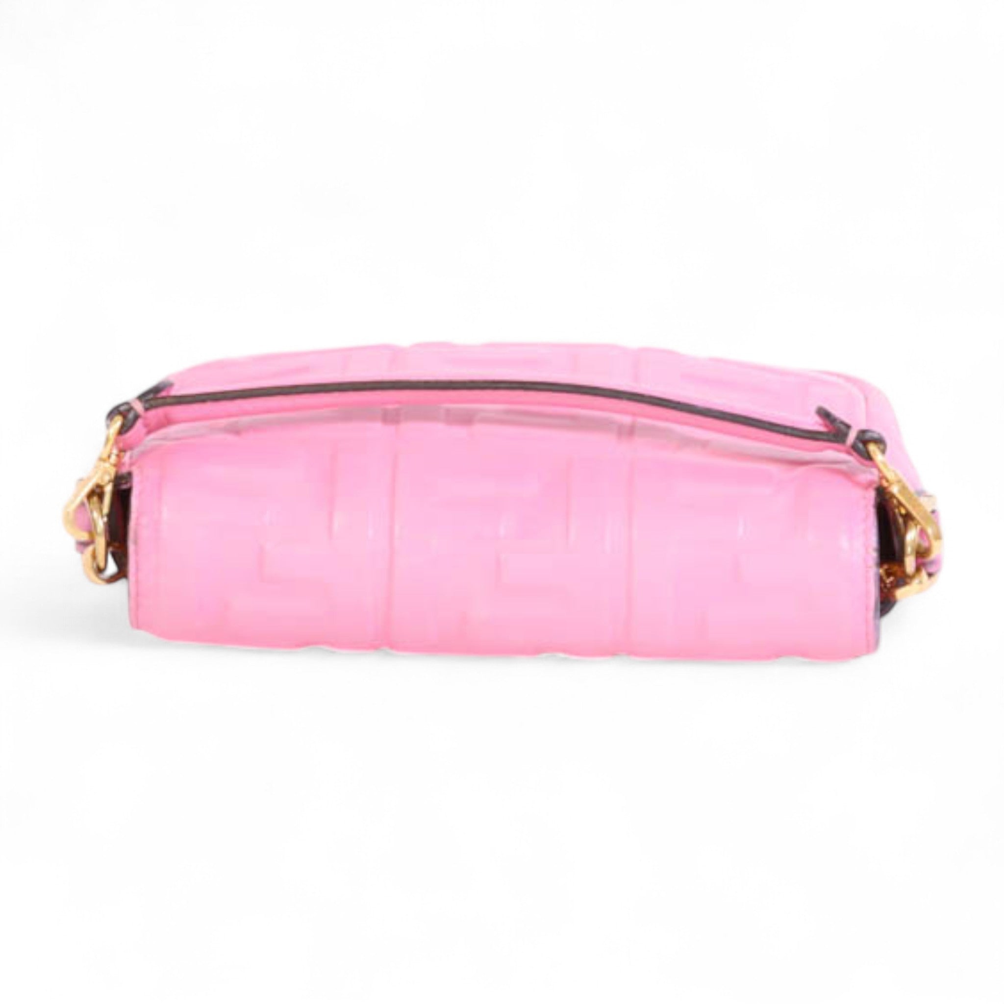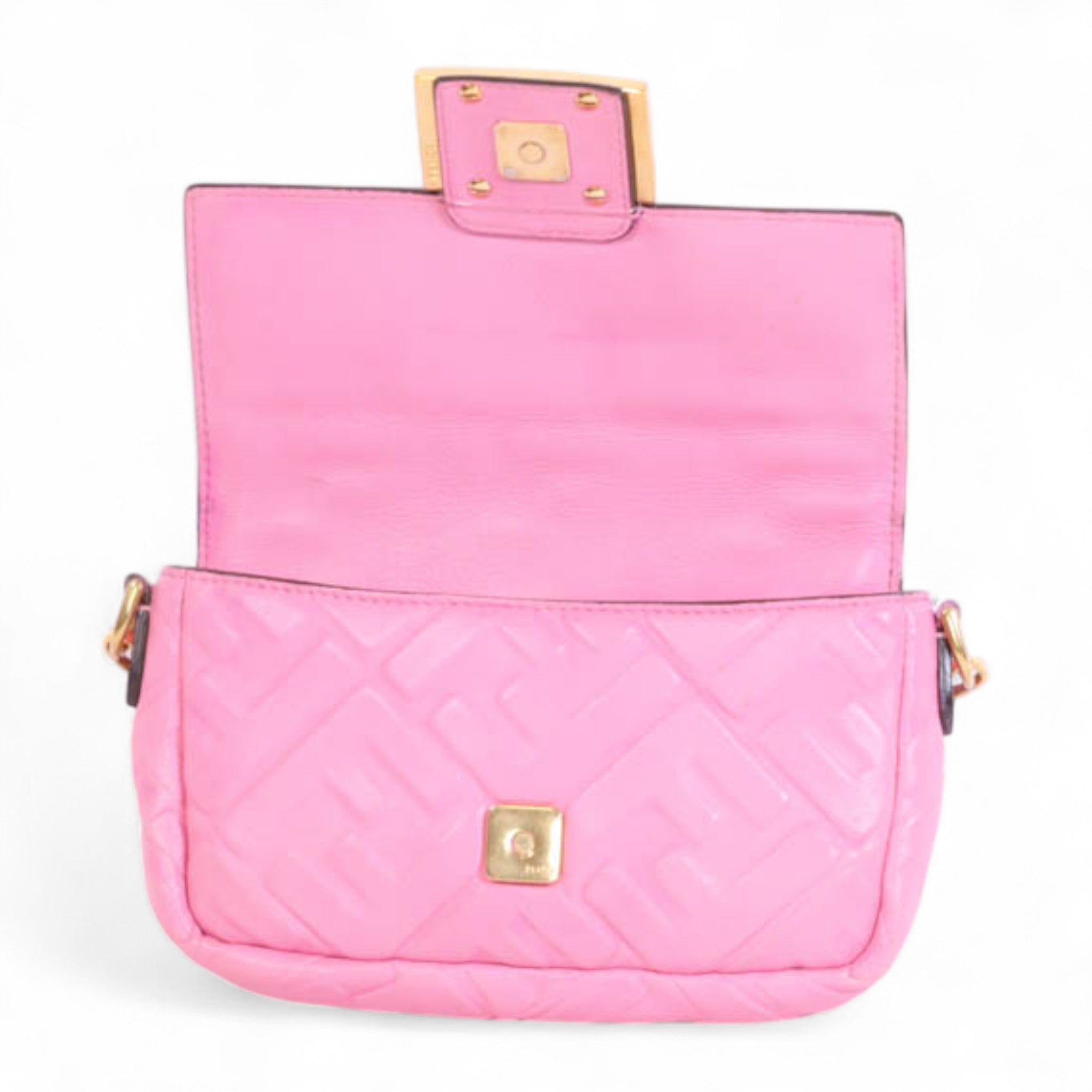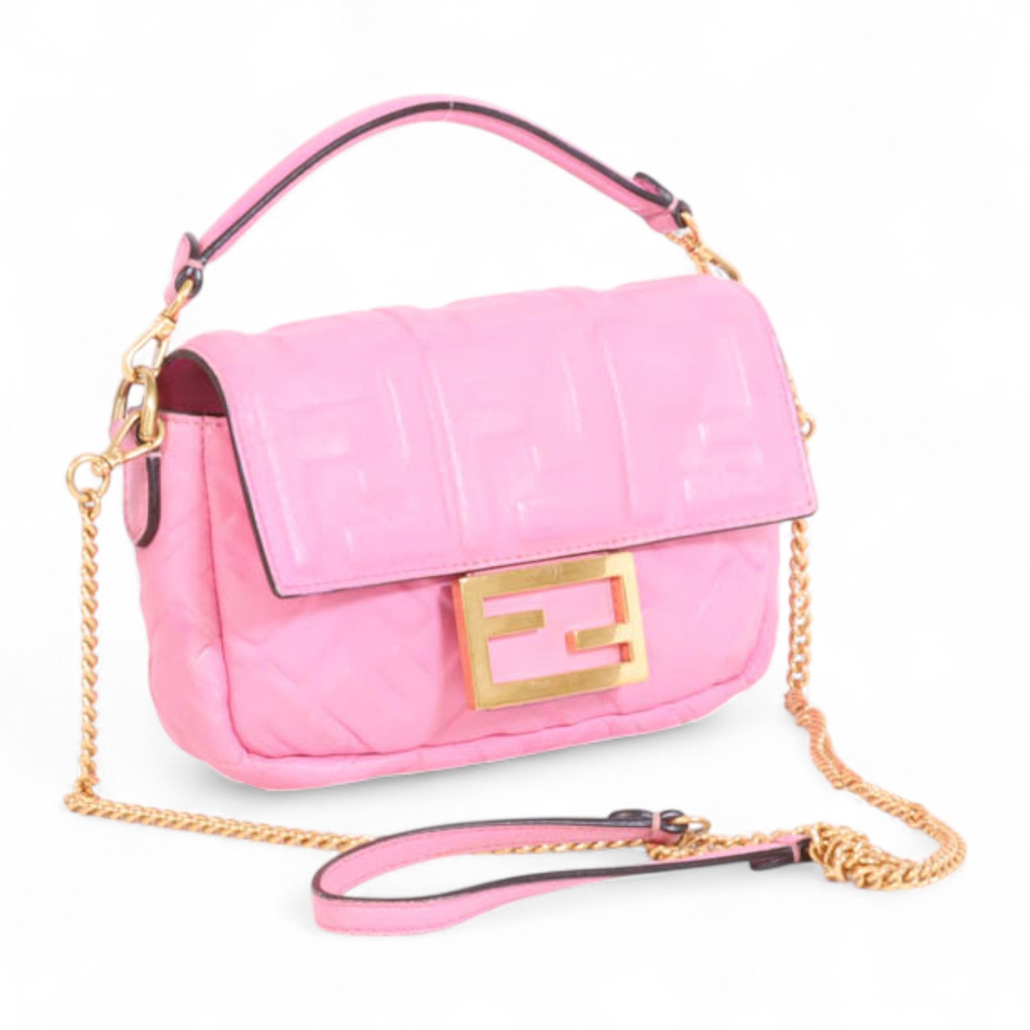 Introducing the Fendi Baguette Bag in a chic, vibrant pink. This iconic handbag exudes elegance and style, perfect for adding a playful touch to any ensemble. Crafted from premium quality materials, it features Fendi's signature embroidered logo pattern and a gold-toned emblematic clasp. Compact yet spacious enough to hold your essentials, it’s perfect for both day and night outings. Complete with a comfortable shoulder strap, this bag promises both fashion and functionality. Elevate your accessory game with this timeless piece from Fendi.