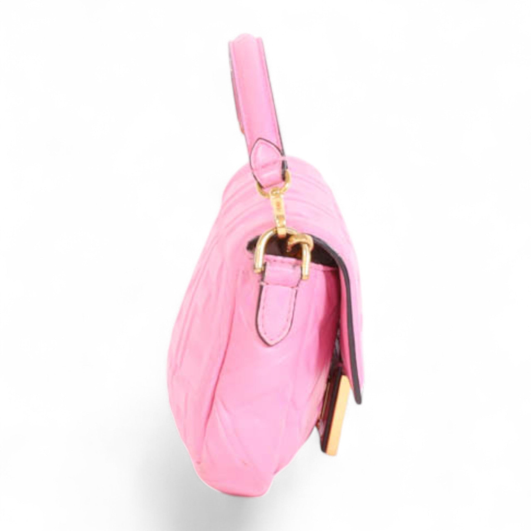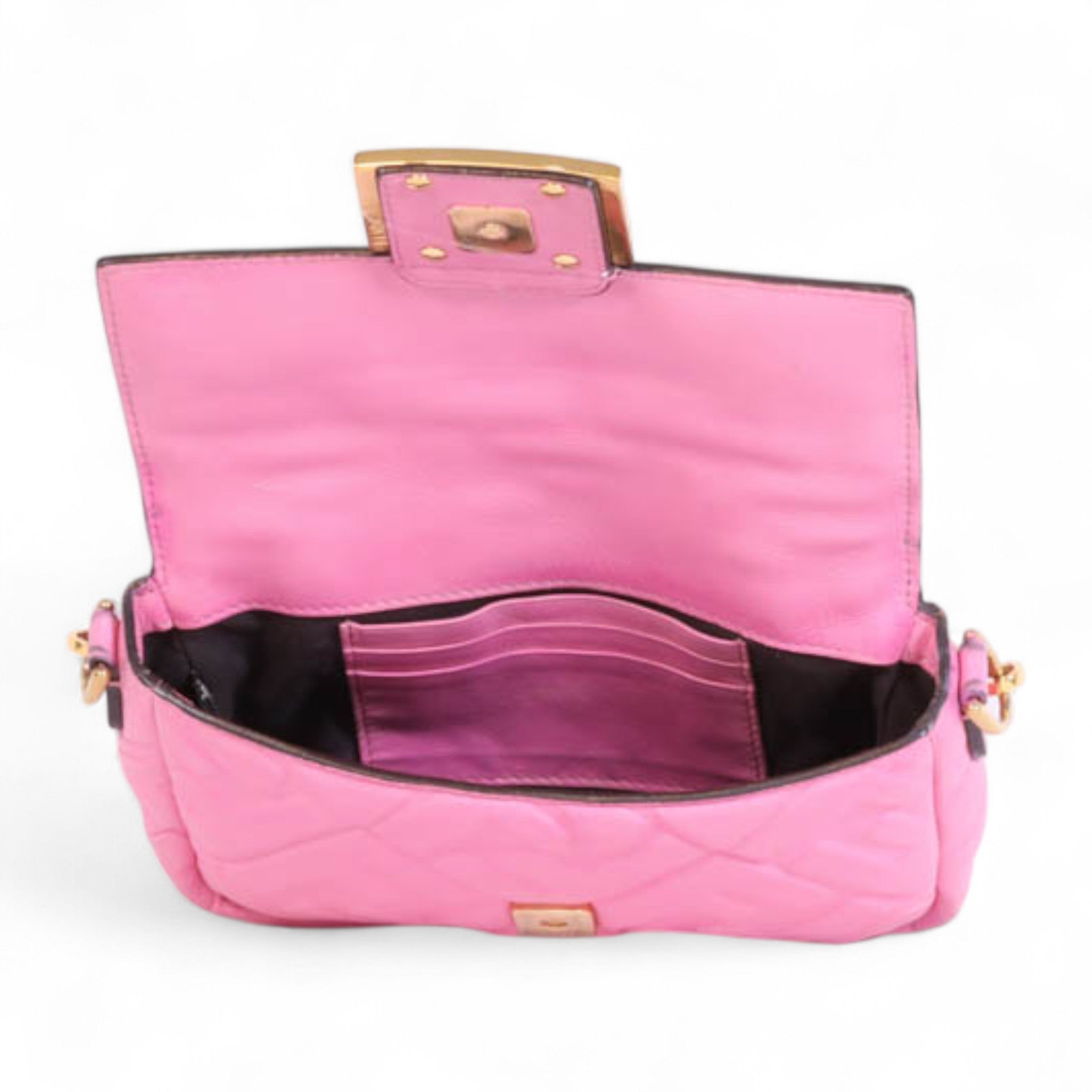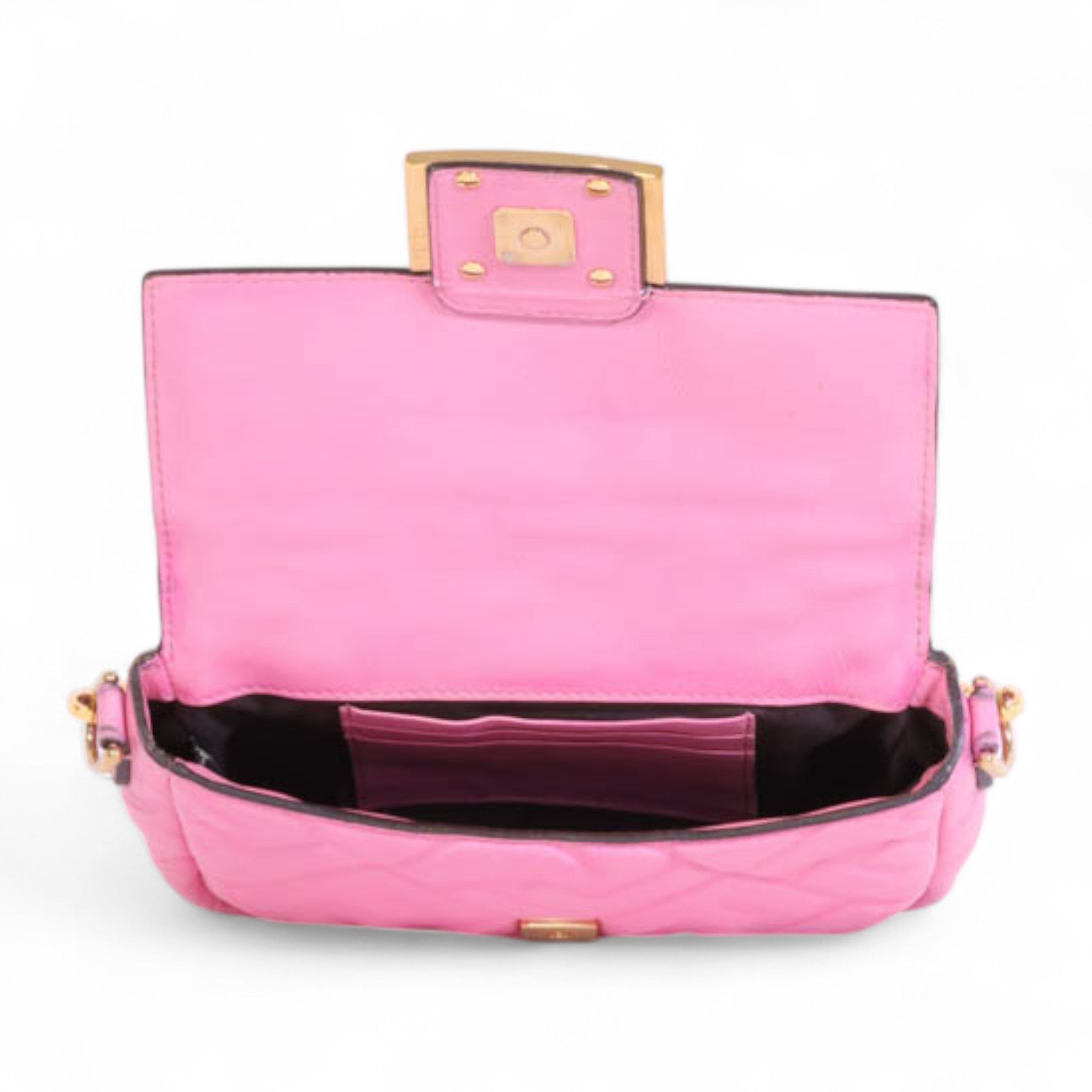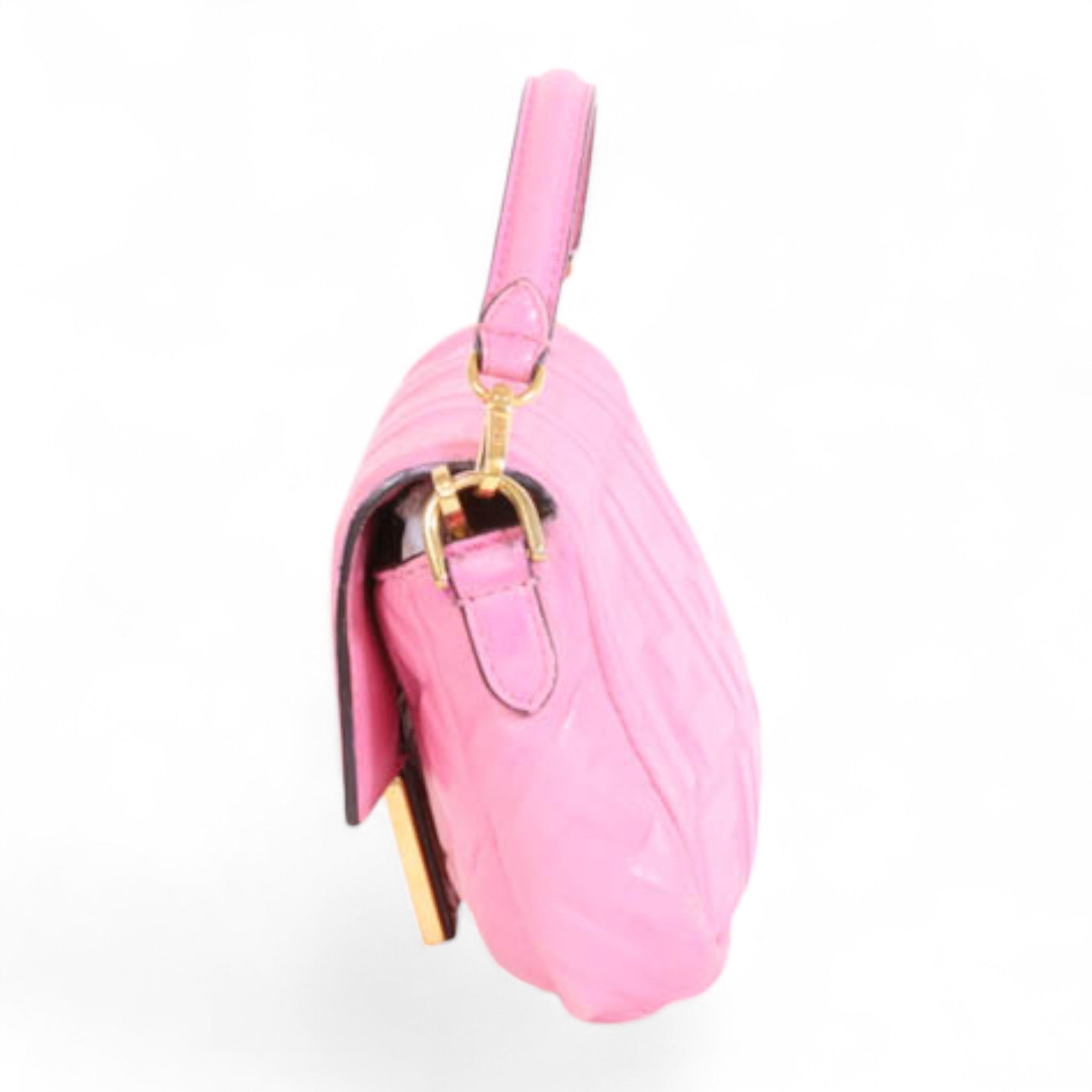 Introducing the Fendi Baguette Bag in a chic, vibrant pink. This iconic handbag exudes elegance and style, perfect for adding a playful touch to any ensemble. Crafted from premium quality materials, it features Fendi's signature embroidered logo pattern and a gold-toned emblematic clasp. Compact yet spacious enough to hold your essentials, it’s perfect for both day and night outings. Complete with a comfortable shoulder strap, this bag promises both fashion and functionality. Elevate your accessory game with this timeless piece from Fendi.