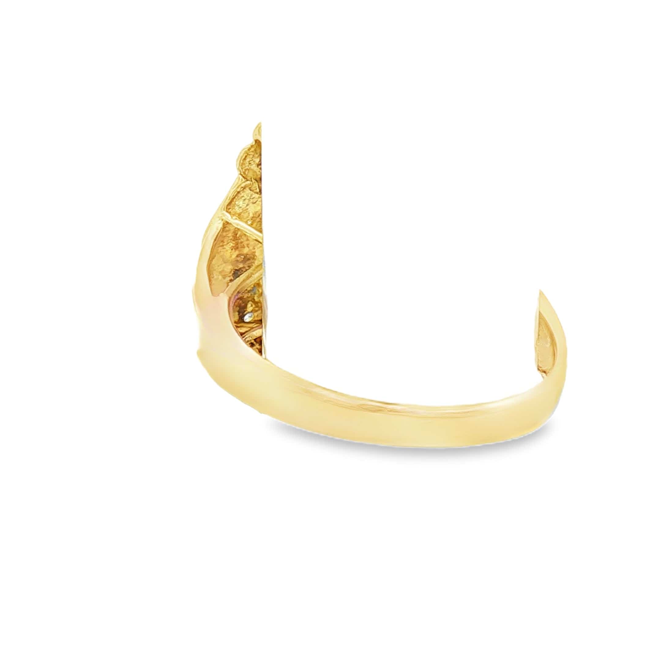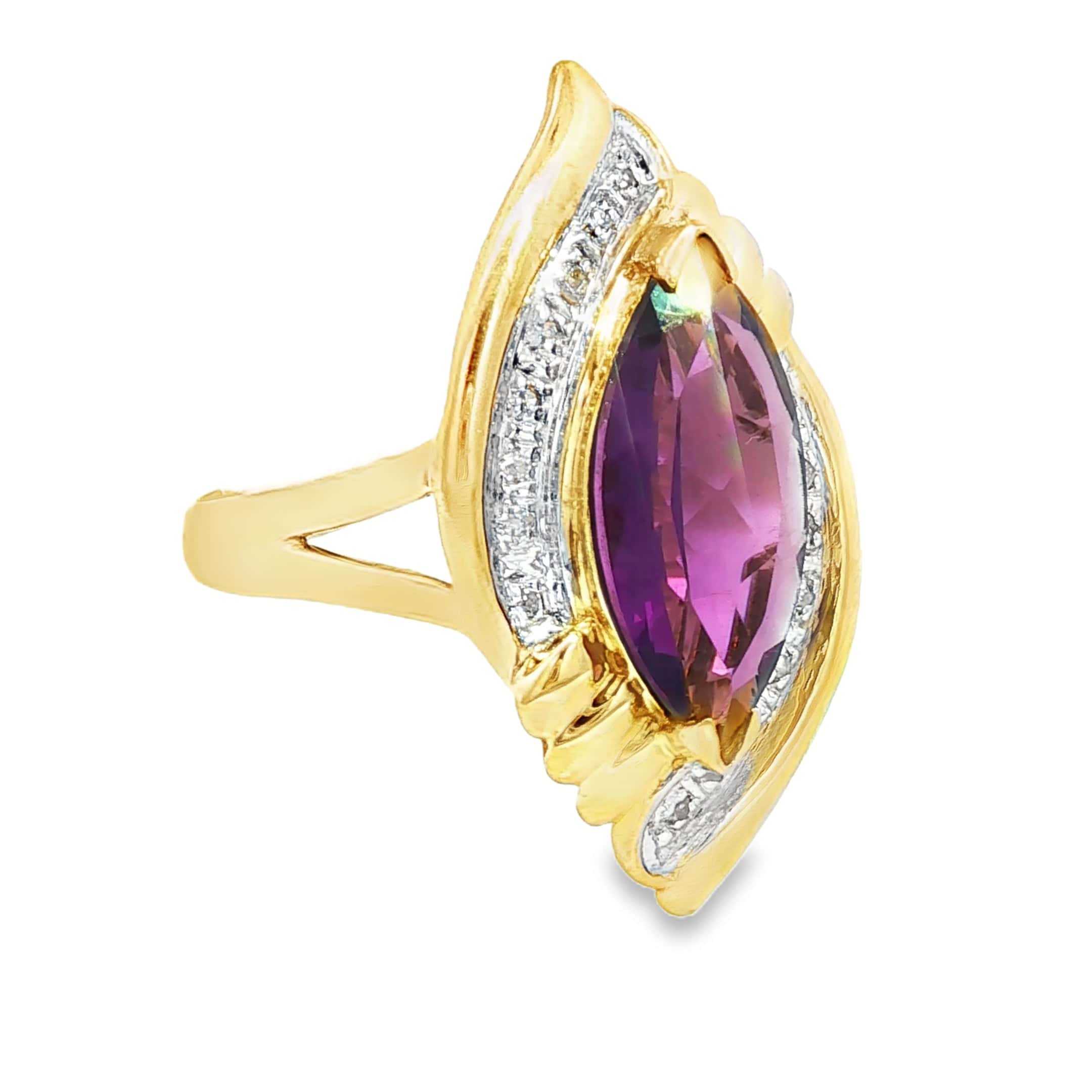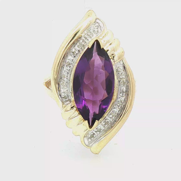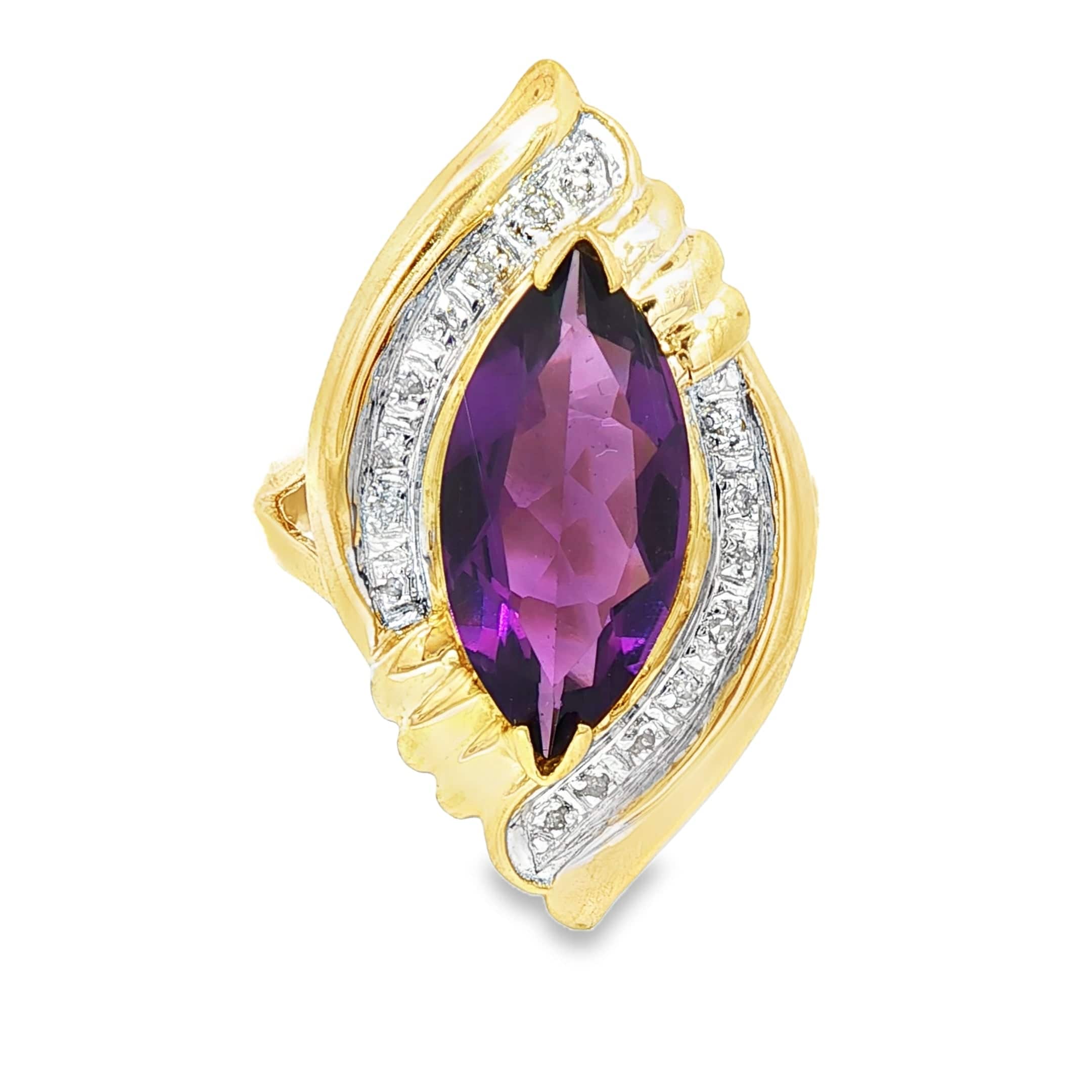 This elegant 14K yellow gold ring showcases a stunning 16x7.75mm marquise-cut amethyst in rich purple, complemented by eighteen round diamonds totaling 0.03 ctw. The refined 1.9mm shank provides a delicate foundation for this sophisticated design. Weighing 5.4 grams, the ring is sized at 6.75 and can be professionally resized by our jeweler to ensure a perfect fit. An exceptional piece that balances vibrant gemstone beauty with timeless craftsmanship.