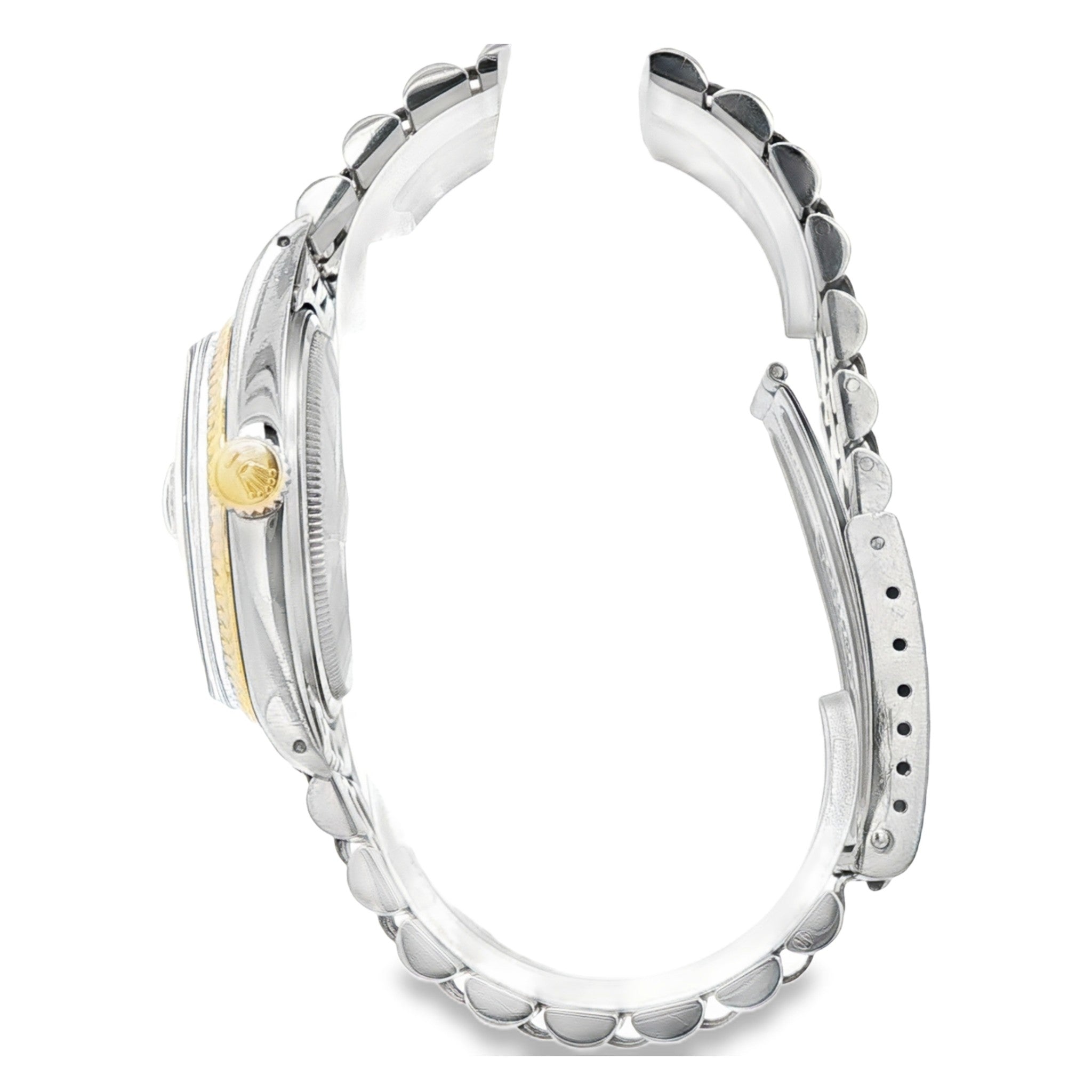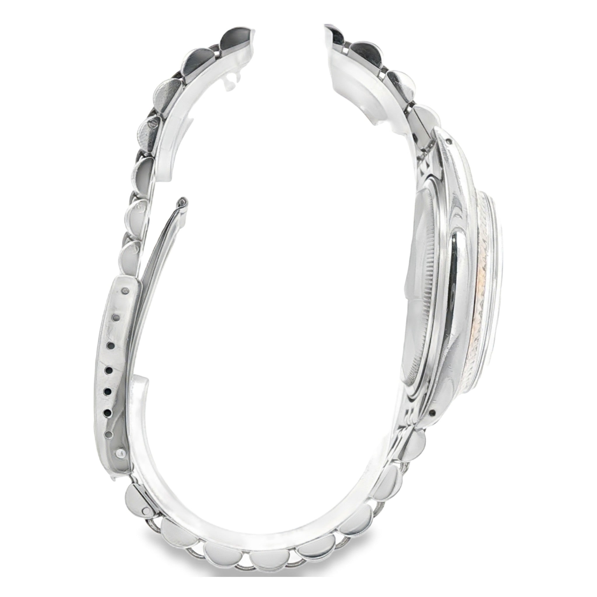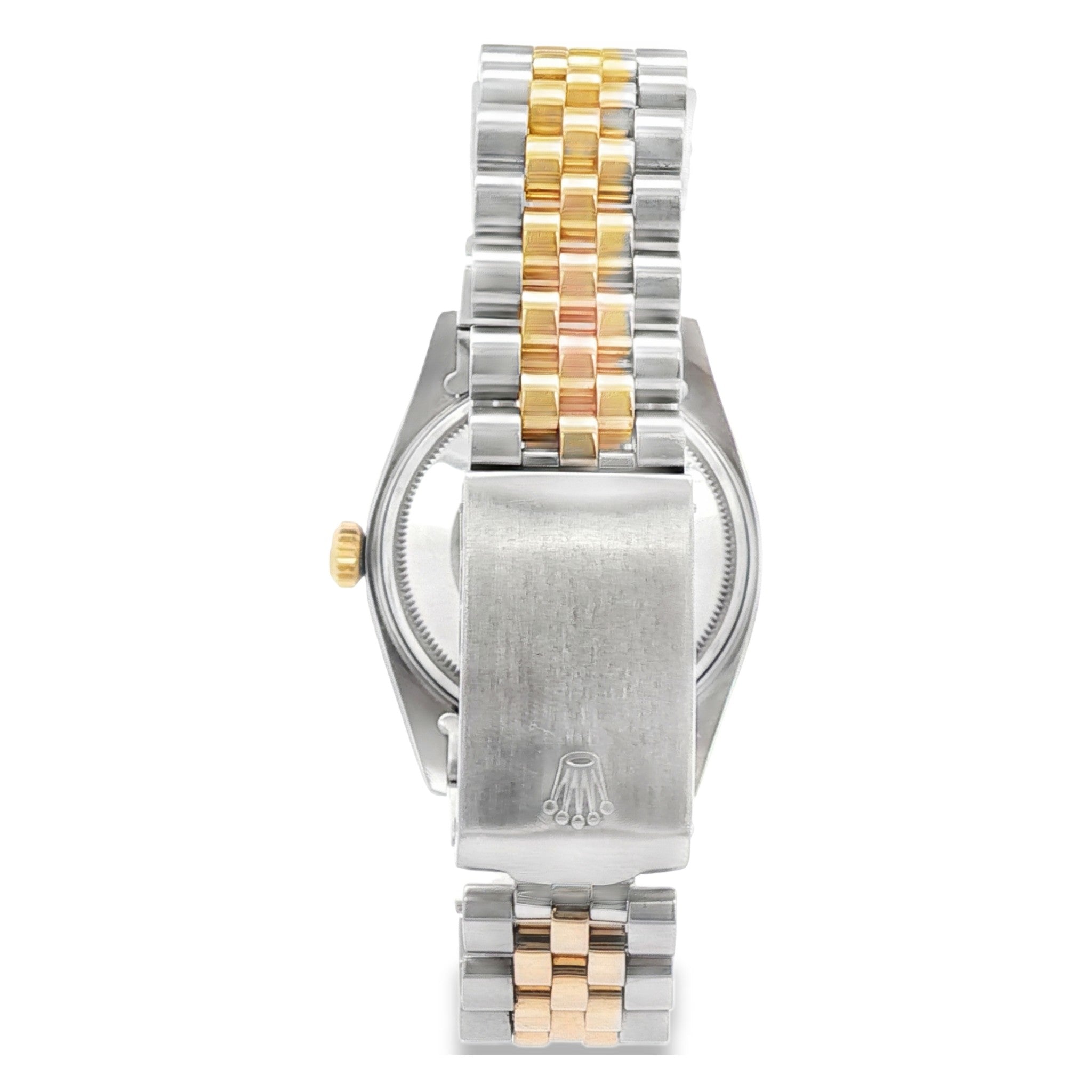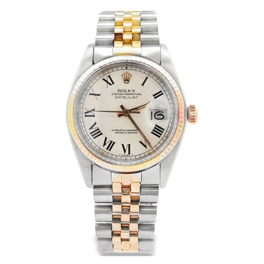 Explore timeless elegance with the Rolex "Buckley" Two Tone Oyster Perpetual Datejust Wrist Watch. This distinguished watch features a unique combination of stainless steel and gold, highlighting its iconic two-tone design. The "Buckley" dial, known for its bold Roman numerals, adds a touch of vintage charm and character. Powered by Rolex's renowned automatic movement, it guarantees precision and reliability. The versatile Oyster case provides rugged durability, making it perfect for any occasion. Elevate your collection with this sophisticated and classic Rolex Datejust—a true masterpiece of craftsmanship.