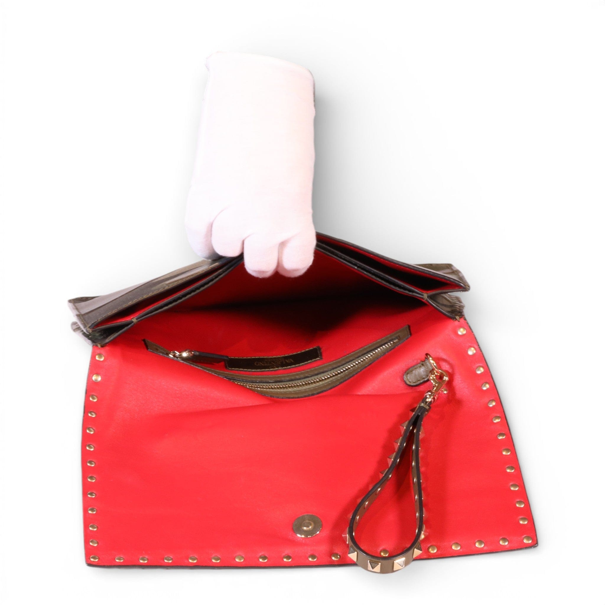 Pre-owned Valentino Garavani Camouflage Rockstud Wristlet Clutch in fair condition. This iconic piece features the brand's signature Rockstud detailing and distinctive camouflage pattern. The clutch shows minor wear consistent with pre-owned status, including light imperfections on both exterior and interior surfaces. Ideal for collectors seeking authentic Valentino craftsmanship at a more accessible price point. Wristlet design offers versatile styling for evening occasions or as a sophisticated carryall.