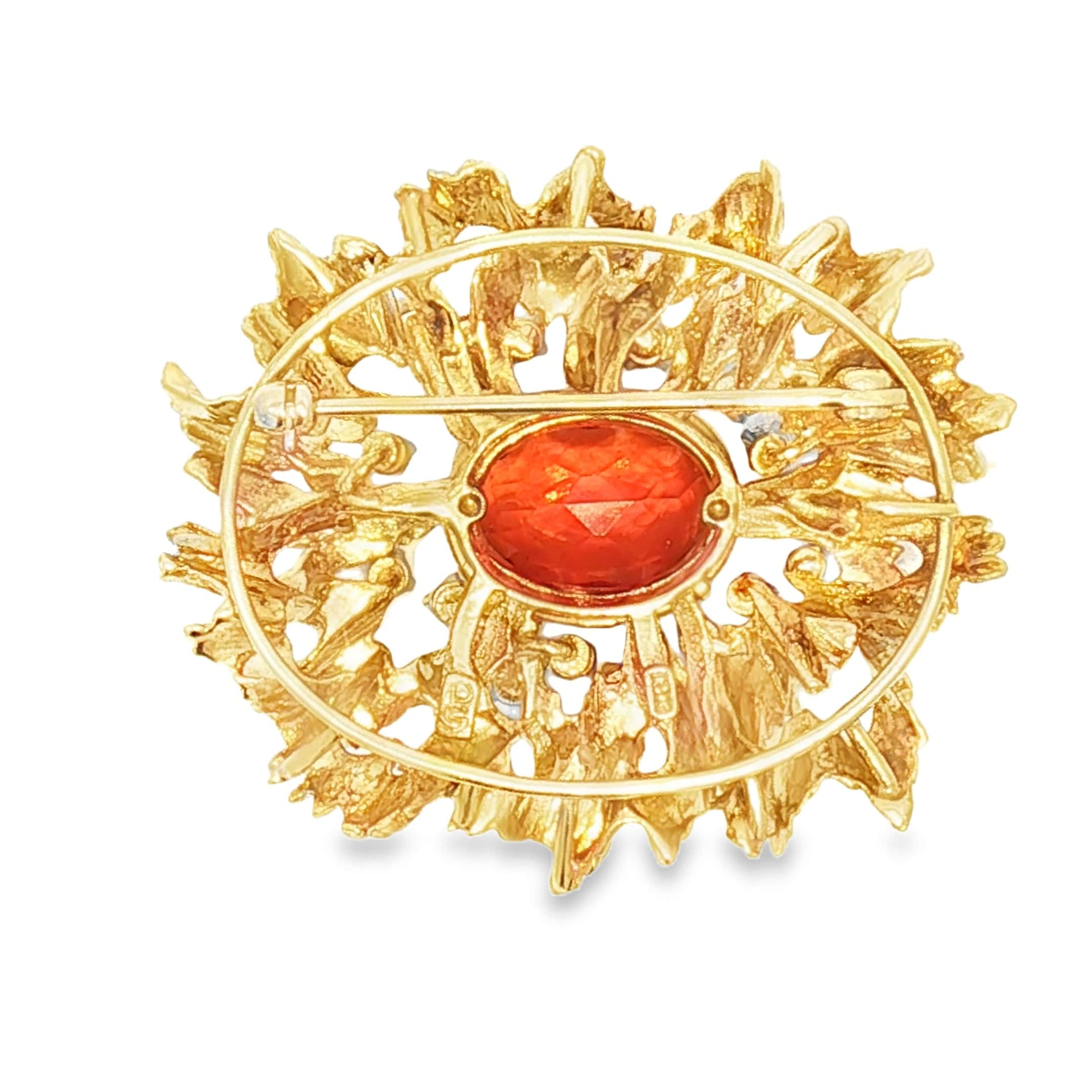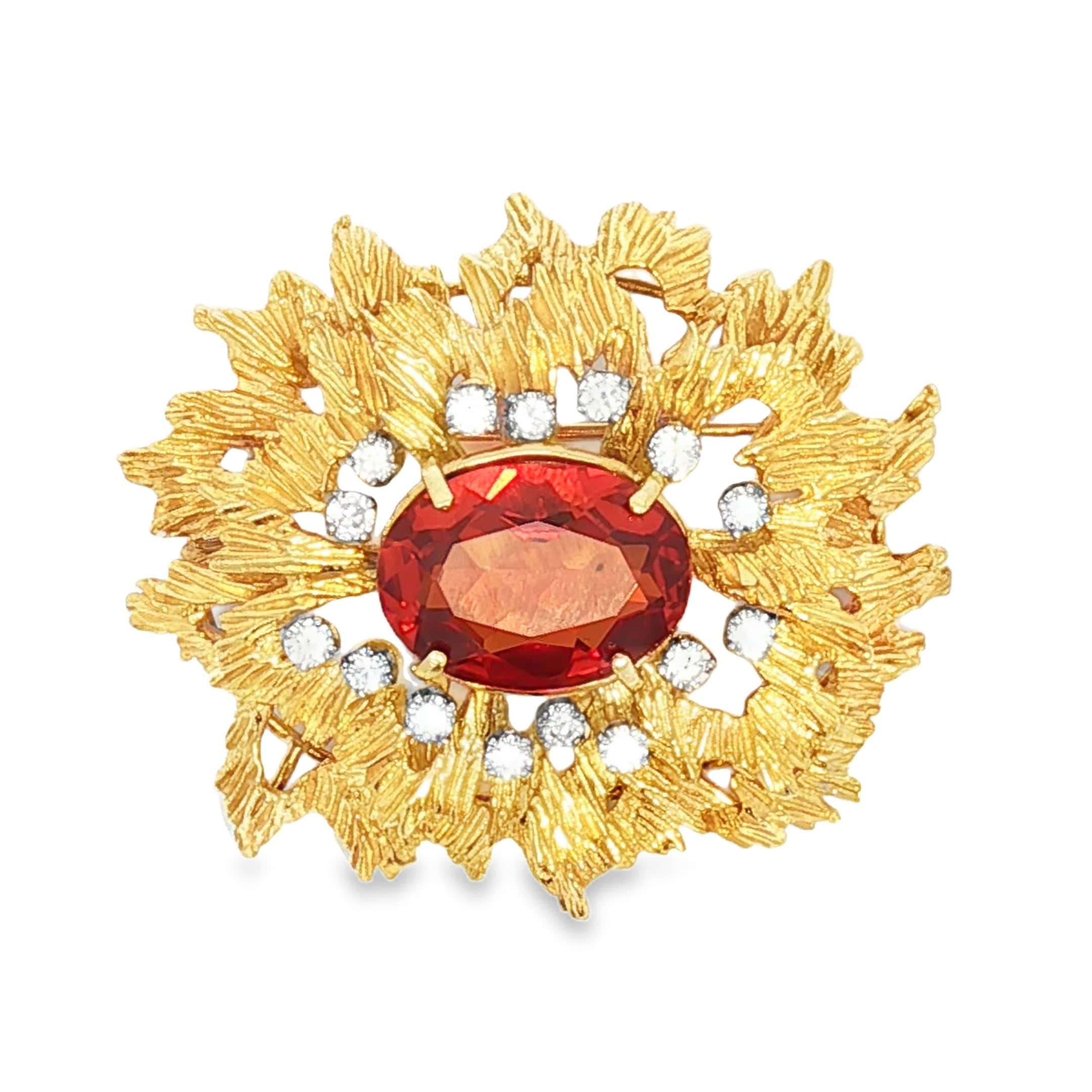 This exquisite vintage brooch showcases a stunning 16.0x11.75mm oval garnet in rich red-orange, complemented by fifteen round brilliant diamonds totaling 0.6ctw. Crafted in 18K gold with a refined 1.5" x 1.75" silhouette and weighing 27.3 grams, this piece exemplifies timeless elegance. The harmonious interplay between the deep, warm garnet and sparkling white diamonds creates a sophisticated aesthetic ideal for both everyday wear and special occasions. A distinguished addition to any fine jewelry collection.